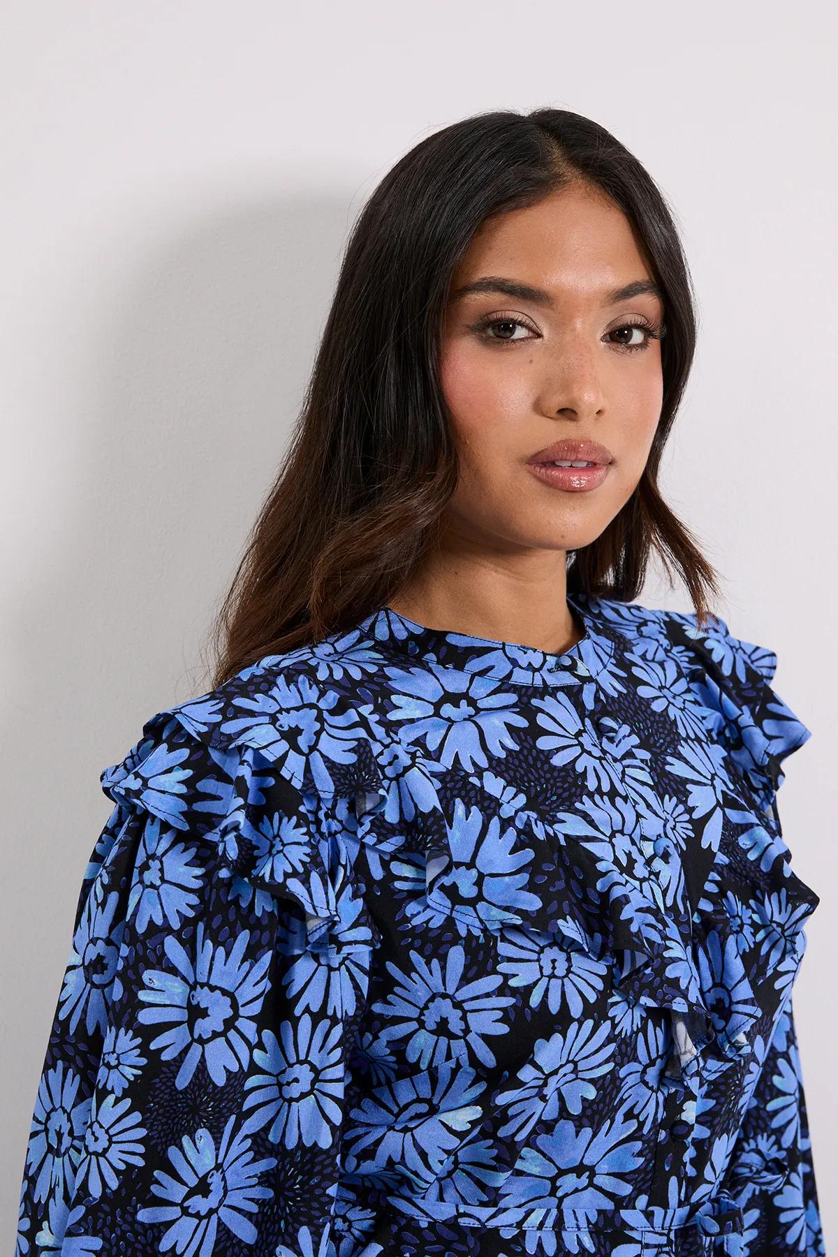 Dresses | Petite Blue Daisy Frill Yoke Belted Mini Shirt Dress | Dorothy Perkins