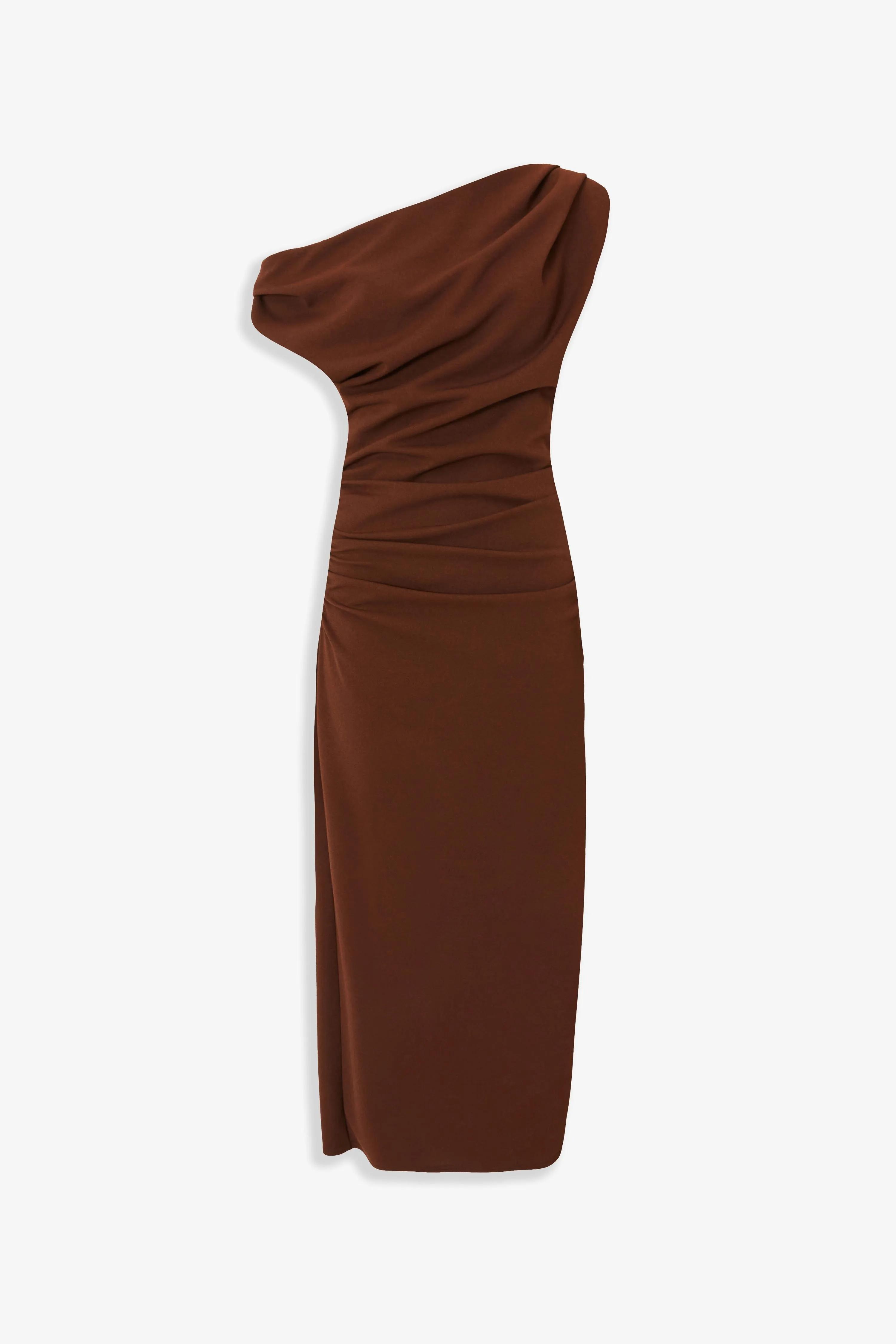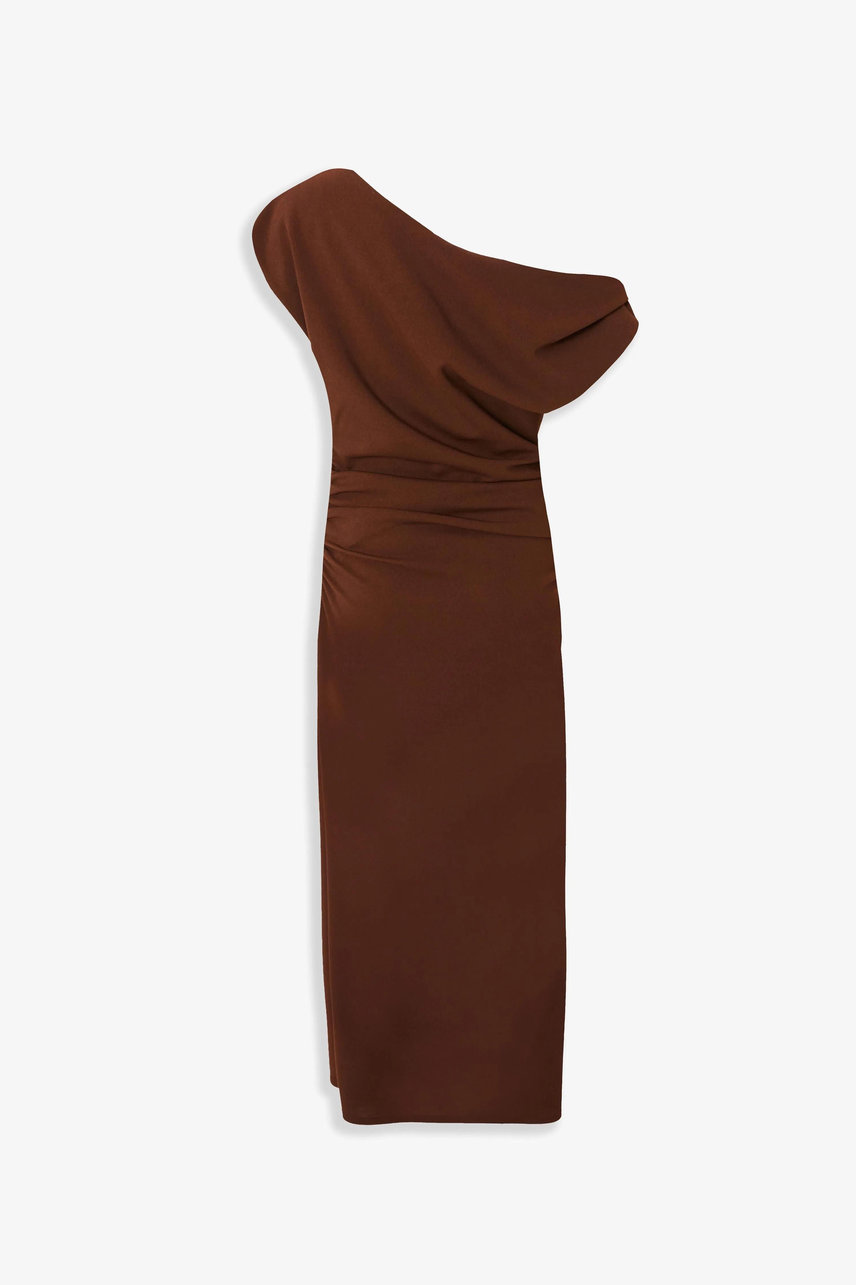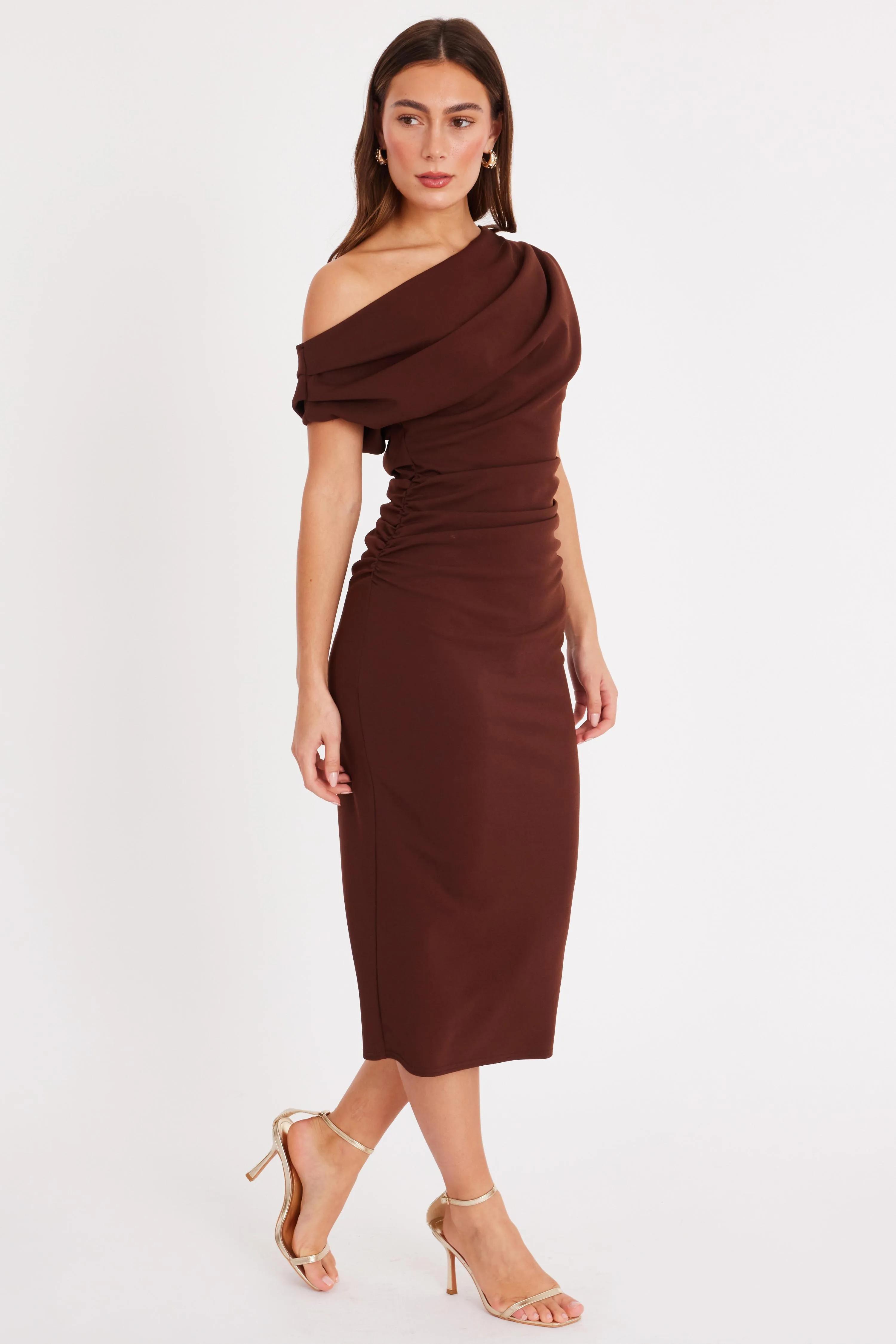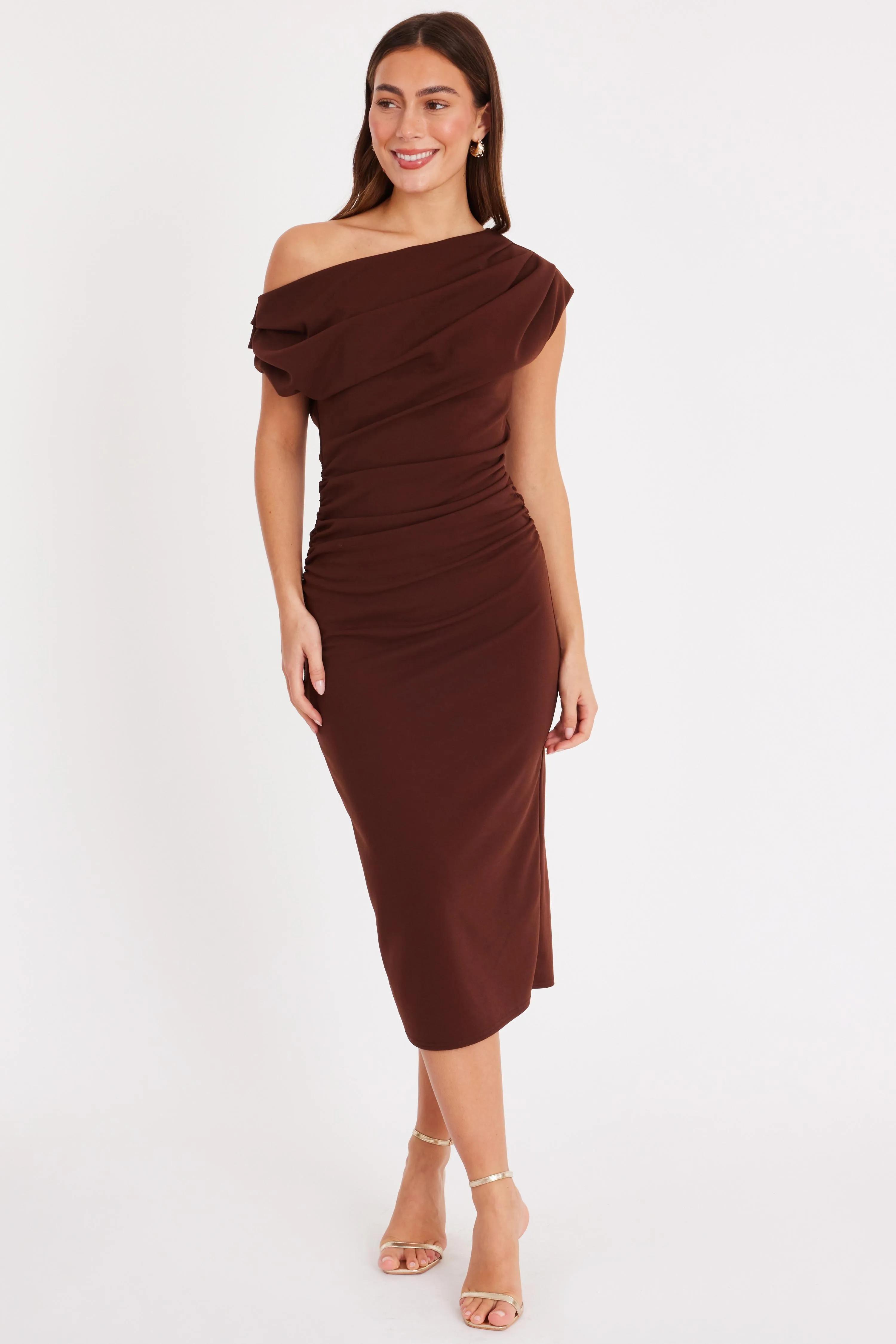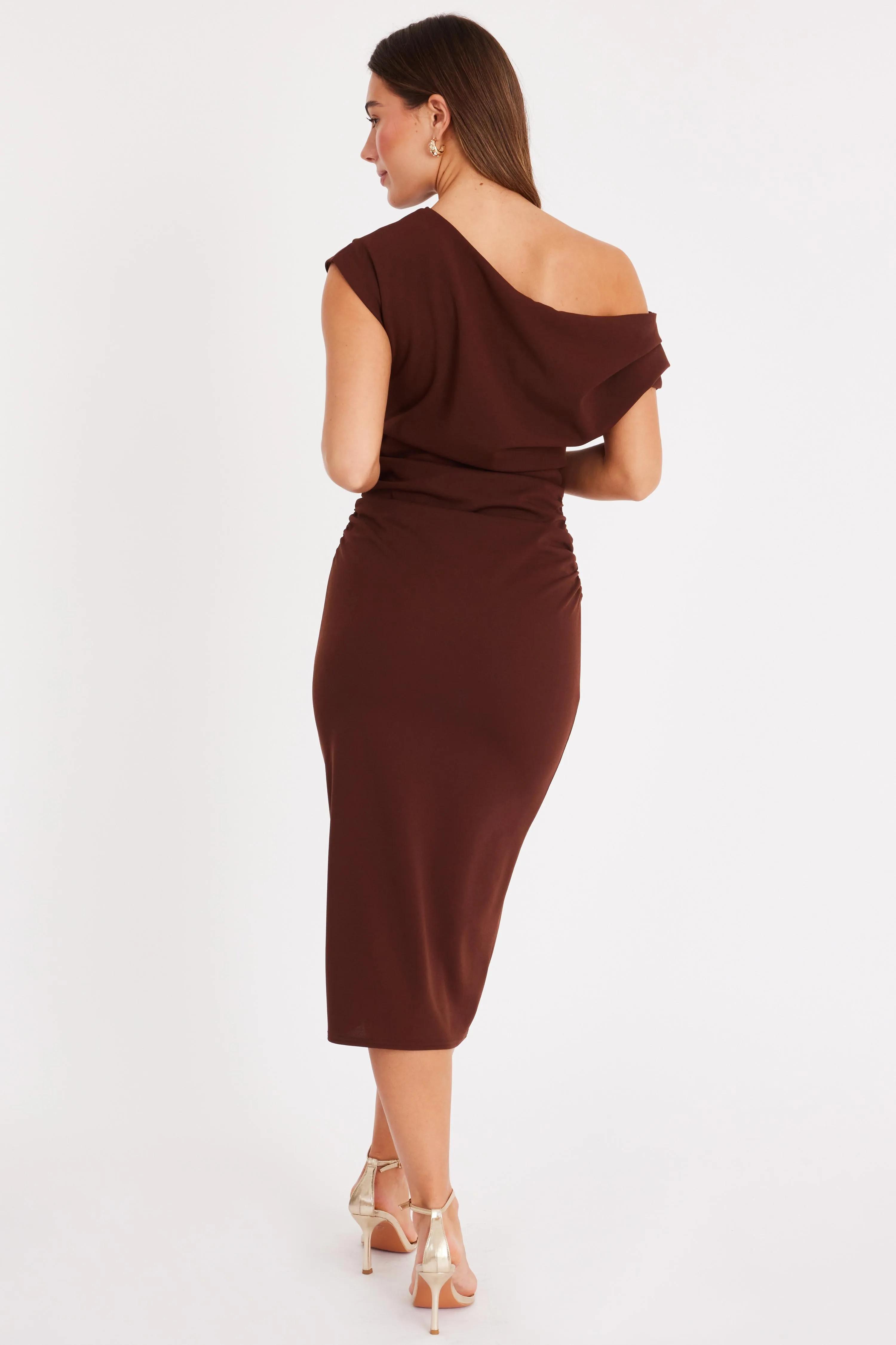 Dresses | Brown Ruched Off Shoulder Midi Dress | Quiz