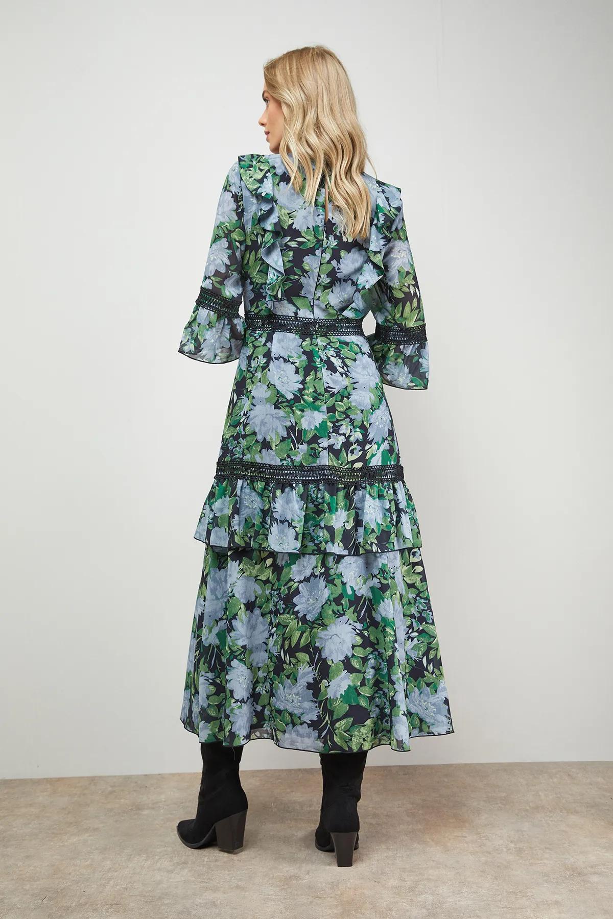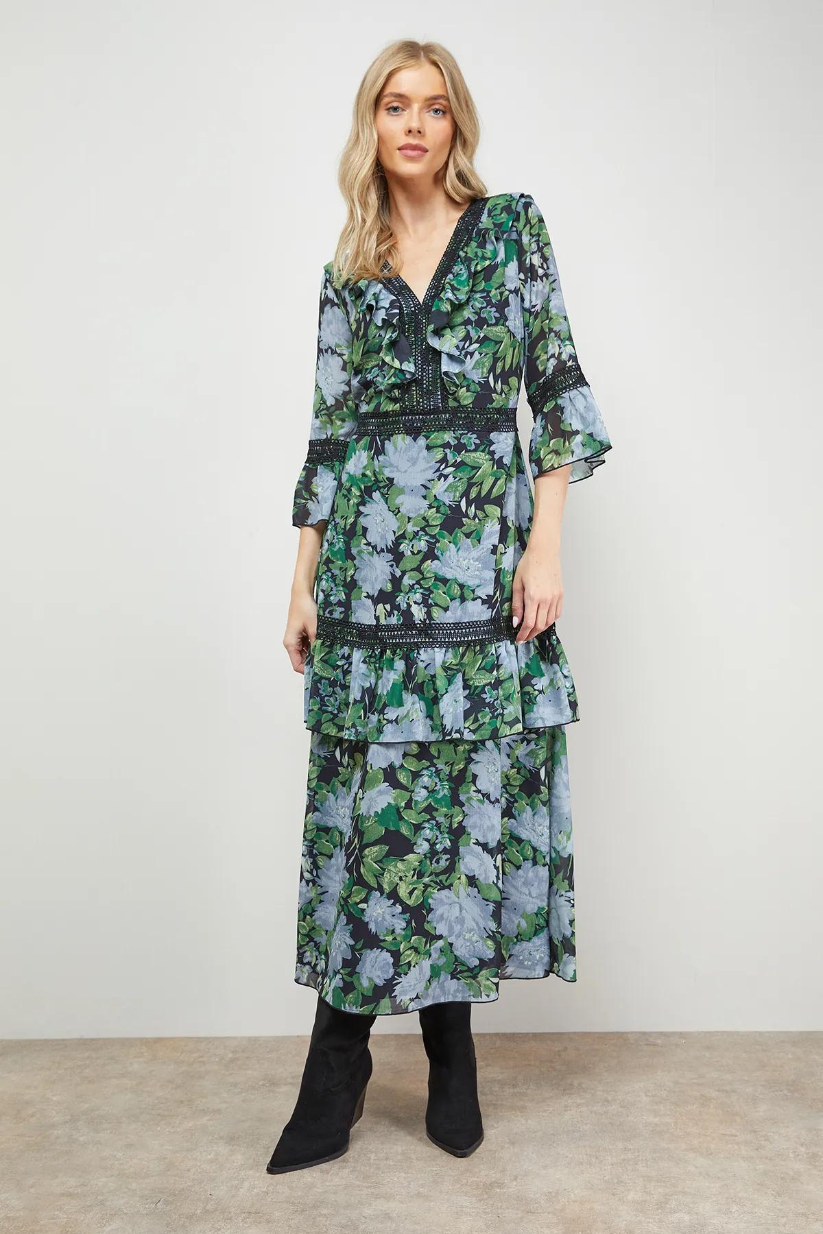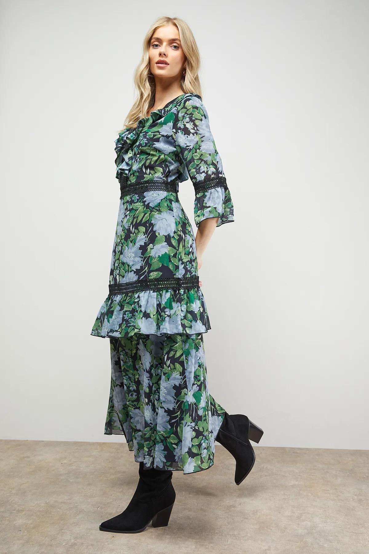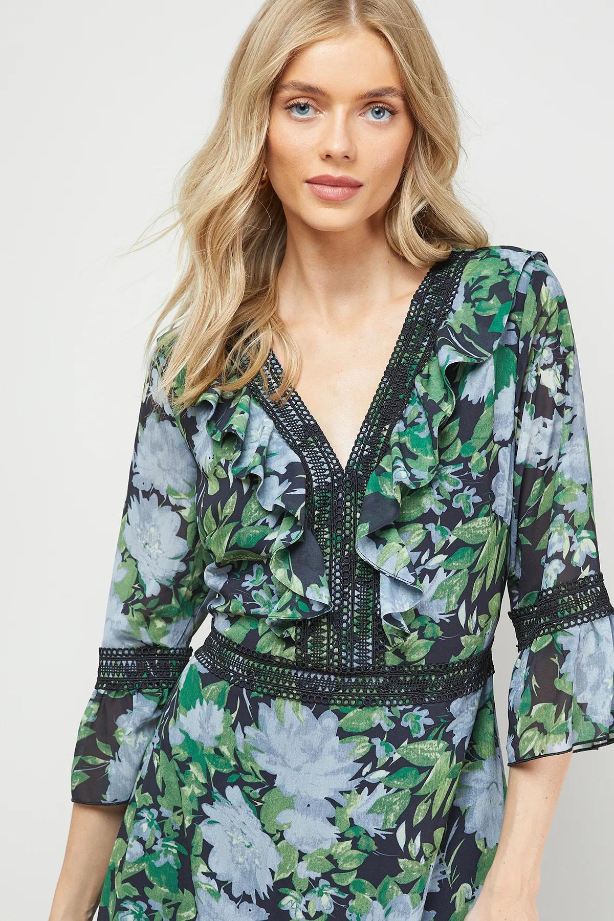 Dresses | Printed Lace Detail V Neck Ruffle Midi Dress | Oasis