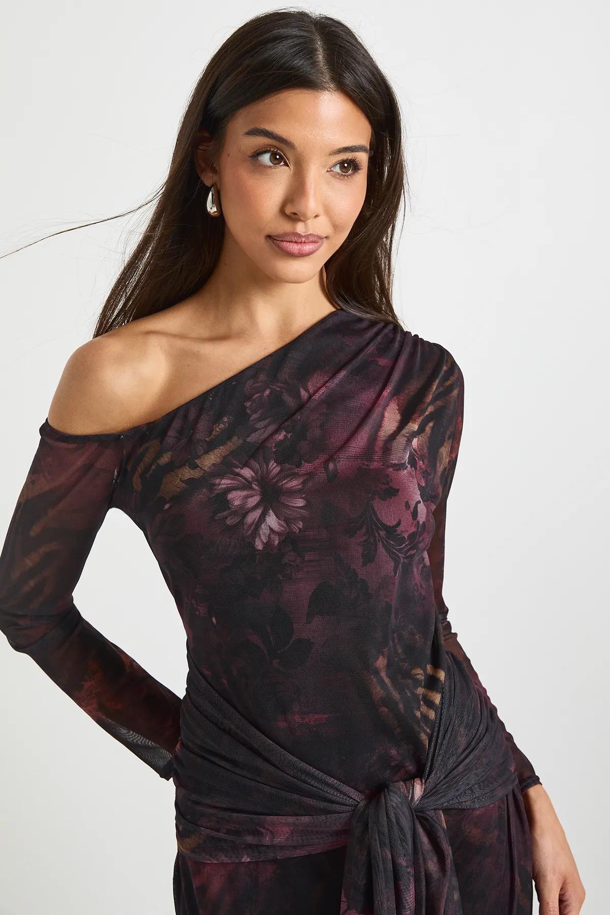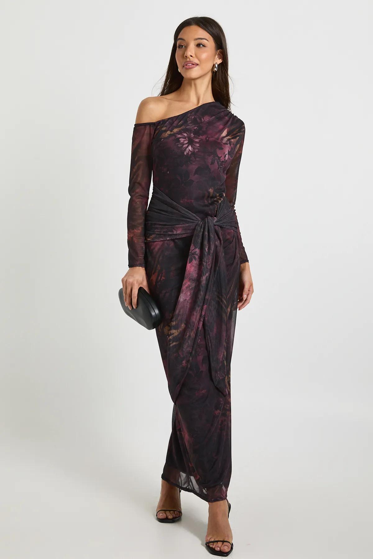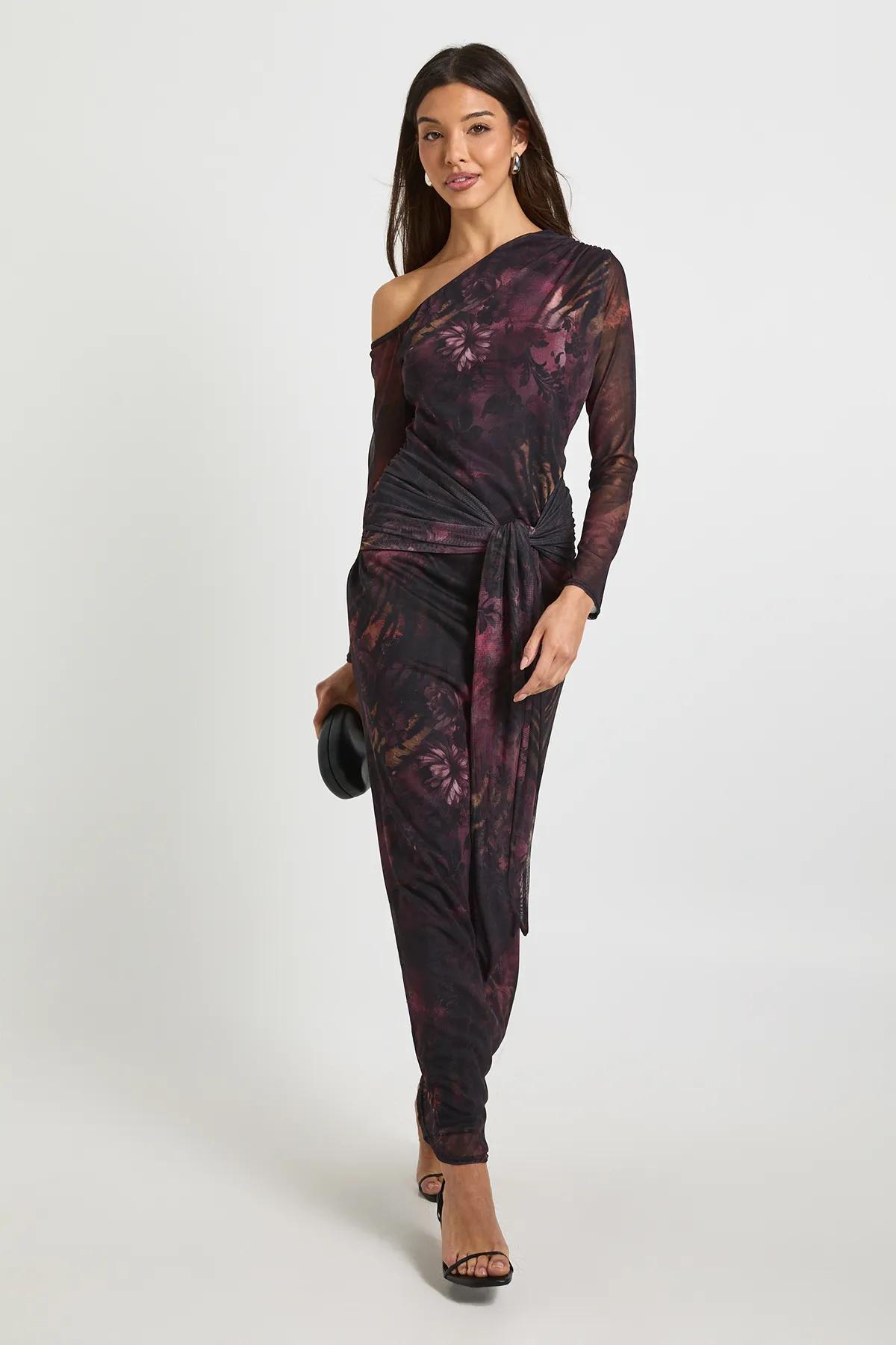 Discover Printed Floral Mesh Asymmetric Tie Waist Maxi Dress available to buy online at boohoo.com. Available with quick delivery and easy return options. Shop now!