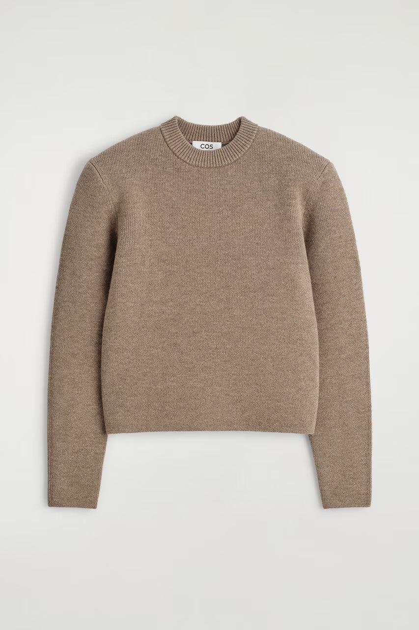 This season, classic knitwear is renewed with structural appeal. This refined jumper is crafted from luxuriously soft merino and designed with padded shoulders, a crew neckline and ribbed trims.\u0026nbsp;\u0026nbsp;Regular fitThis product contains Responsible Wool Standard TE-00047206 (RWS) wool fibre from farms certified to animal welfare and land-management requirements\u0026nbsp;Shell: 100% Merino wool. Excluding trims / Dry clean\u0026nbsp;Back length of size S is 54cm / Model wears a size S