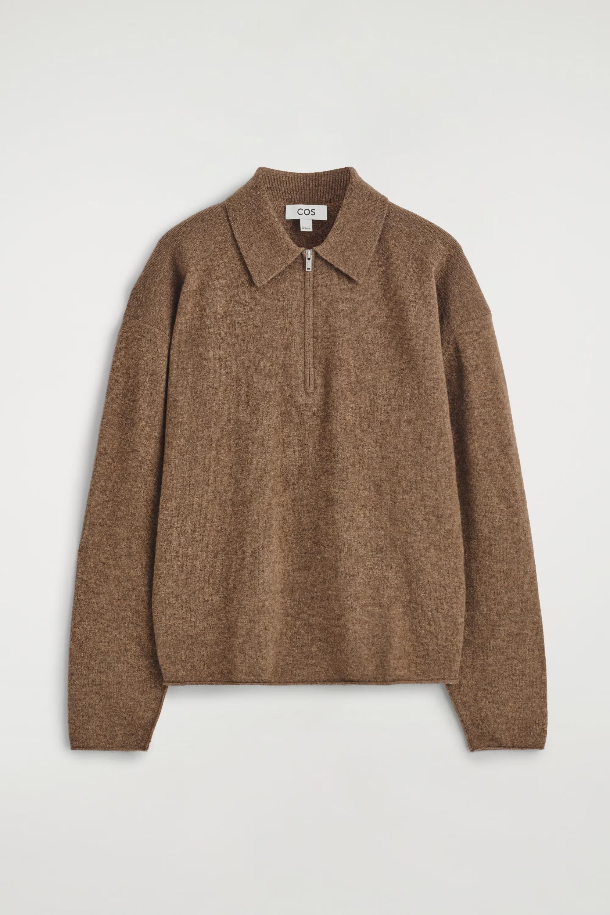 The COS designers reimagine the classics with a studied design ethos. Rendered in a rich burgundy tone, this zip-up polo shirt is made from merino wool and shokay yak and designed with double-knitted shoulders to create a softened, 80's-inspired shape. Layer it over tees or tanks.\u0026nbsp;Relaxed fitZip closureThis product contains Responsible Wool Standard TE-00047206 (RWS) wool fibre from farms certified to animal welfare and land-management requirements\u0026nbsp;Shell: 50% Merino wool, 50% Shokay yak. Excluding trims / Machine wash\u0026nbsp;Back length of size S is 60cm / Model wears a size S