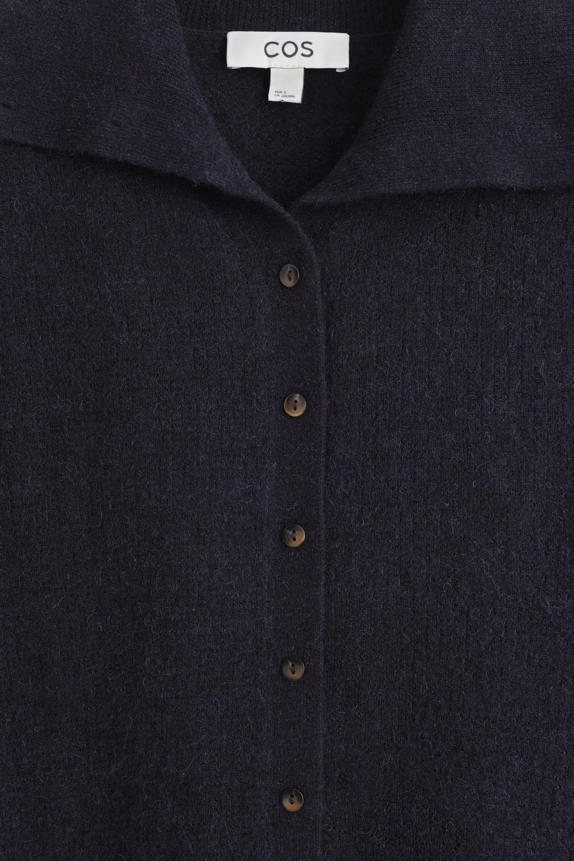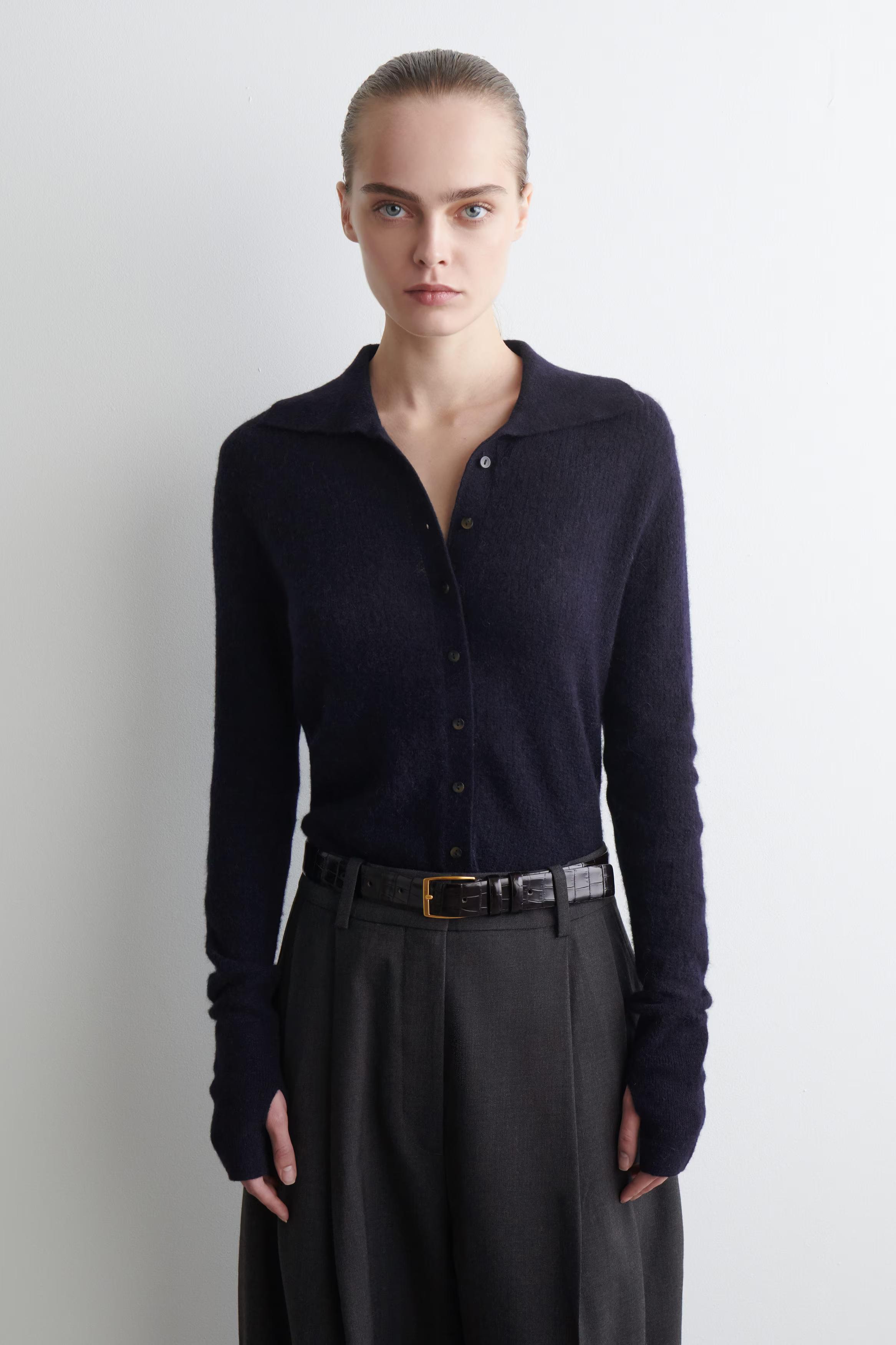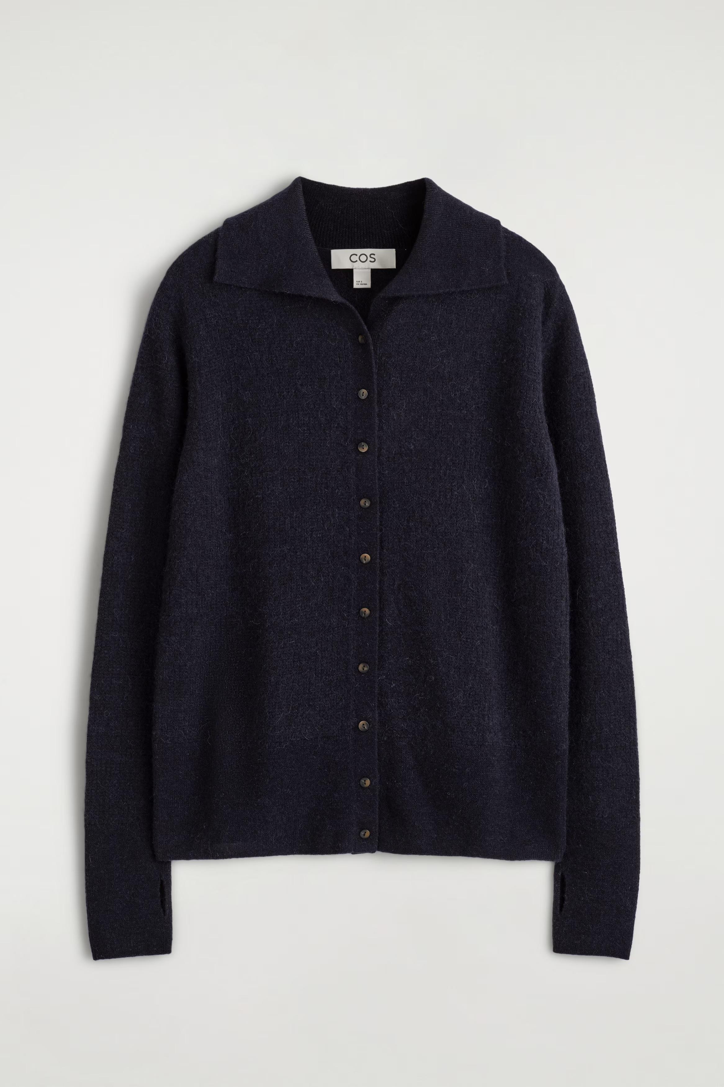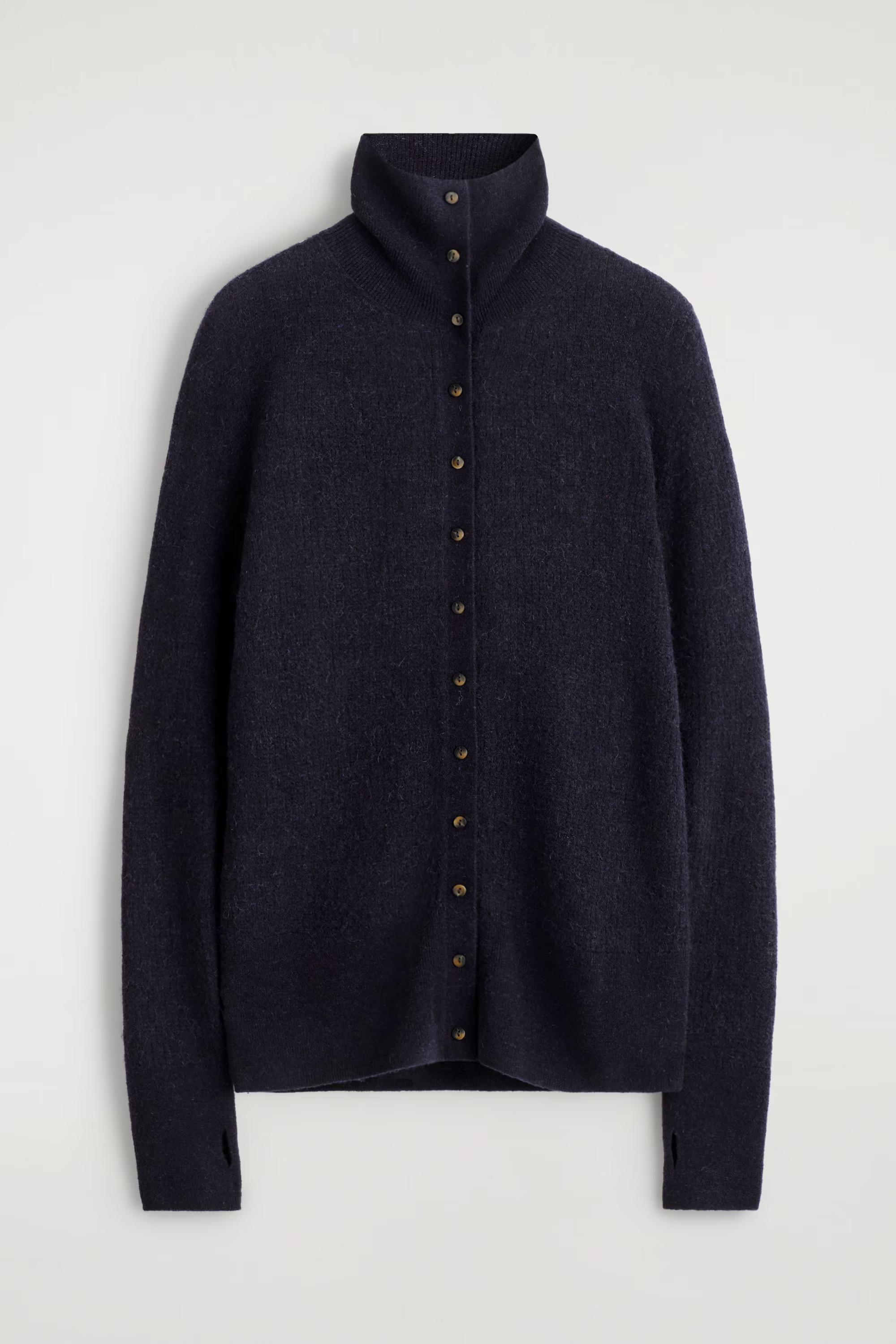 The Autumn Winter 2025 collection is underscored by ski-inspired underpinnings. Rendered in a brown-m\u0026eacute;lange tone, this cardigan is knitted with luxuriously tactile alpaca and merino wool and detailed with a high neckline, thumbhole cuffs and finely ribbed trims. Style it as a set with the matching leggings.\u0026nbsp;Regular fitButton closureThis product contains Responsible Alpaca Standard TE-00047206 (RAS) alpaca fibre from farms certified to animal welfare and land-management requirements\u0026nbsp;Shell: 35% RAS alpaca, 35% Merino wool, 30% Recycled polyamide (Recycled nylon). Excluding trims / Dry clean\u0026nbsp;Back length of size S is 64cm / Model wears a size S