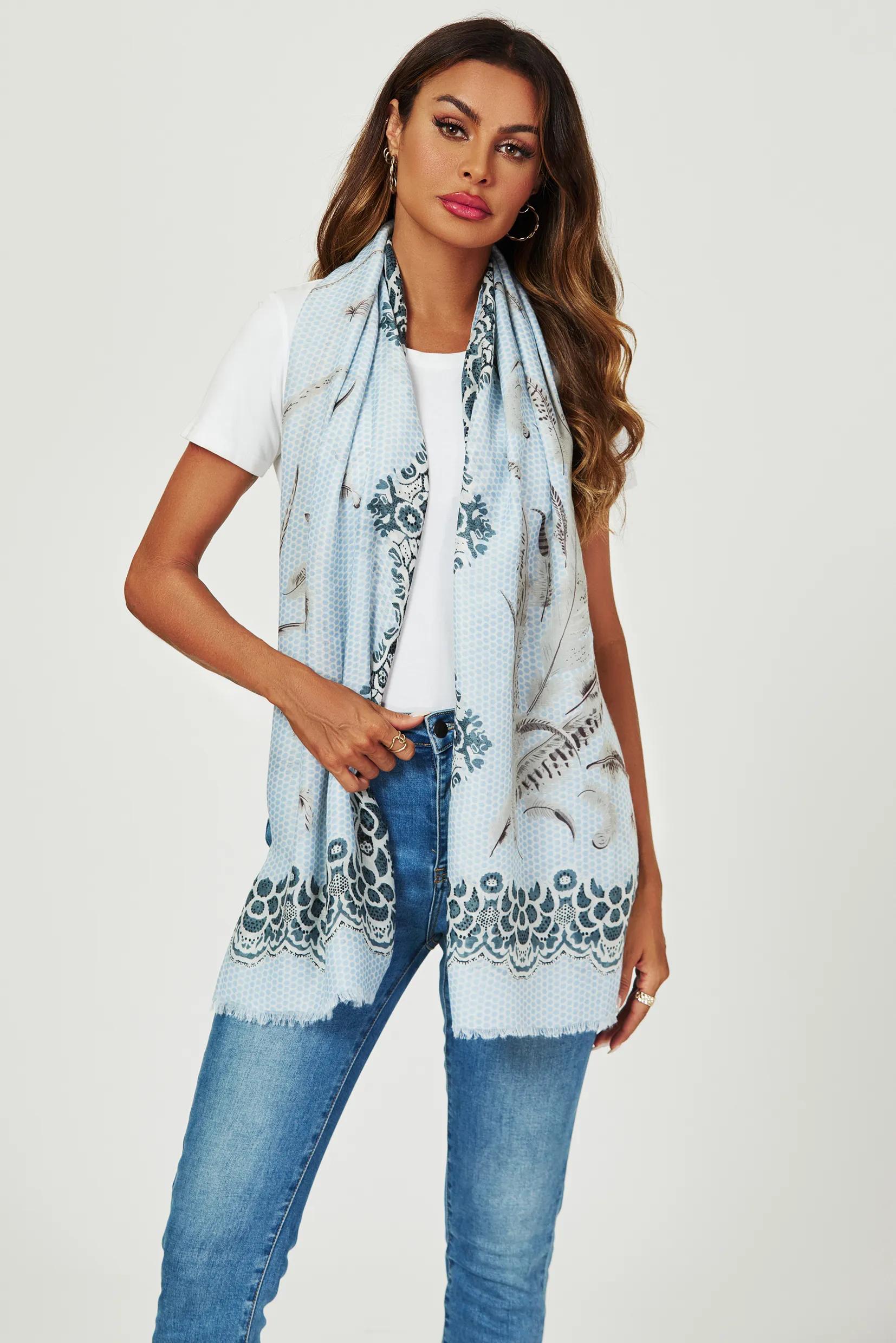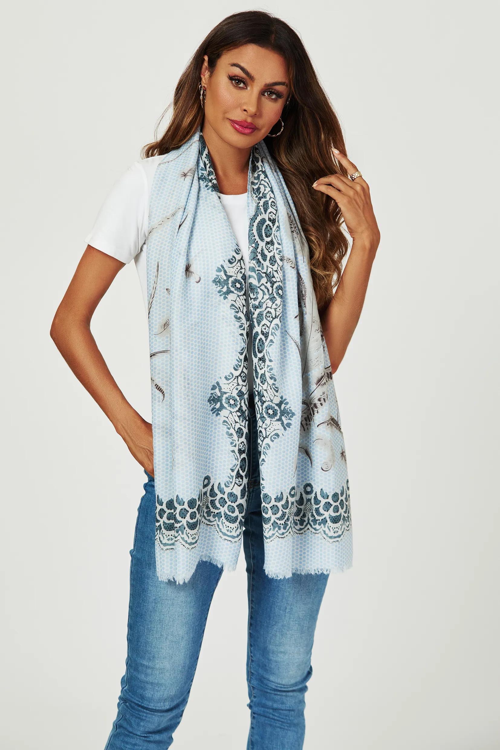Gloves & Scarves | Geometric & Feather & Lace Print Scarf In Blue | FS Collection