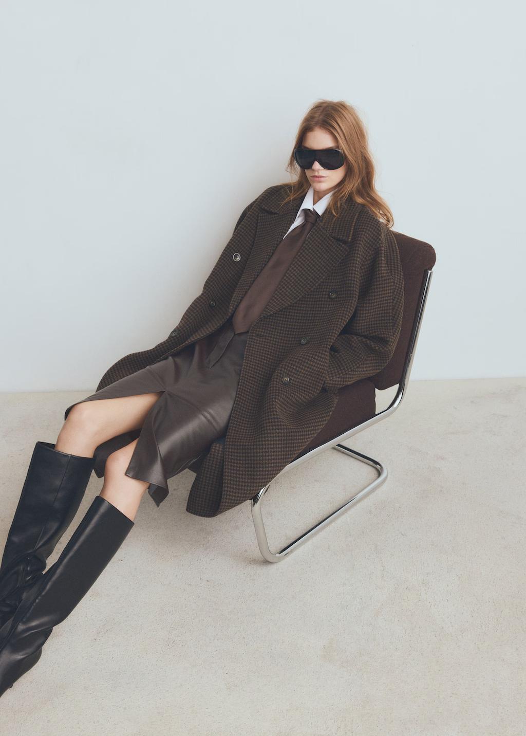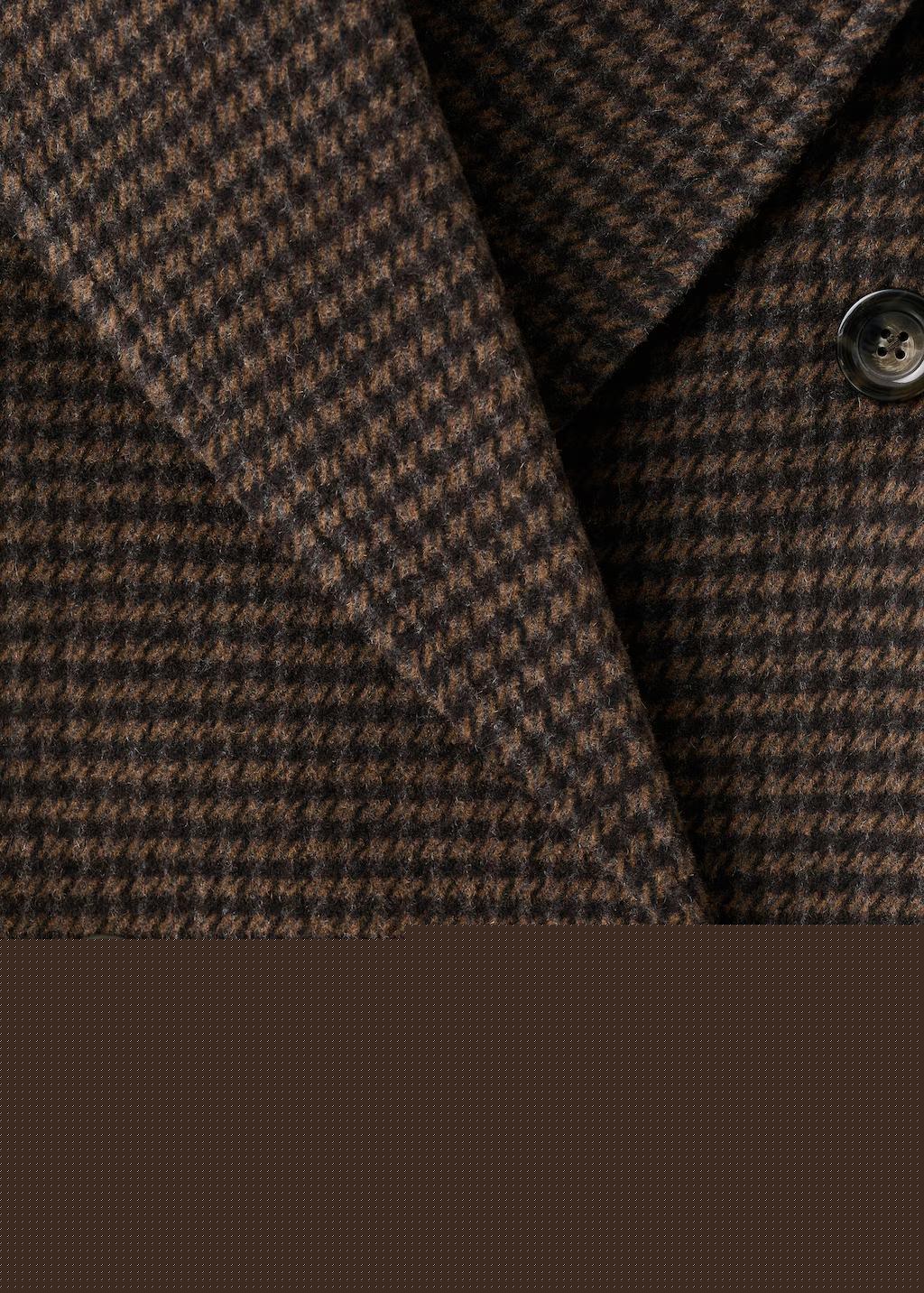 Tejido mezcla de lana. Diseño oversize. Diseño largo. Estampado de micro pata de gallo. Cuello pico con solapa. Solapas con muesca. Manga larga. Dos bolsillos de ribete laterales. Cierre de doble botonadura. Forro interior