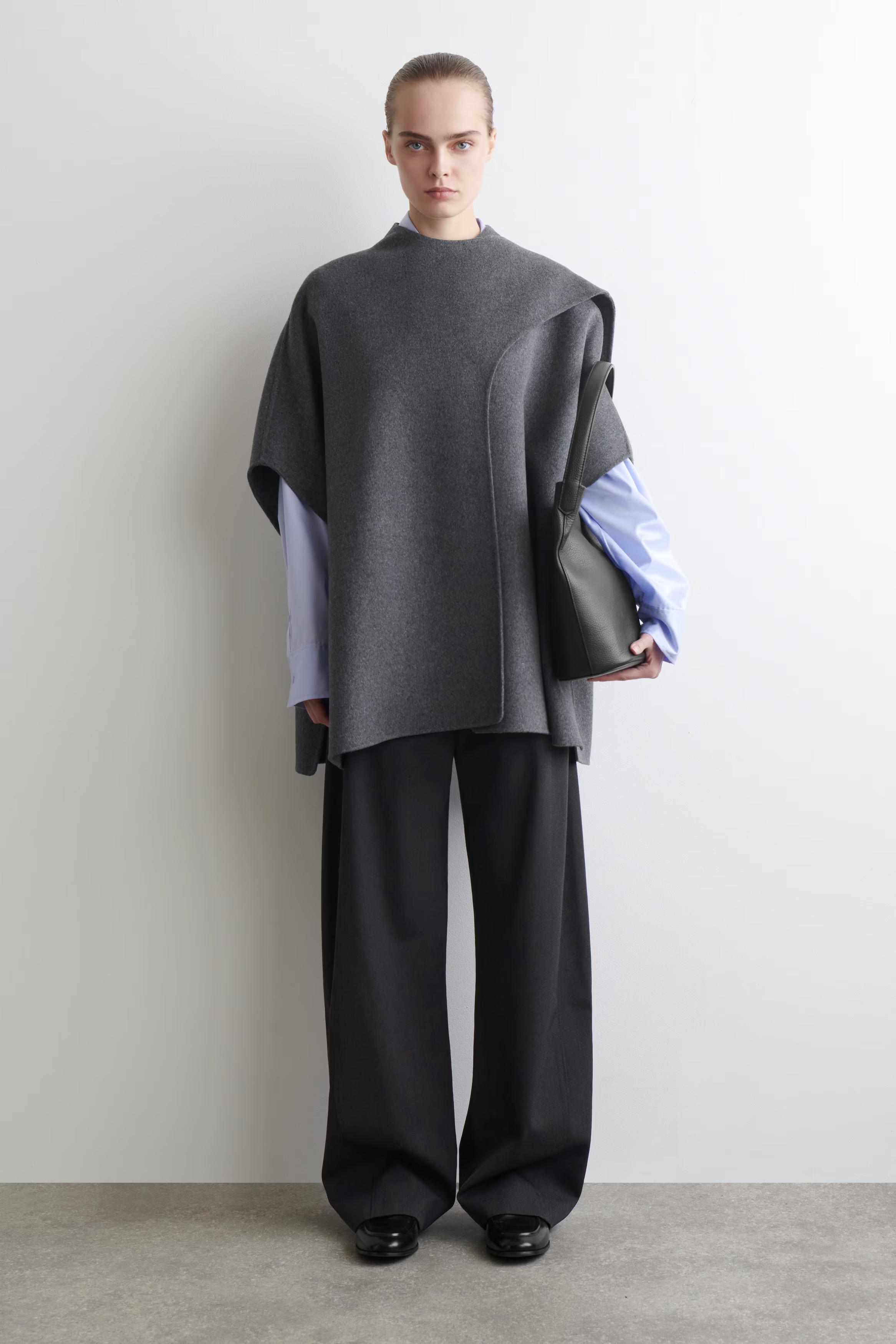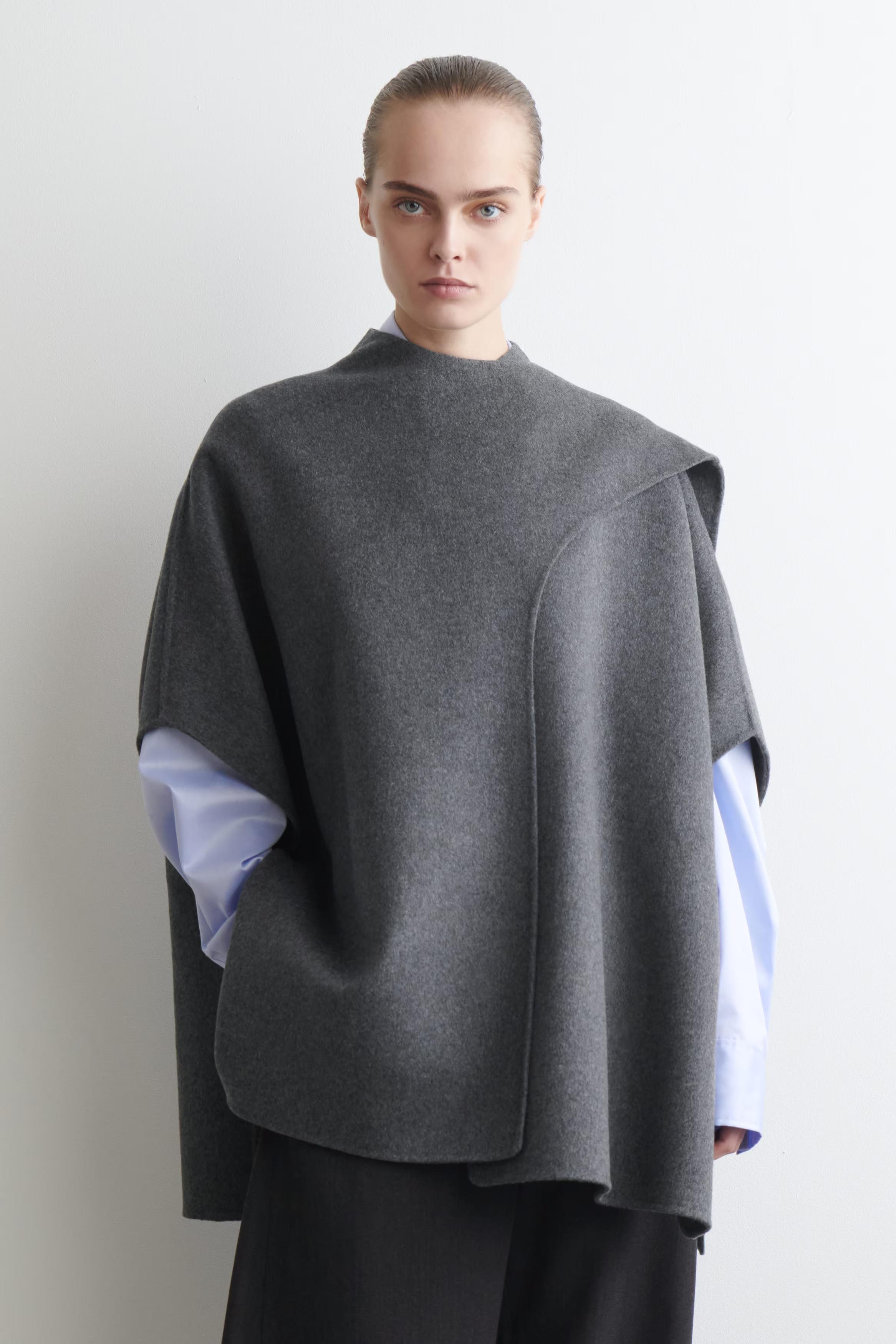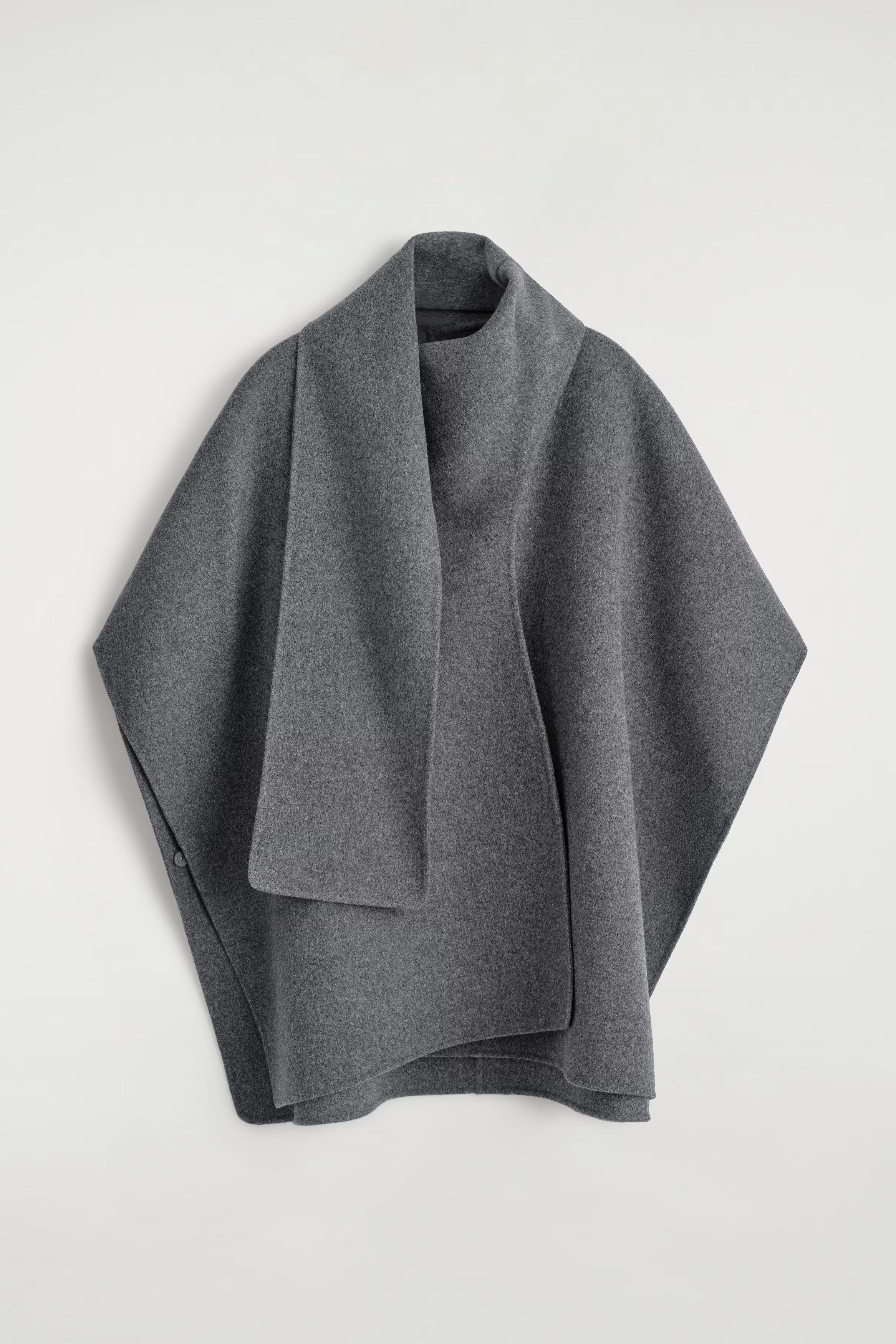 This sophisticated cape channels the effortless appeal of autumn/winter styling. It's crafted from a merino wool blend that's double-faced for a premium handle and designed with a tonal scarf that can be styled around the neck or draped over one shoulder. The oversized silhouette lends itself to layering.\u0026nbsp;Oversized fitPress-stud closureThis product contains Responsible Wool Standard TE-00047206 (RWS) wool fibre from farms certified to animal welfare and land-management requirements\u0026nbsp;Shell: 60% Merino wool, 40% TENCEL\u0026trade; Lyocell. Excluding trims / Dry clean\u0026nbsp;Back length is 77.8cm