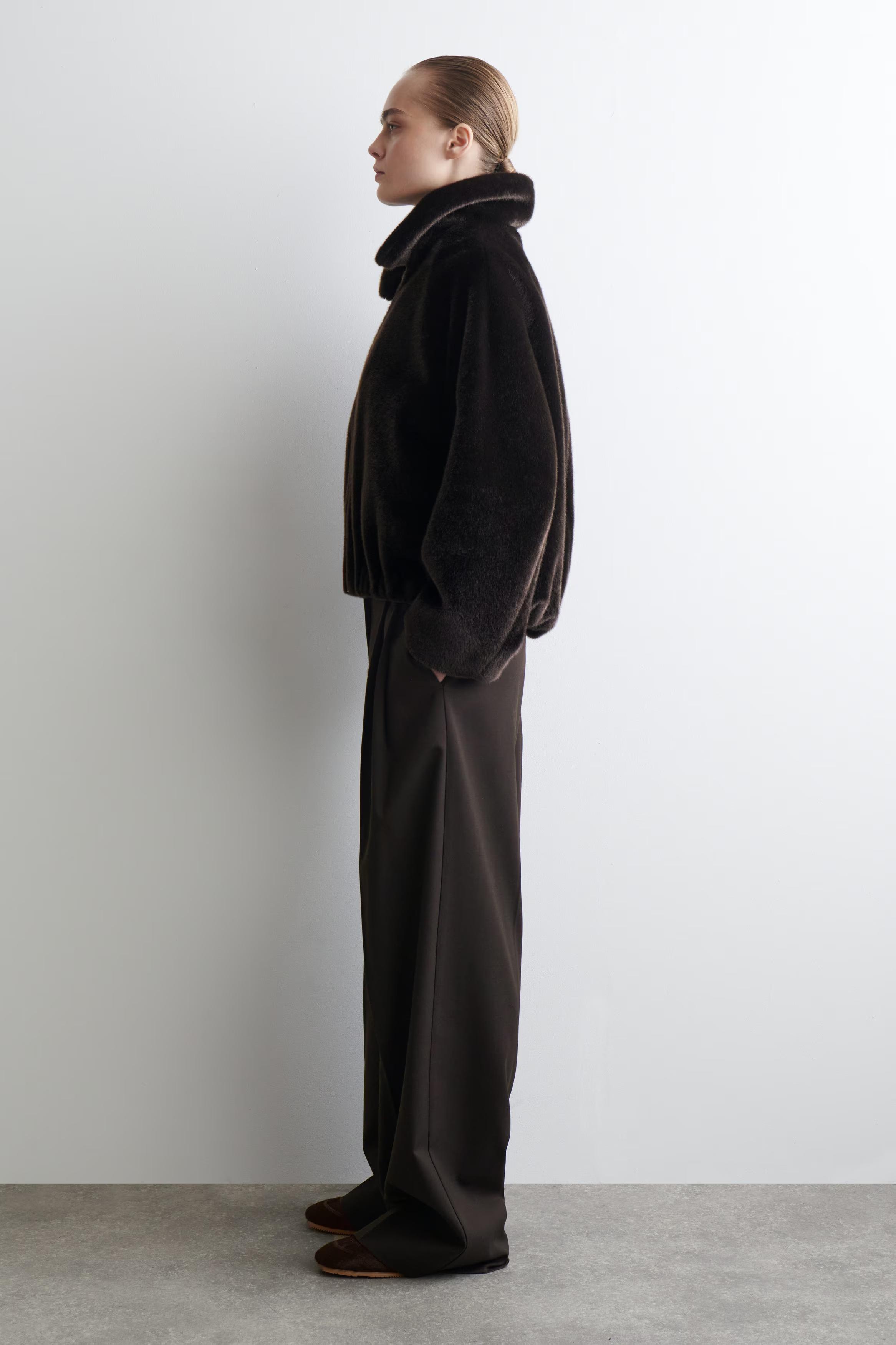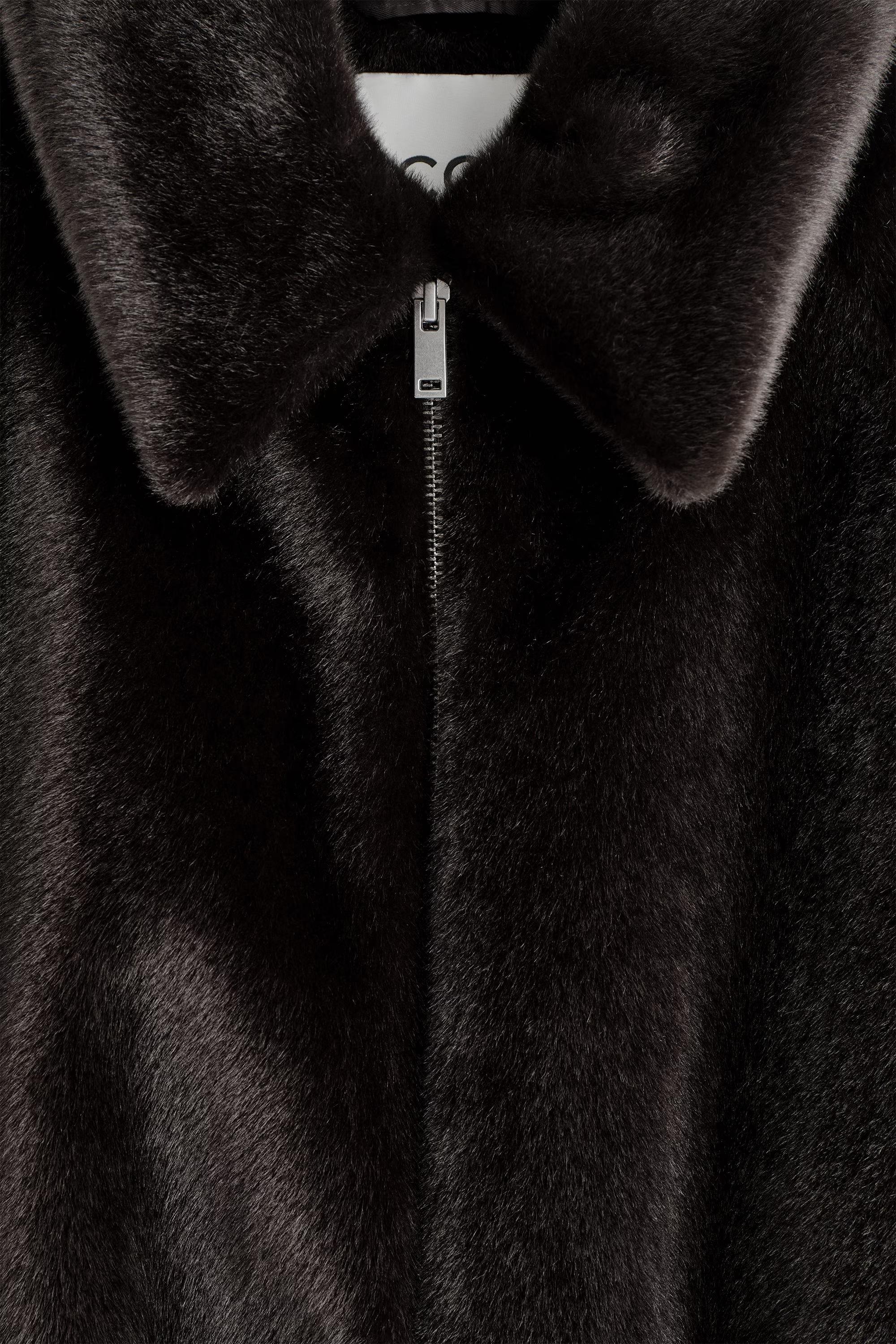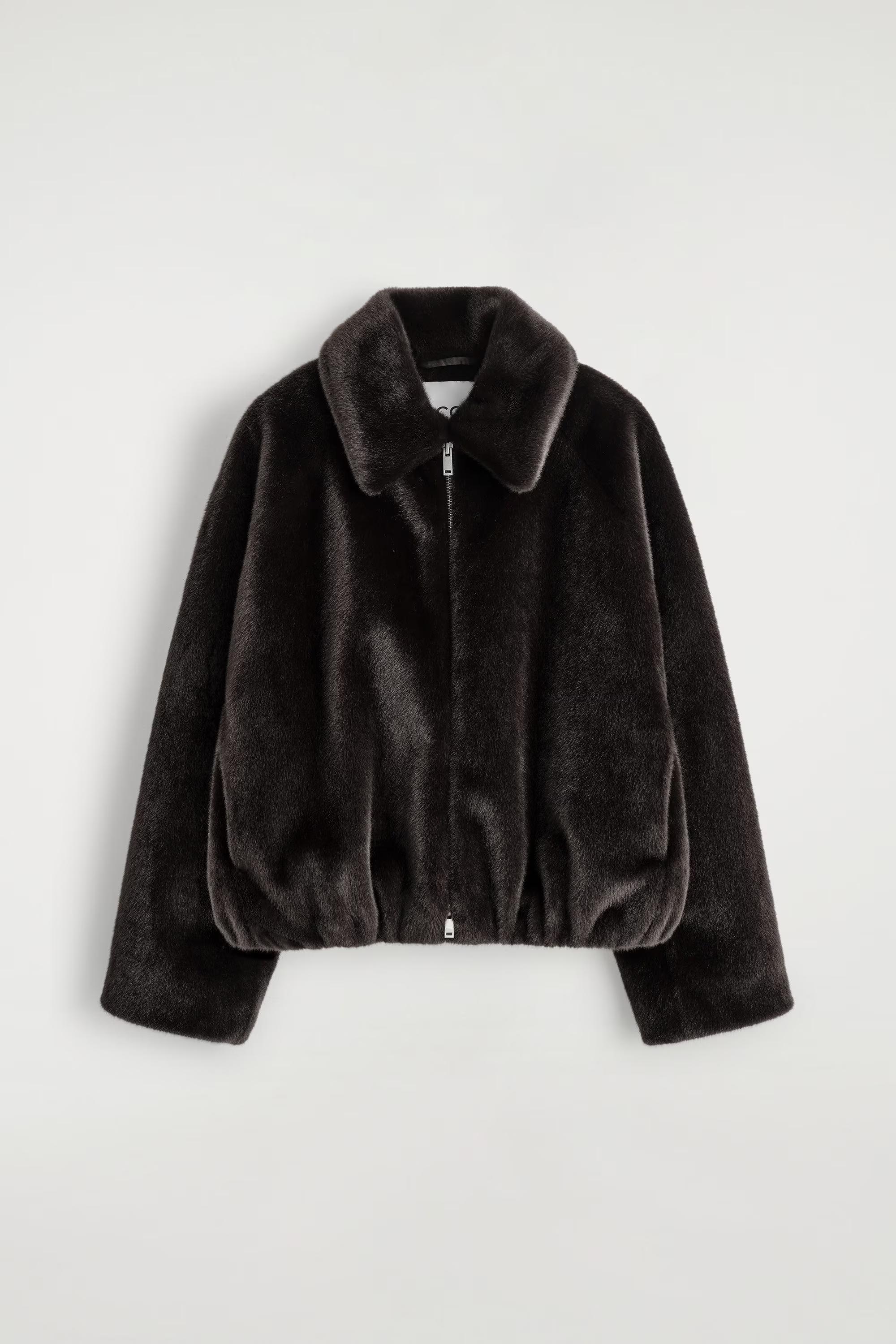The COS outerwear collection is defined by inviting textures and a rich colour palette. This modern jacket is crafted from luxuriously tactile fur-effect material and designed with a pointed collar, curved silhouette and side pockets. The double-ended zip lends itself to layering, while the deep-chocolate tone will naturally slot into the winter wardrobe.\u0026nbsp;Regular fitTwo-way zip closureRecycled polyester is polyester made from PET bottles or end-of-life textile waste. The PET bottles or textile waste is mechanically recycled and processed into new yarn\u0026nbsp;Shell: 100% Recycled polyester. Lining: 100% Viscose. Pocket lining: 100% Cotton. Excluding trims / Machine wash\u0026nbsp;Back length of size EU 36 is 62cm / Model wears a size EU 36