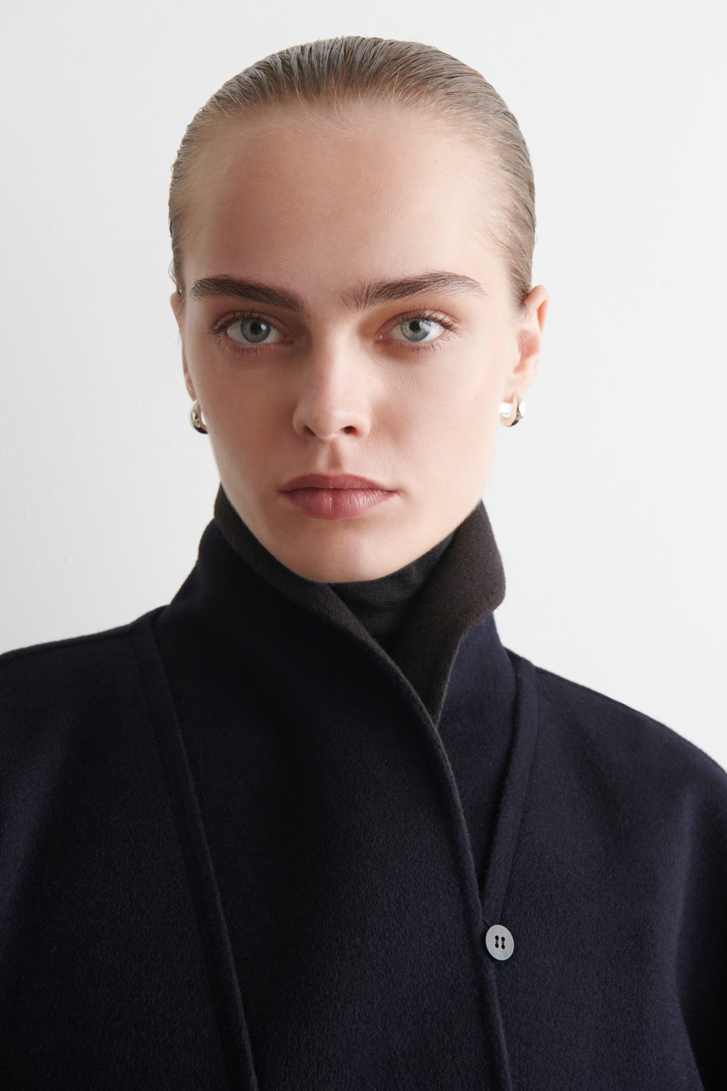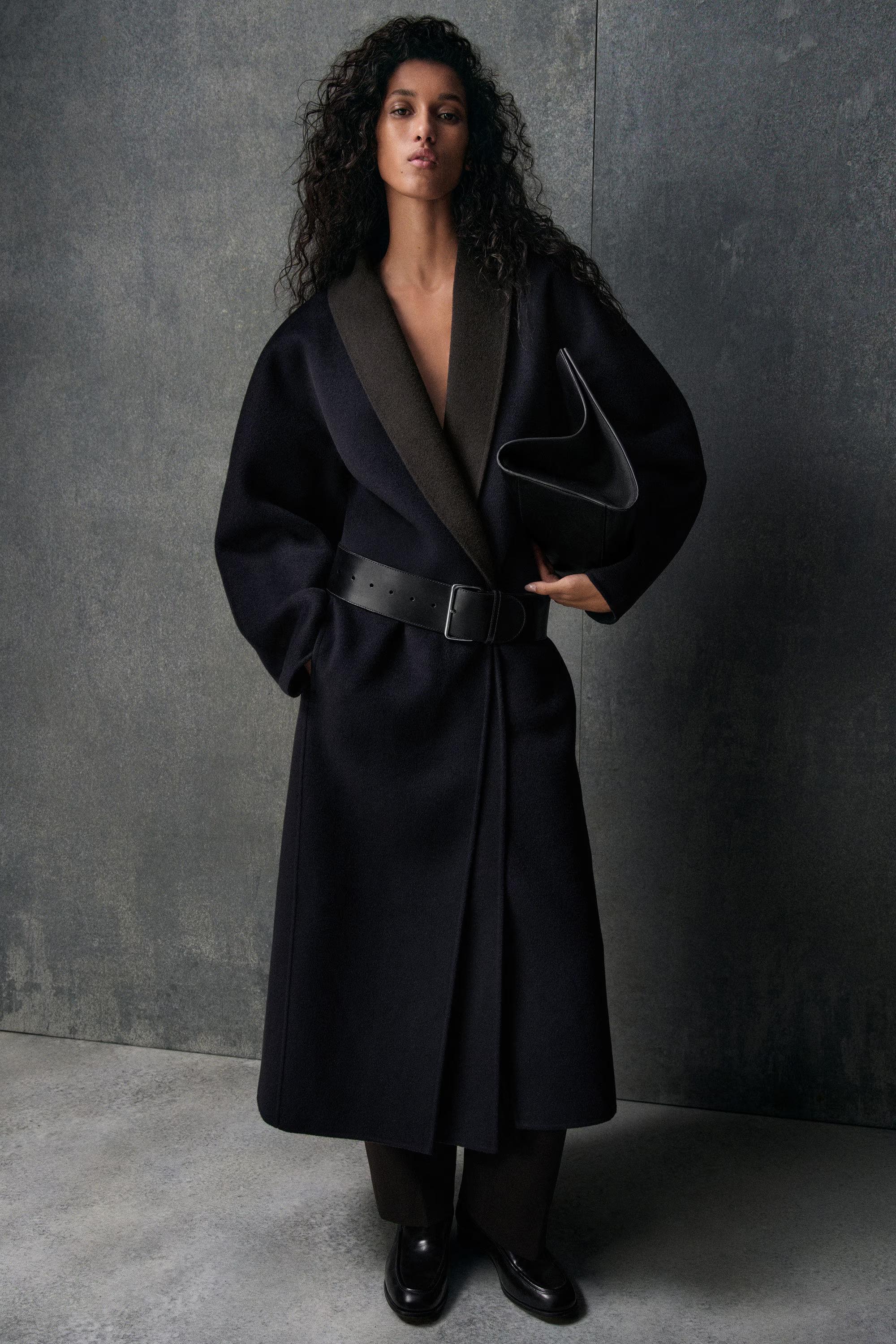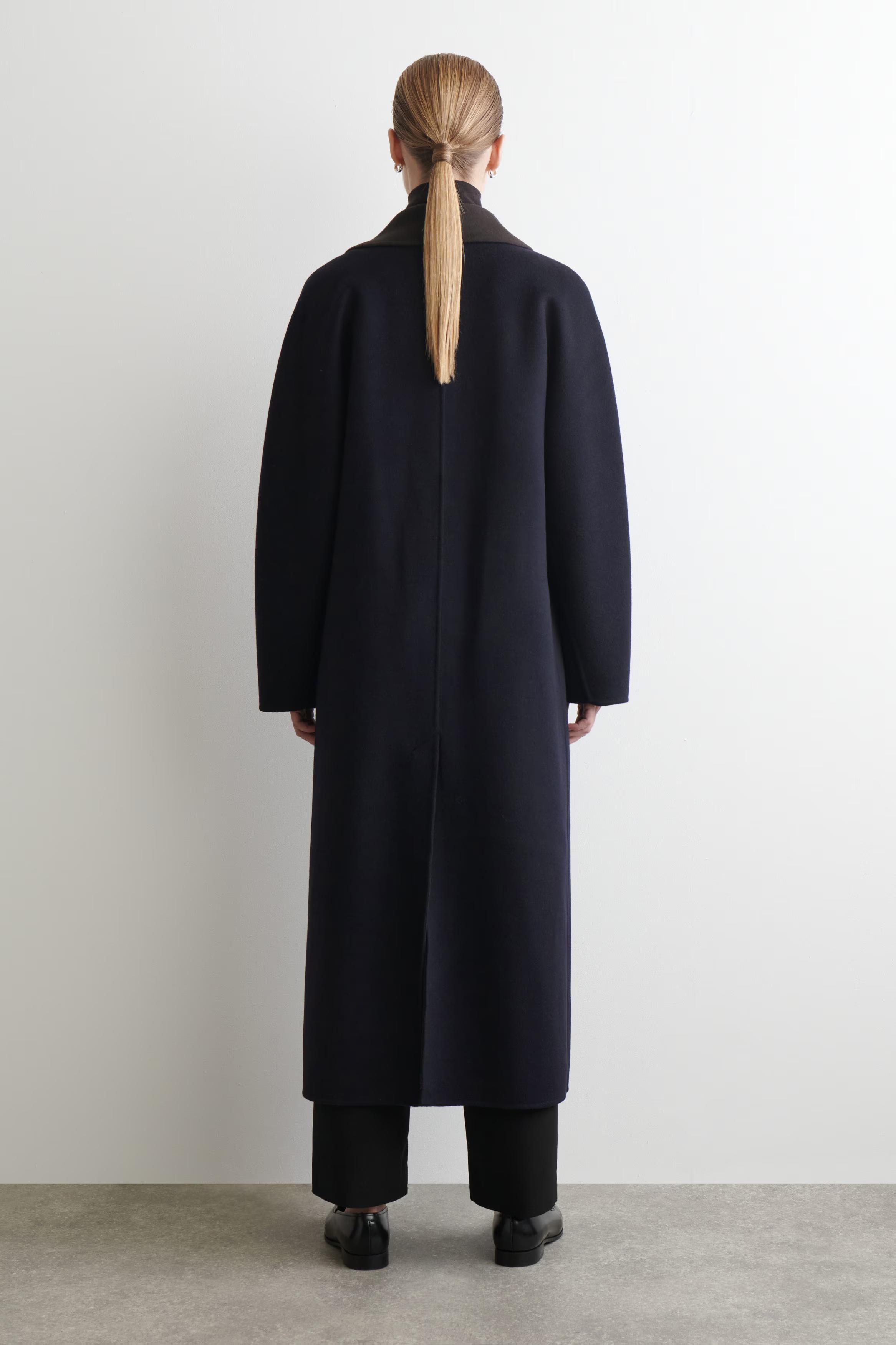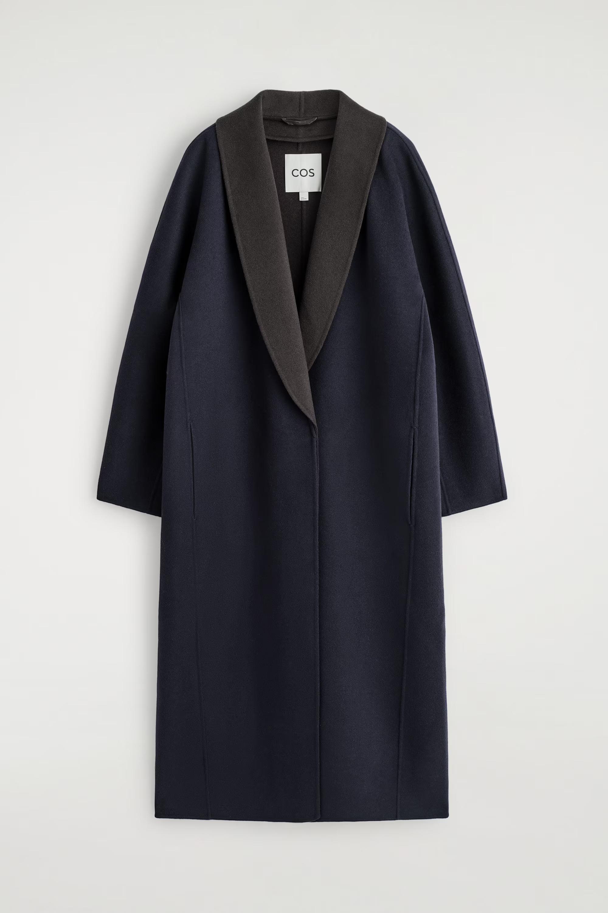 This understated wool coat reframes '80s sartorial codes for the modern wardrobe. Double-faced for a premium handle, it's cut in a softly sculpted silhouette and features shawl lapels in rich chocolate brown that subtly contrast the midnight-navy tone.\u0026nbsp;\u0026nbsp;Regular fitButton closureThis product contains Responsible Wool Standard TE-00047206 (RWS) wool fibre from farms certified to animal welfare and land-management requirements\u0026nbsp;Shell: 60% RWS Wool, 40% TENCEL\u0026trade; Lyocell. Pocket lining: 100% Viscose. Excluding trims / Dry clean\u0026nbsp;Back length of size S is 124.7cm / Model wears a size S