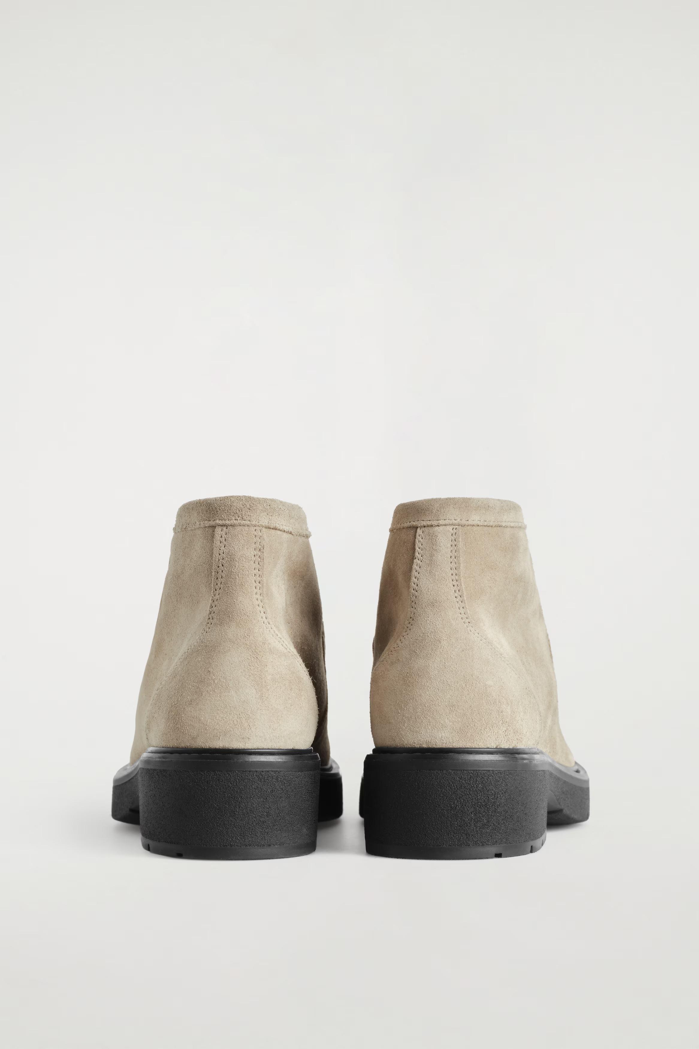 This season, the womenswear team reimagine the classic ankle boot with a modern appeal. Crafted from supple suede, they have rounded toes, waxed laces and tonal topstitching that accentuates the raised uppers. They're finished with chunky contrasting soles.\u0026nbsp;Lace closureCOS supports responsible manufacturing via the Leather Working Group\u0026nbsp;Upper: 100% Suede. Lining: 100% Leather. Sole: 100% Thermoplastic rubber. Excluding trims