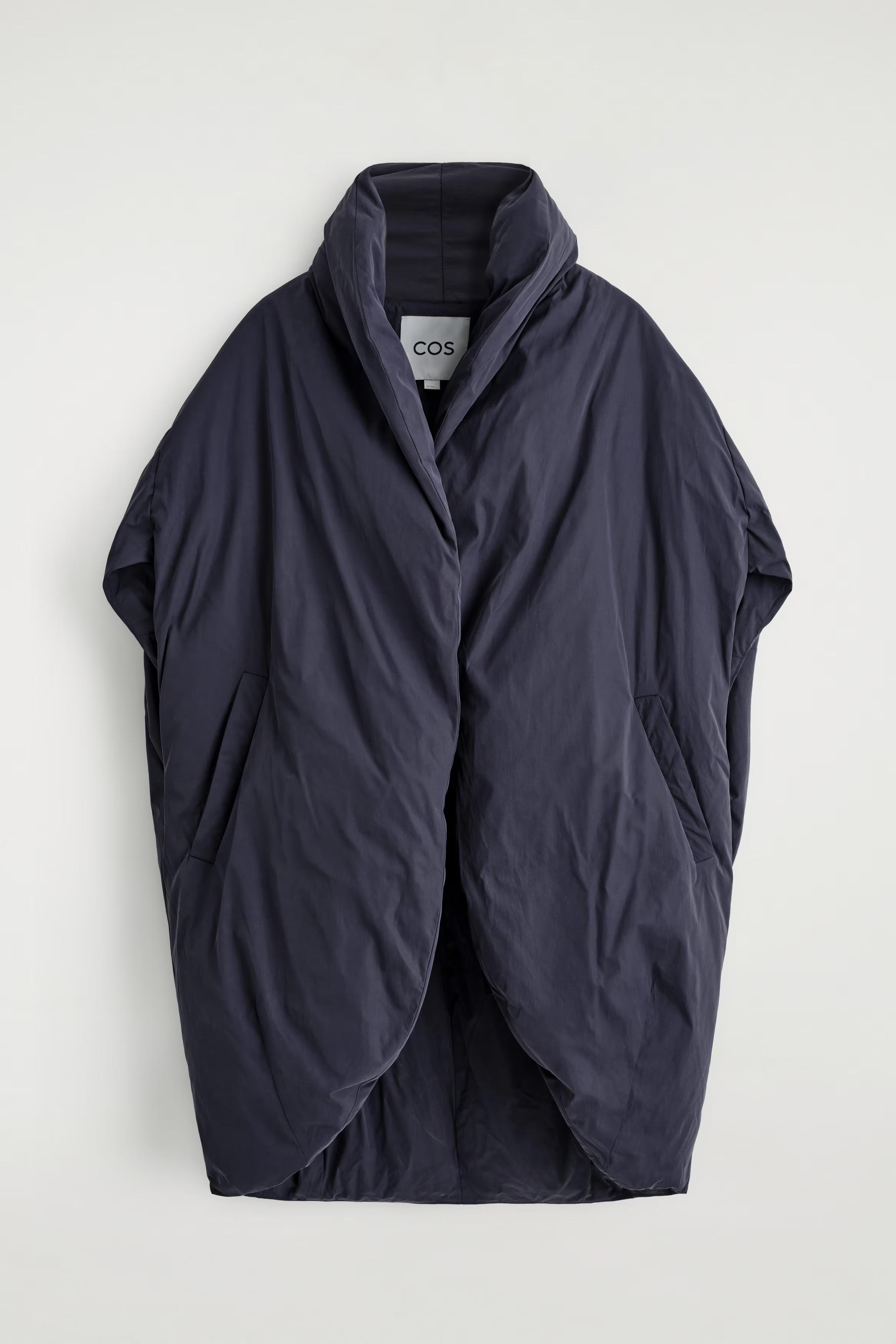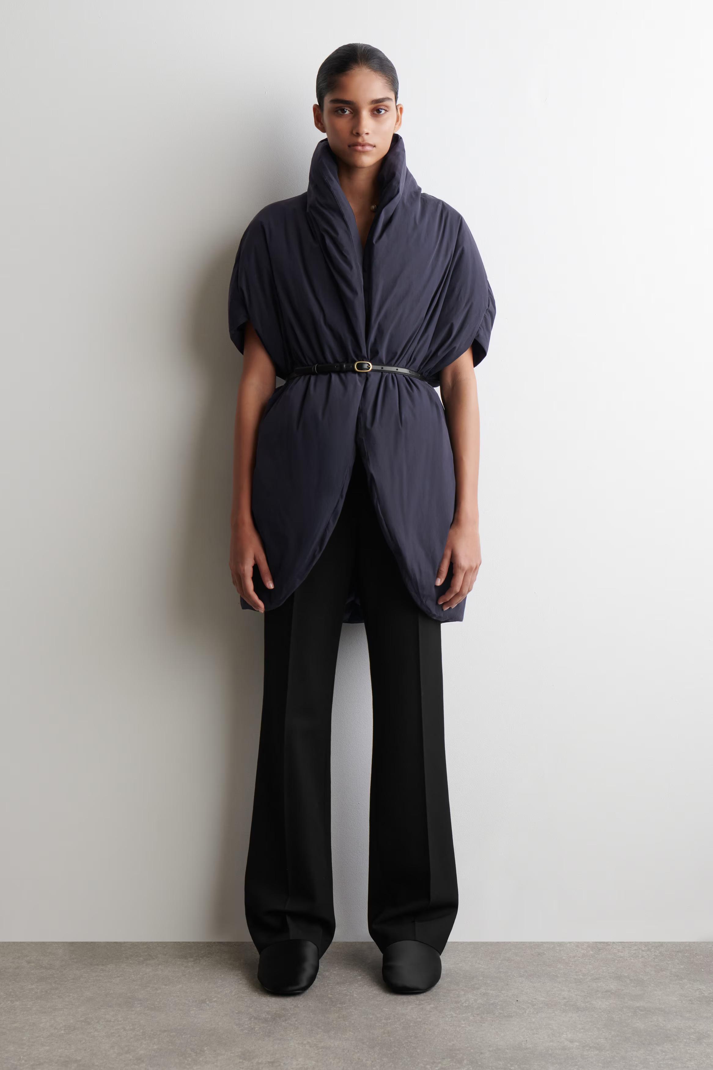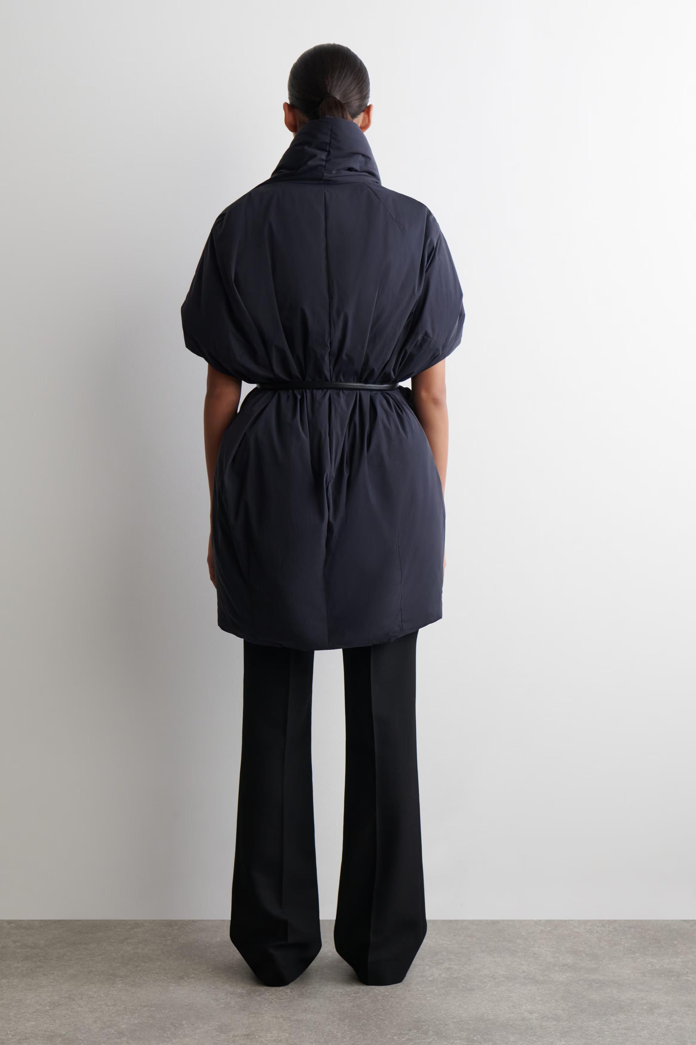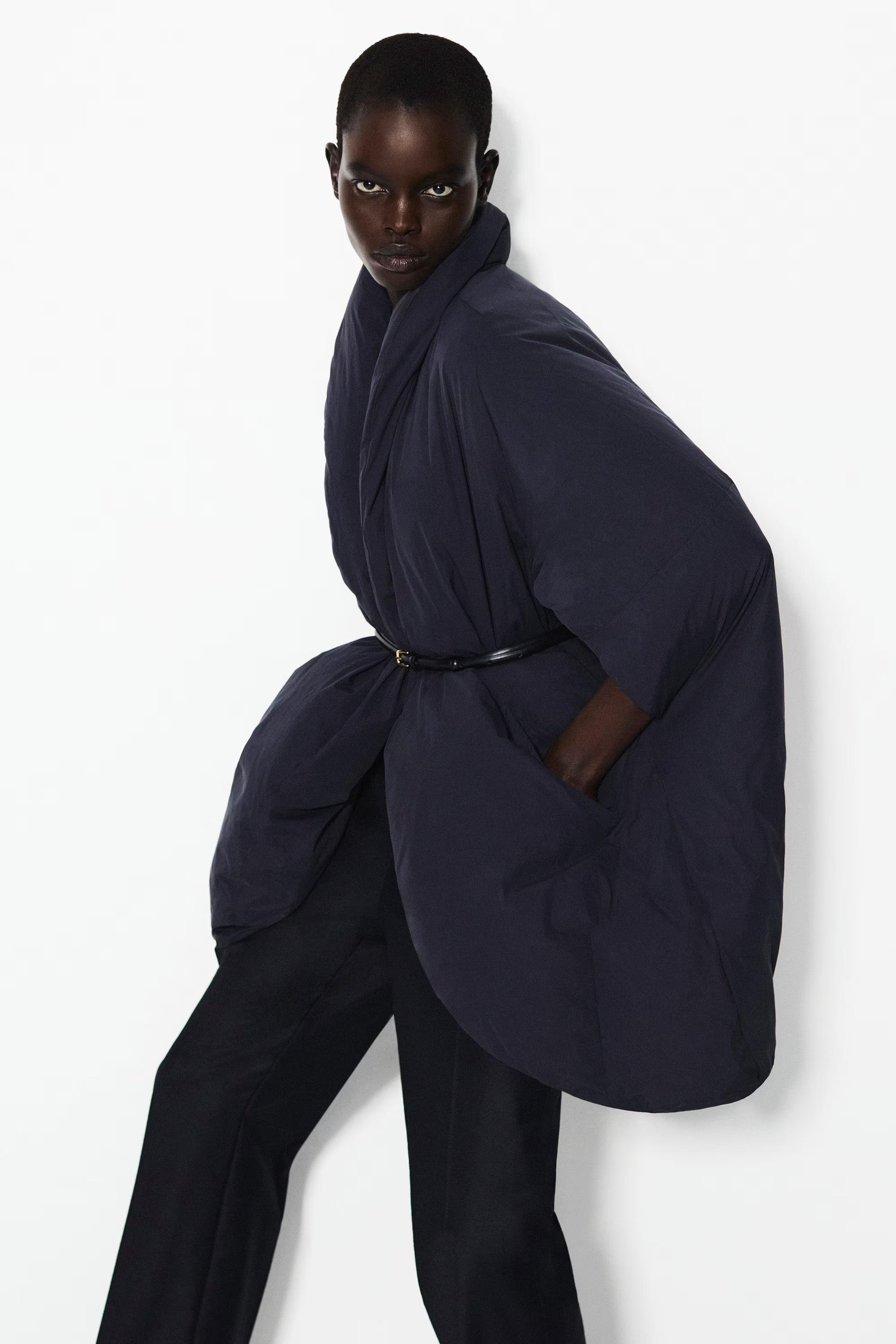 This modern puffer jacket is designed in an oversized, sculptural silhouette and is offered in an enduring navy tone. It's padded in premium down that feels warm yet weightless and features a shawl collar, cropped sleeves and welt pockets. Style the tonal belt around the waist.\u0026nbsp;Oversized fitPress-stud closureRecycled polyamide is polyamide made from textile waste in production\u0026nbsp;Shell: 100% Recycled polyamide (Recycled nylon). Lining: 100% Recycled polyester. Padding: 80% Recycled down, 20% Recycled feather. Excluding trims / Machine wash\u0026nbsp;Back length of size XS/S is 94.8cm, M/L is 96.8cm / Model wears a size XS/S\u0026nbsp;