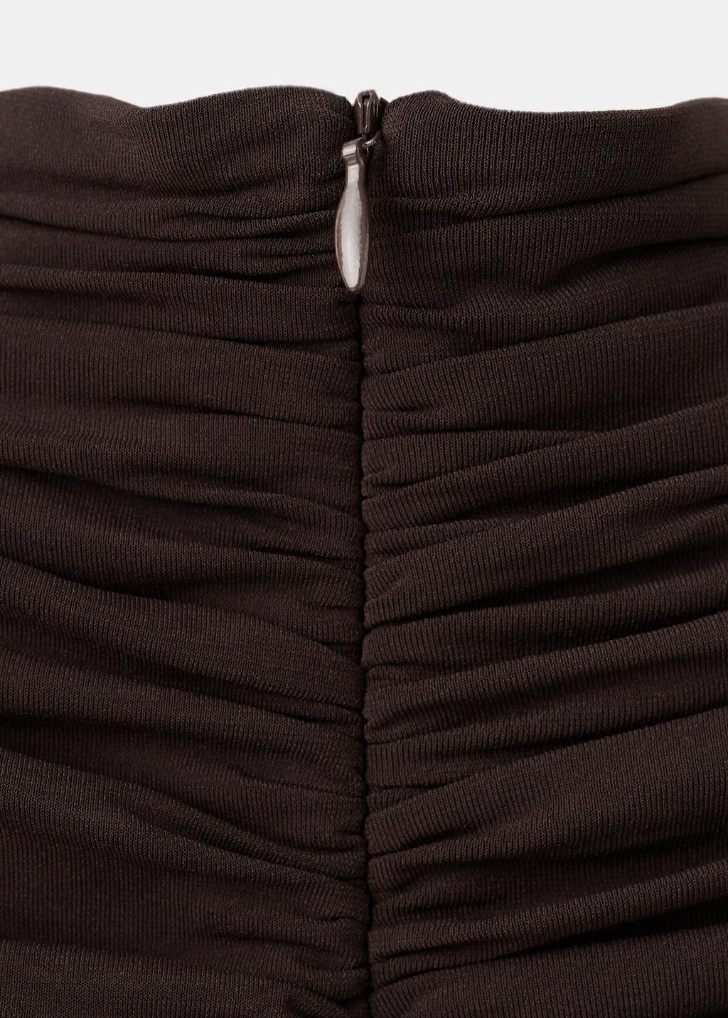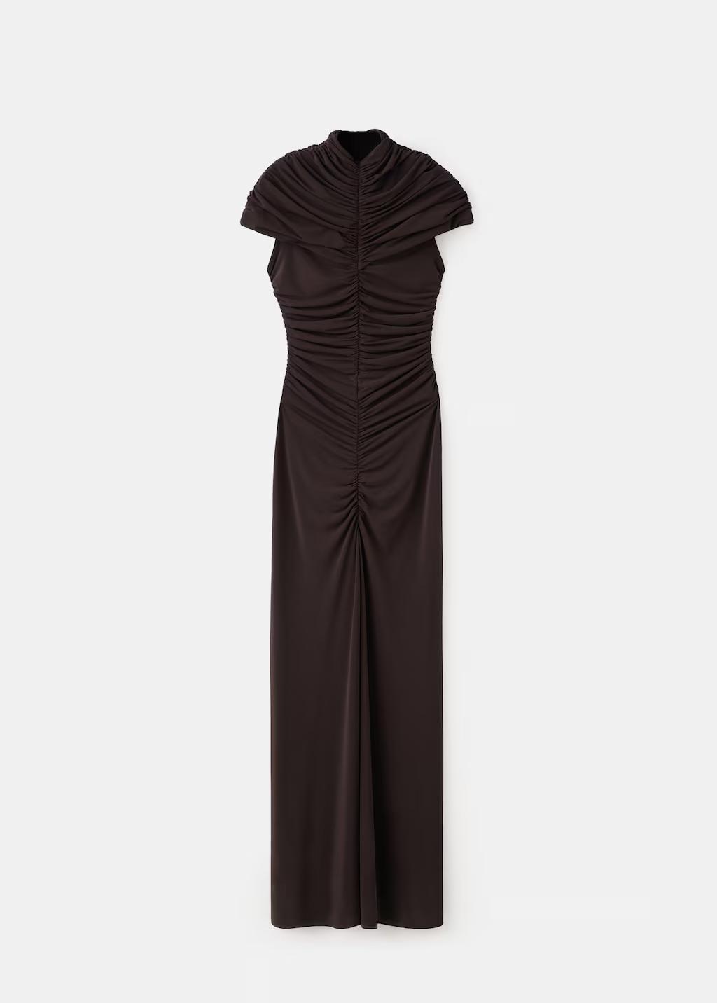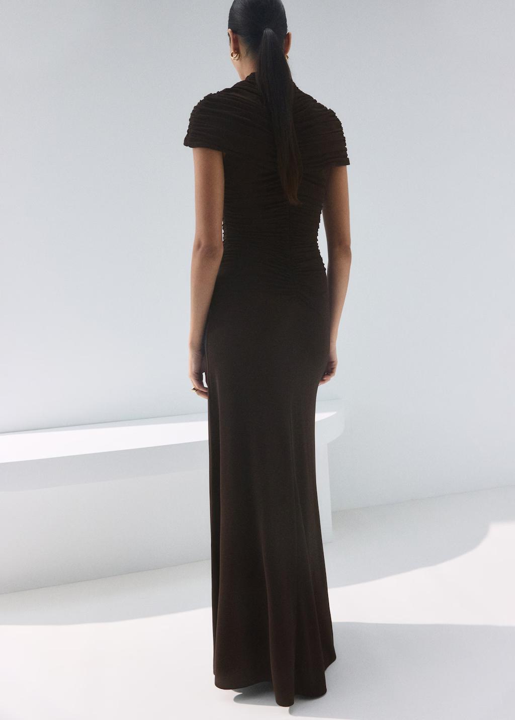 Diseño largo. Diseño evasé. Diseño entallado. Detalles fruncidos. Cuello alto. Manga corta. Cierre de cremallera en la parte posterior. Esta prenda pertenece a nuestra colección de fiesta y evento, diseñada para elevar tus looks en ocasiones especiales