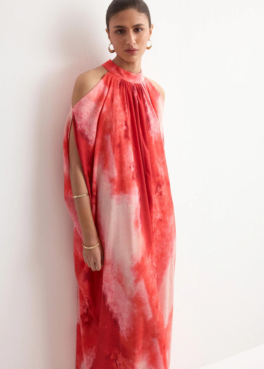 Diseño largo. Diseño oversize. Diseño estampado. Cuello redondo. Hombros descubiertos. Abertura en las mangas. Cierre en el cuello. Esta prenda pertenece a nuestra colección de fiesta y evento, diseñada para elevar tus looks en ocasiones especiales