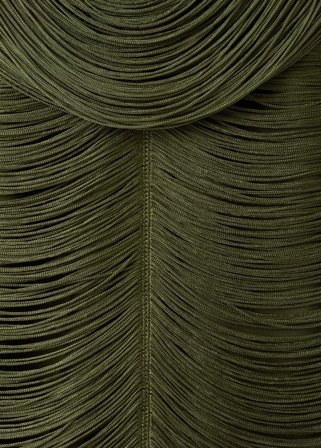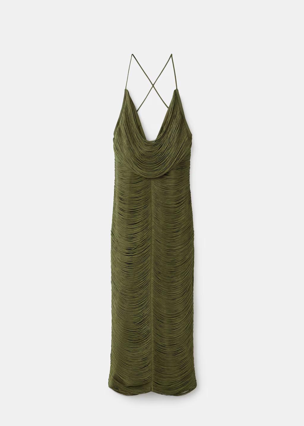 Este vestido encarna la elegancia moderna con sus flecos cuidadosamente diseñados que crean un movimiento fluido y sofisticado. Los tirantes finos cruzados en la espalda ofrecen un diseño elegante que realza la estructura del vestido, mientras que el escote profundo en la espalda añade un toque de sensualidad refinada. Diseño de flecos. Diseño entallado. Diseño midi. Cuello drapeado. Sin mangas. Tirantes cruzados en la espalda. Escote de pico en la espalda. Cierre de cremallera en la parte posterior. Forro interior. Esta prenda pertenece a nuestra colección de fiesta y evento, diseñada para elevar tus looks en ocasiones especiales. Los artículos de la colección CAPSULE se pueden cambiar o devolver en un plazo de 14 días desde la fecha de envío. Capsule: una colección de prendas de edición limitada, hechas con los mejores tejidos y los máximos cuidados en el patronaje, para conseguir los mejores acabados. Esta colección, de carácter exclusivo, está pensada para los eventos y ocasiones más especiales