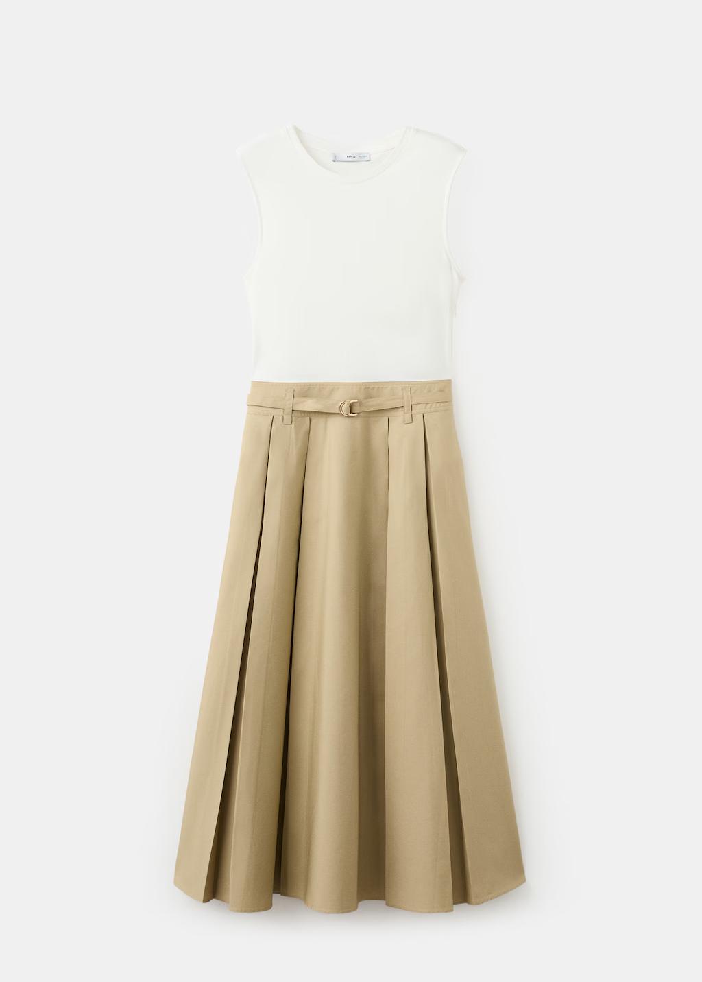 Diseño combinado. Diseño midi. Diseño evasé. Detalle godets. Cuello redondo. Sin mangas. Trabillas. Cinturón con cierre de hebilla. Cierre de cremallera lateral