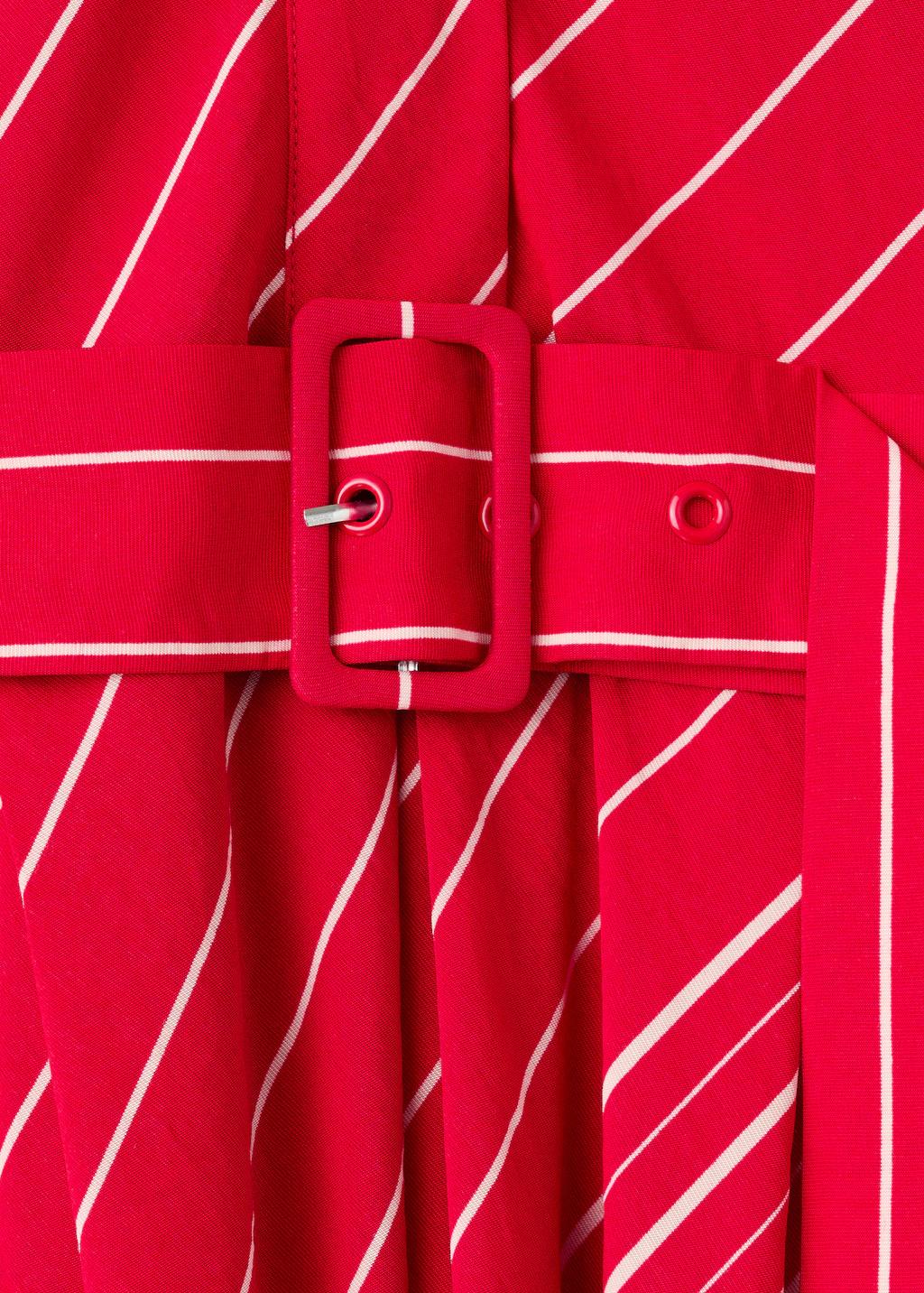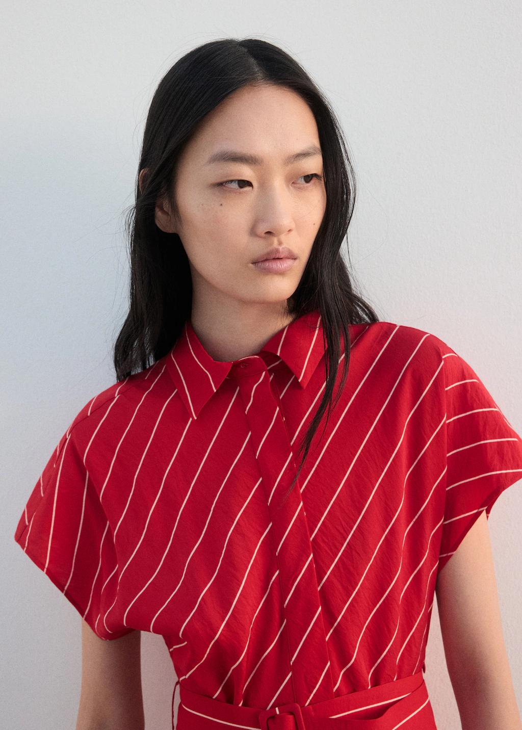 Diseño largo. Diseño recto. Estampado Rayas. Cuello camisero. Manga corta. Cinturón con cierre de hebilla. Cierre delantero con botones