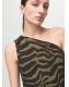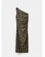 Diseño midi. Diseño entallado. Estampado de cebra. Cuello asimétrico. Tirante fruncido. Fruncidos laterales. Cierre de cremallera lateral