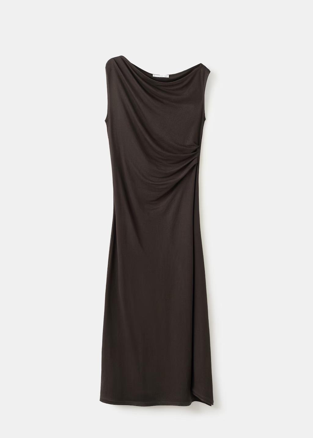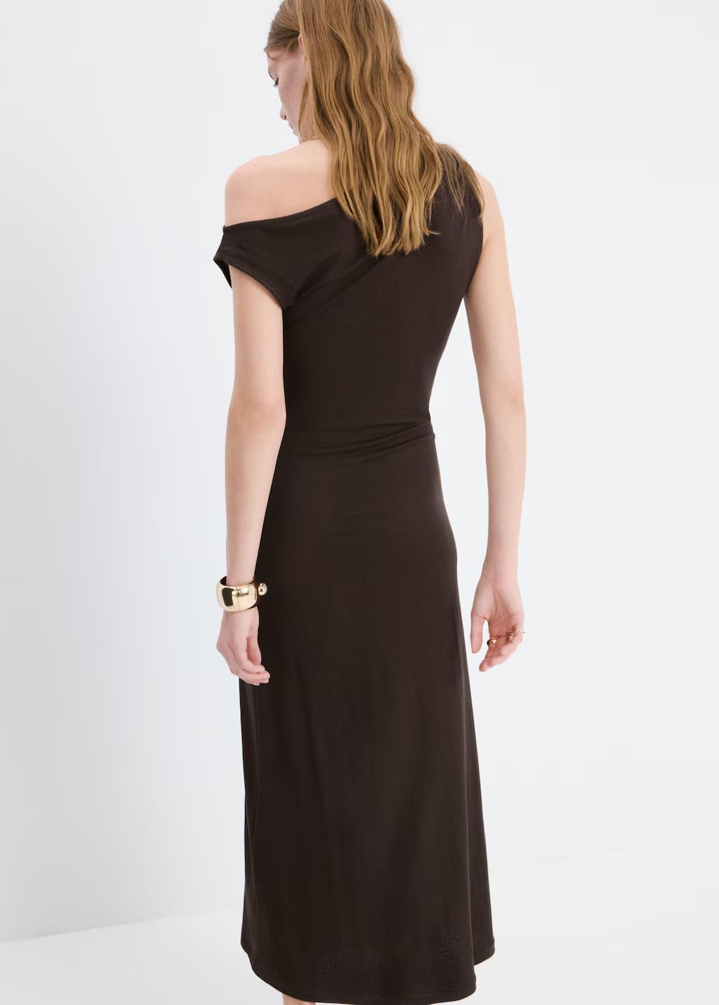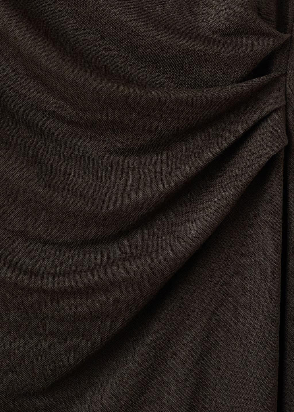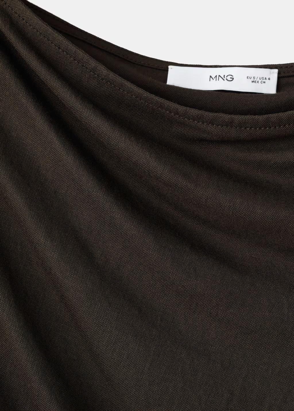 Tejido de punto fino en viscosa. Diseño recto. Diseño midi. Cuello asimétrico. Mangas asimétricas. Detalle drapeado. Sin cierre