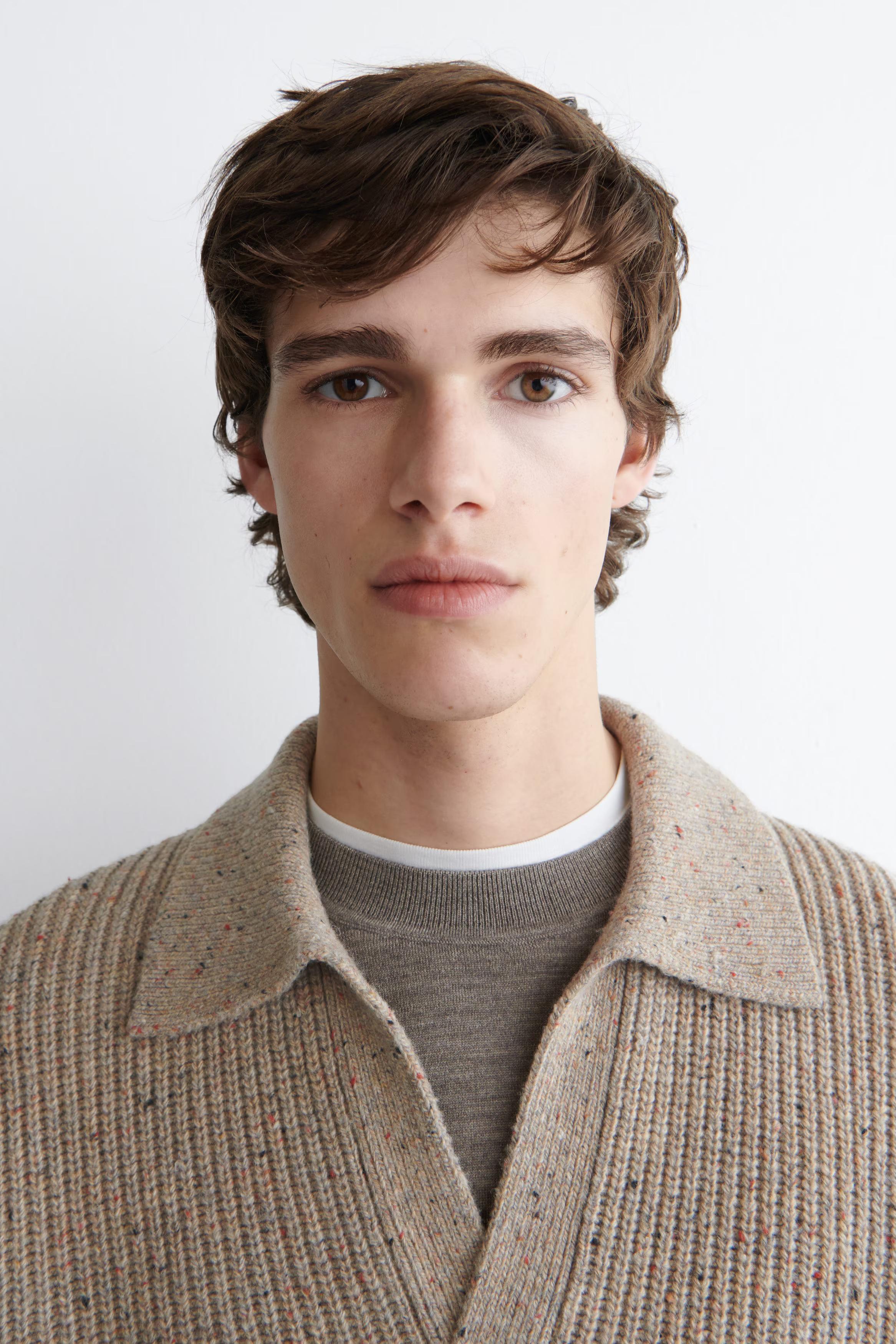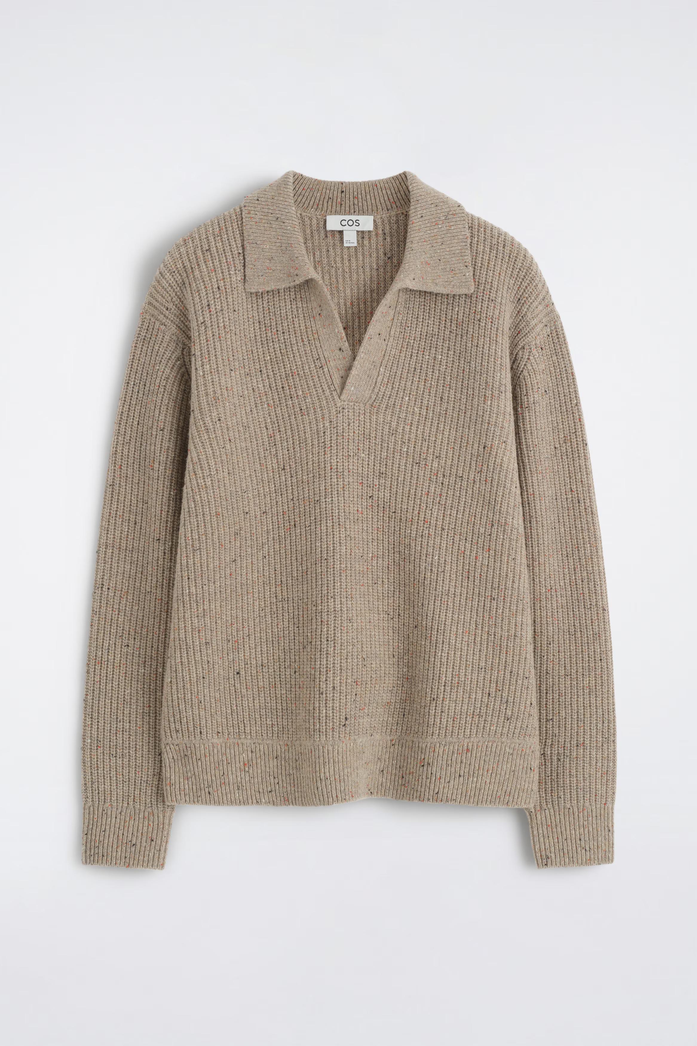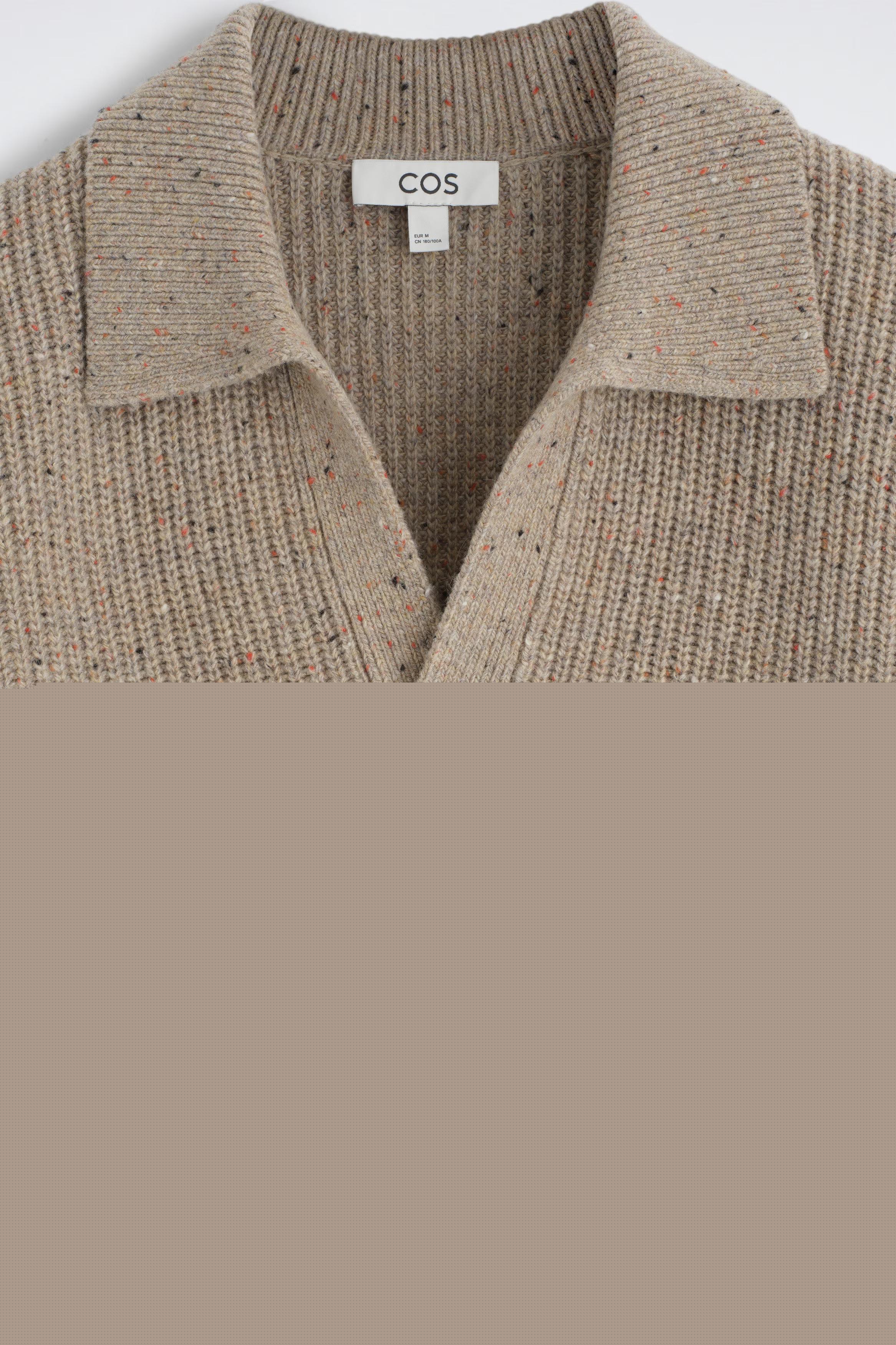 This season's knitwear revisits artisinal design codes and heritage craftsmanship. This wool polo jumper is rib-knitted from Donegal-effect yarn that's flecked for textural interest and comes in a deep red hue. It's a great layering piece\u0026nbsp;\u0026ndash; wear it over a T-shirt in the cooler months.\u0026nbsp;\u0026nbsp;Relaxed fitThis product contains Responsible Wool Standard TE-00047206 (RWS) wool fibre from farms certified to animal welfare and land-management requirements\u0026nbsp;Shell: 100% RWS Wool. Excluding trims / Machine wash\u0026nbsp;Back length of size M is 62cm / Model wears a size M