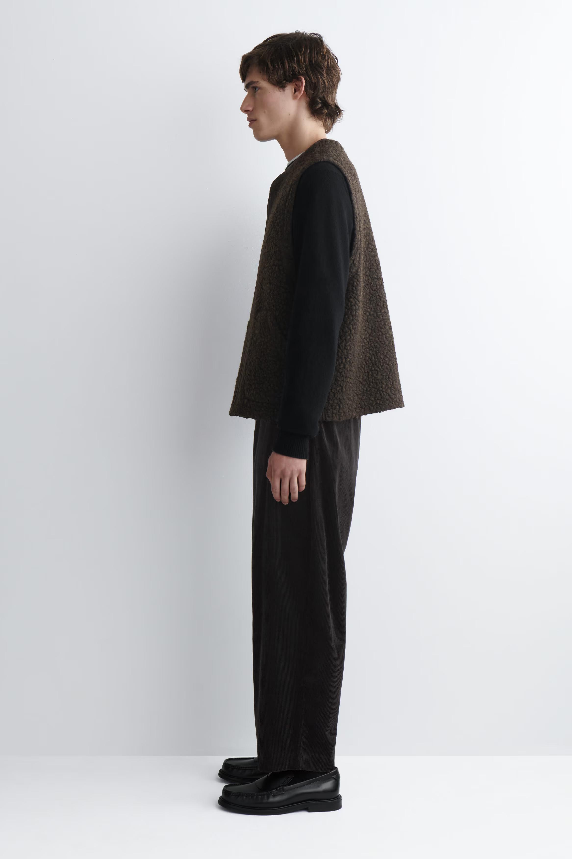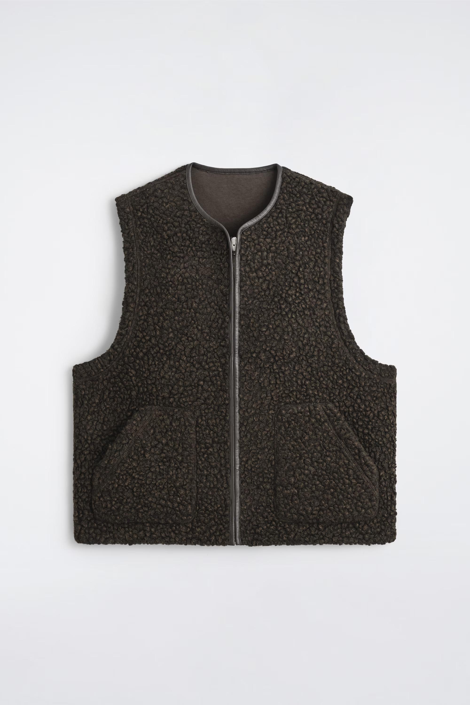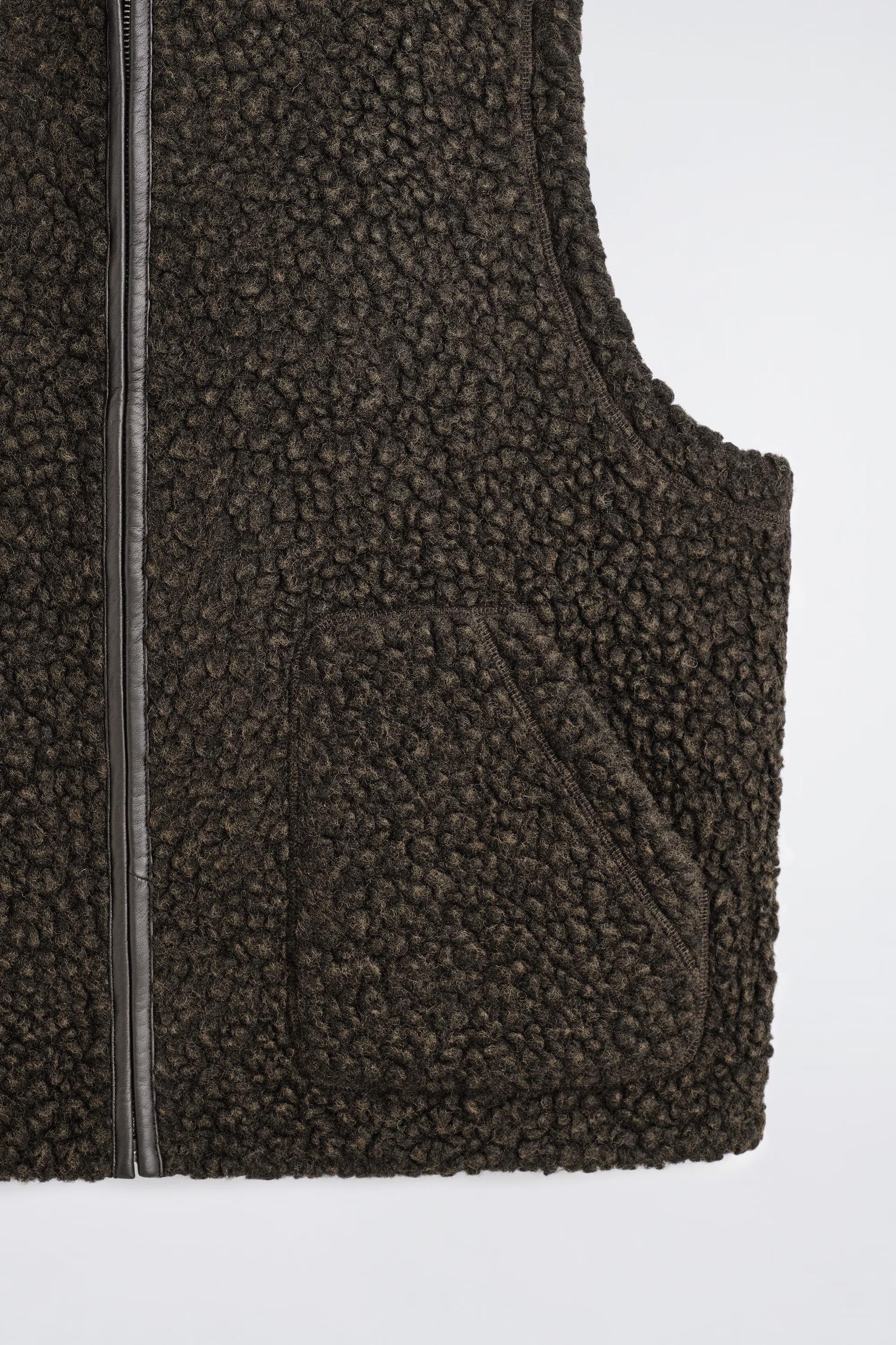 This modern gilet reinterprets sportswear codes for winter. Made from tactile teddy, it's designed with practical features that keep you warm in the cooler months \u0026ndash; note the patch pockets and bonded-jersey lining. The edges are carefully bonded in leather for a premium finish, while the internal pocket keeps essentials close to hand.\u0026nbsp;Relaxed fitZip closureRecycled polyester is polyester made from PET bottles or end-of-life textile waste. The PET bottles or textile waste is mechanically recycled and processed into new yarn\u0026nbsp;Shell: 58% Recycled polyester, 25% Cotton, 17% RWS wool. Details: 100% Leather. Excluding trims / Dry clean\u0026nbsp;Back length of size M is 66cm / Model wears a size M