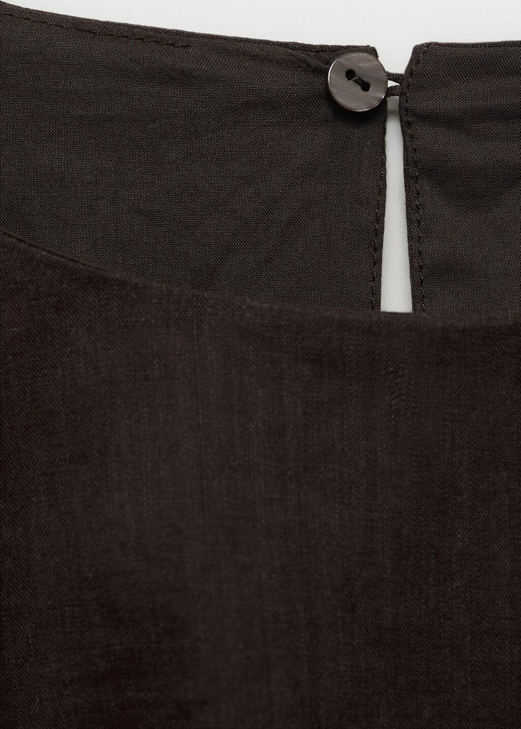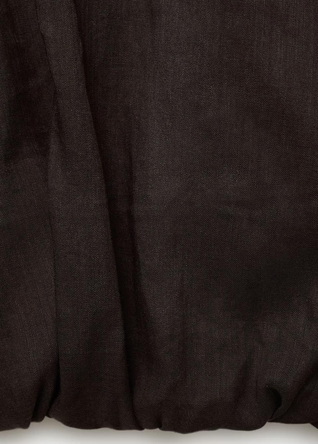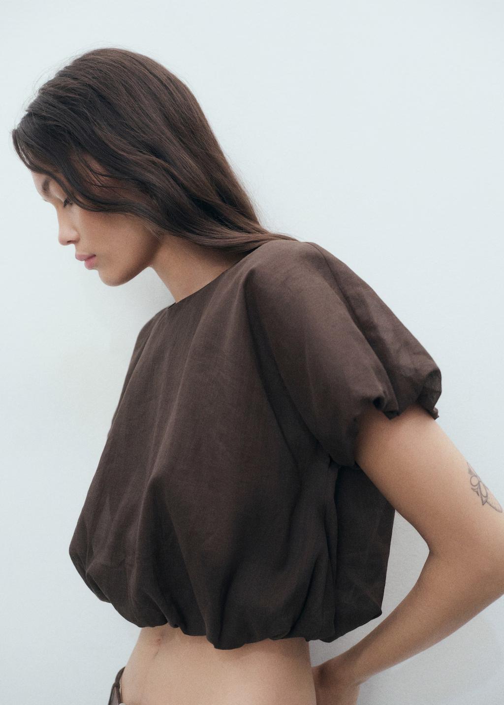 Confeccionada en tejido mezcla de ramio y algodón, esta prenda presenta un diseño crop con estilo globo. El cuello redondo y las mangas cortas abullonadas complementan su estructura, convirtiéndola en una pieza esencial para quienes buscan un equilibrio entre estructura y fluidez