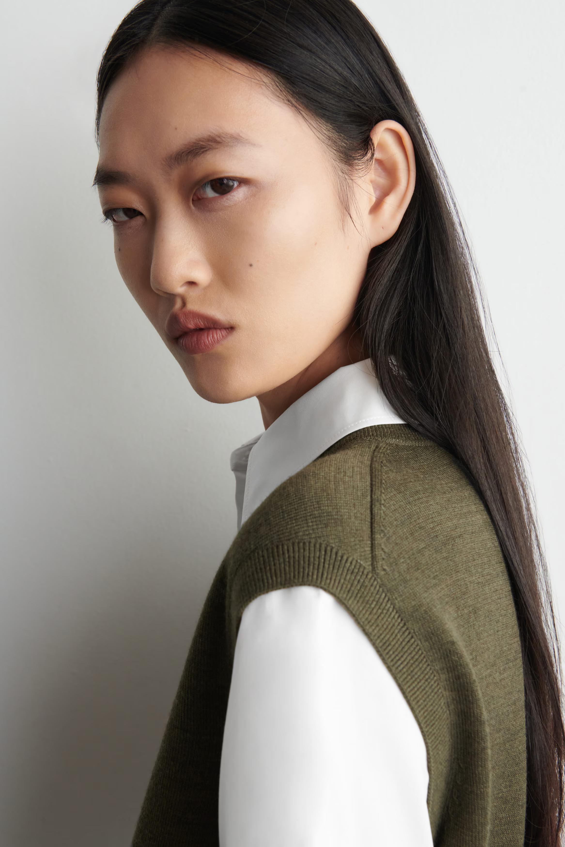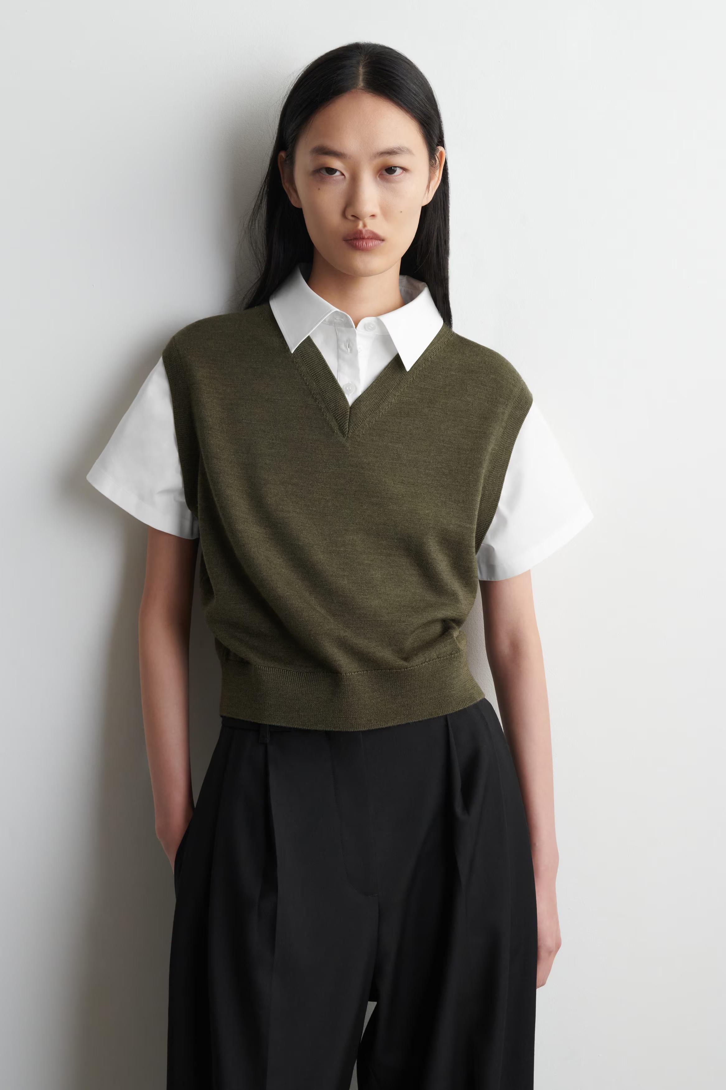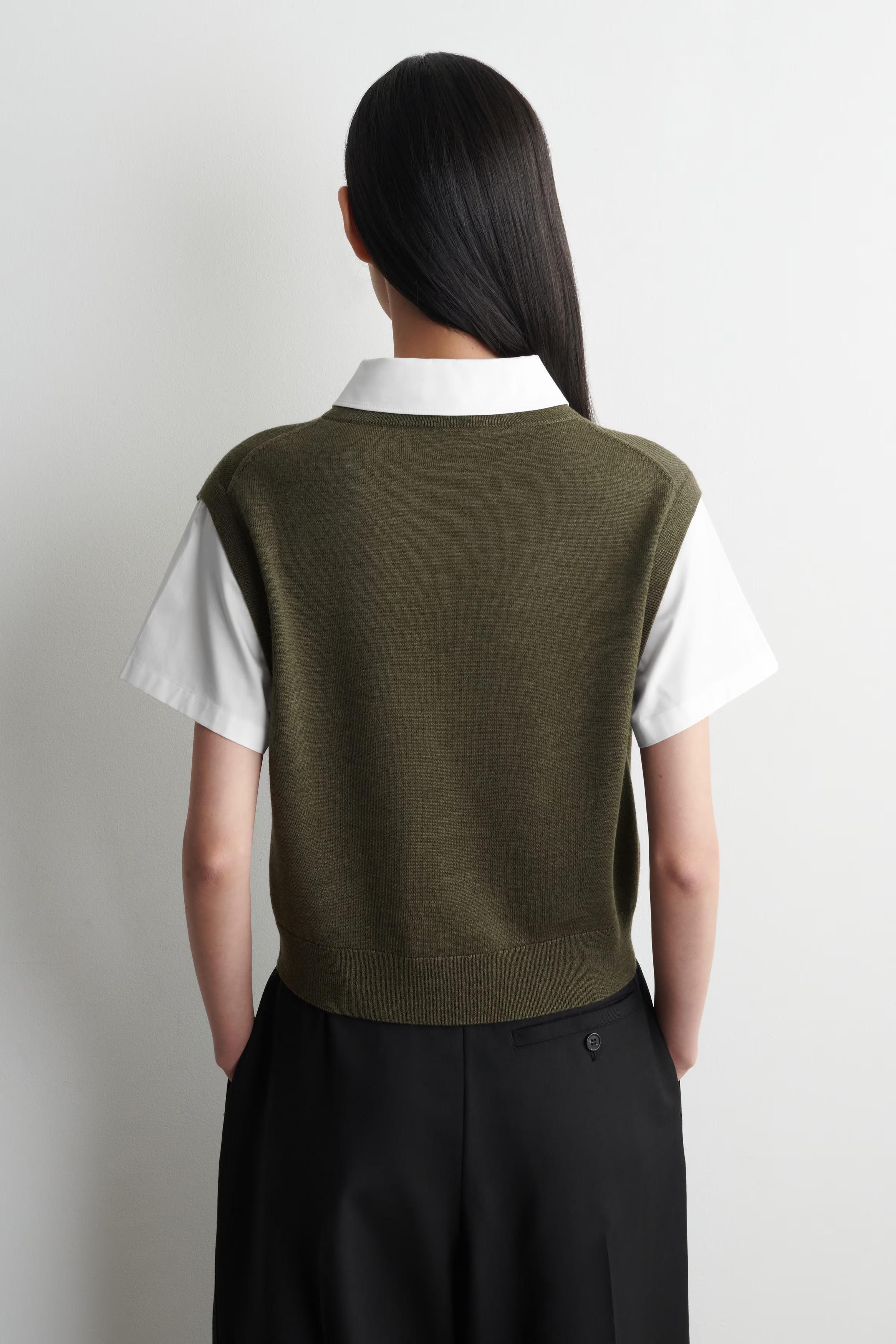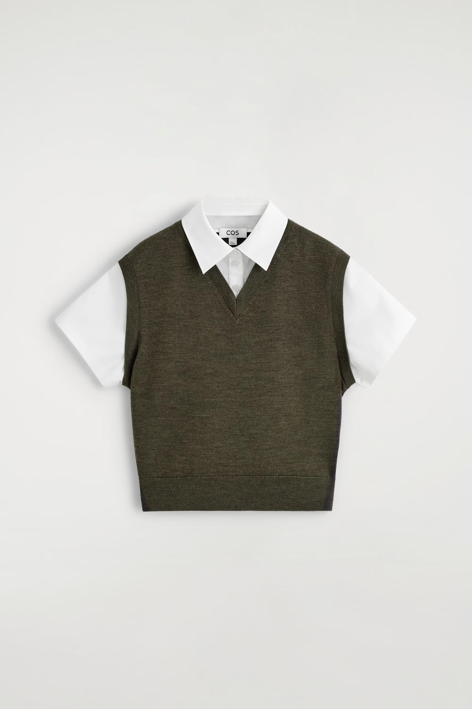 This modern piece fuses the design of vests and shirts for an effortlessly layered look. It's crafted from ultra-soft merino wool in a m\u0026eacute;lange-brown tone and features a crisp cotton-poplin collar and short sleeves.\u0026nbsp;Regular fitButton closure\u0026nbsp;Shell 1: 100% Merino wool. Shell 2: 100% Cotton. Excluding trims / Machine wash\u0026nbsp;Back length of size S is 51cm / Model wears a size S