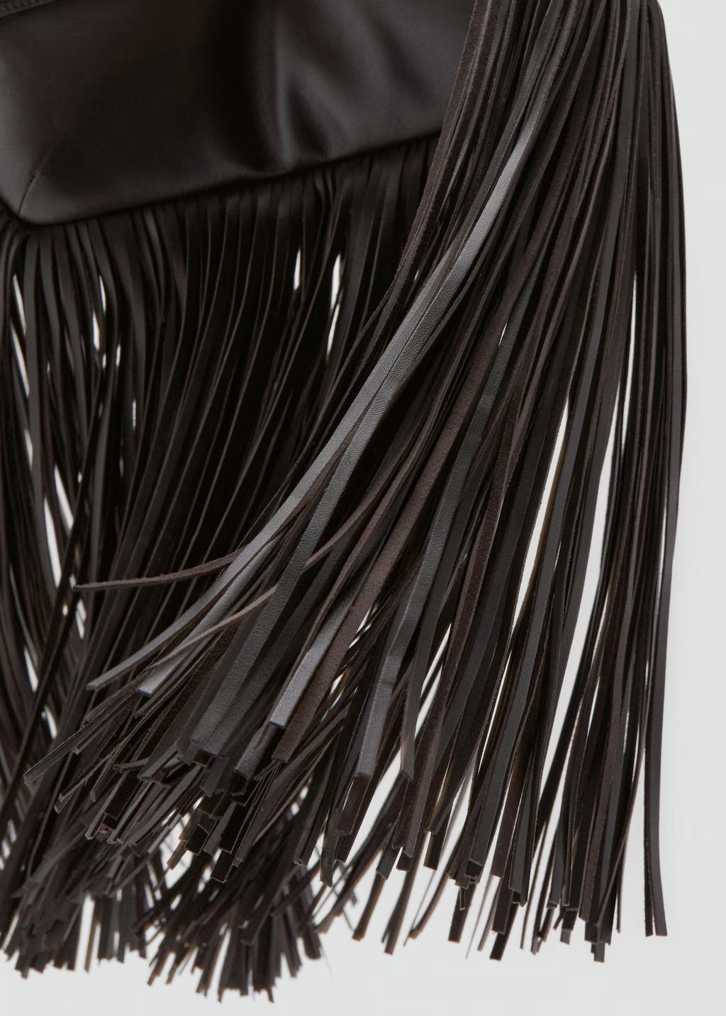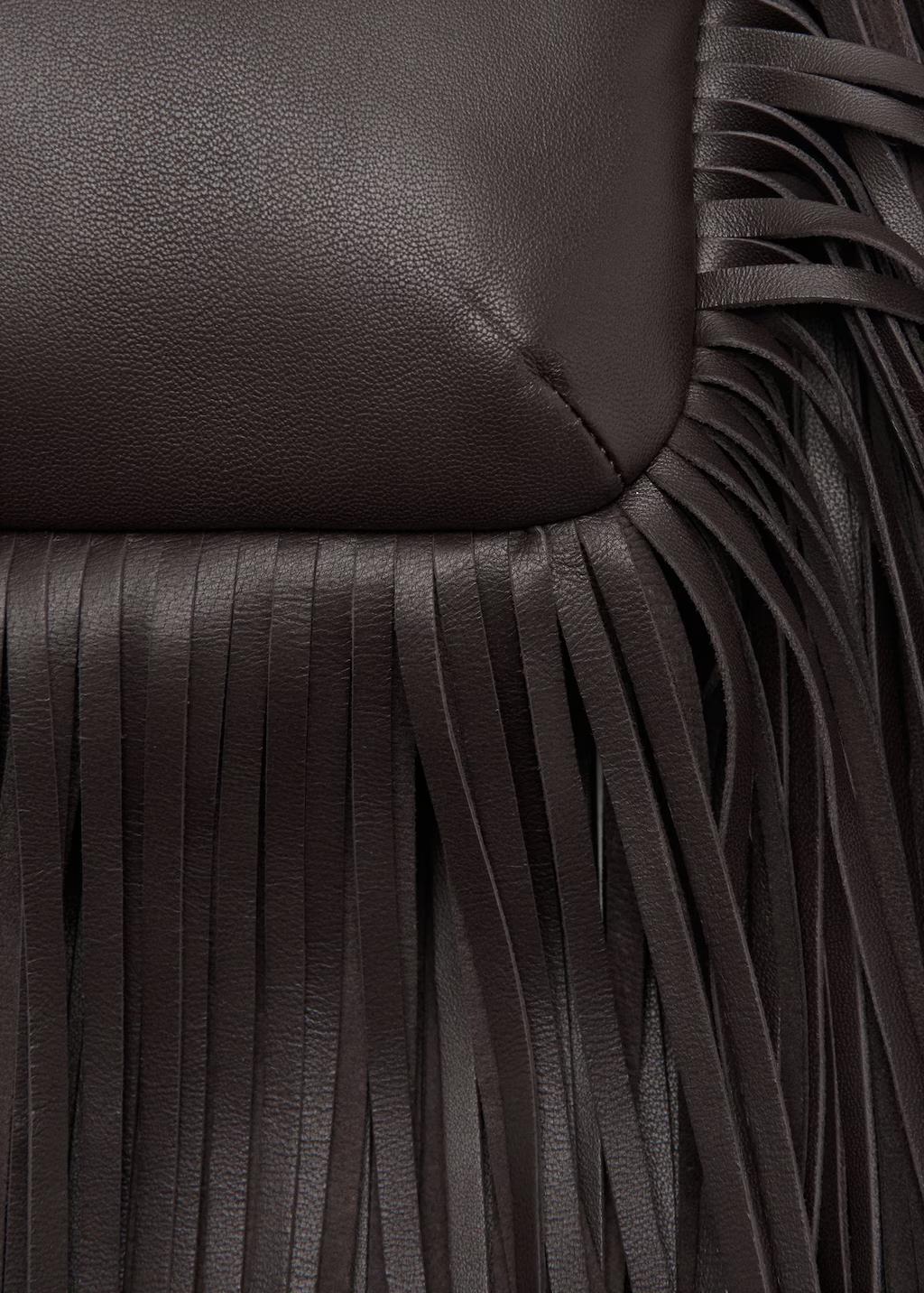 100% piel ovino. Tamaño mediano. Diseño de flecos. Cierre de botón a presión. Forro interior 100% algodón. Exclusivo Online. 32.0x50.0x8.0 cm (Largo x Alto x Ancho)