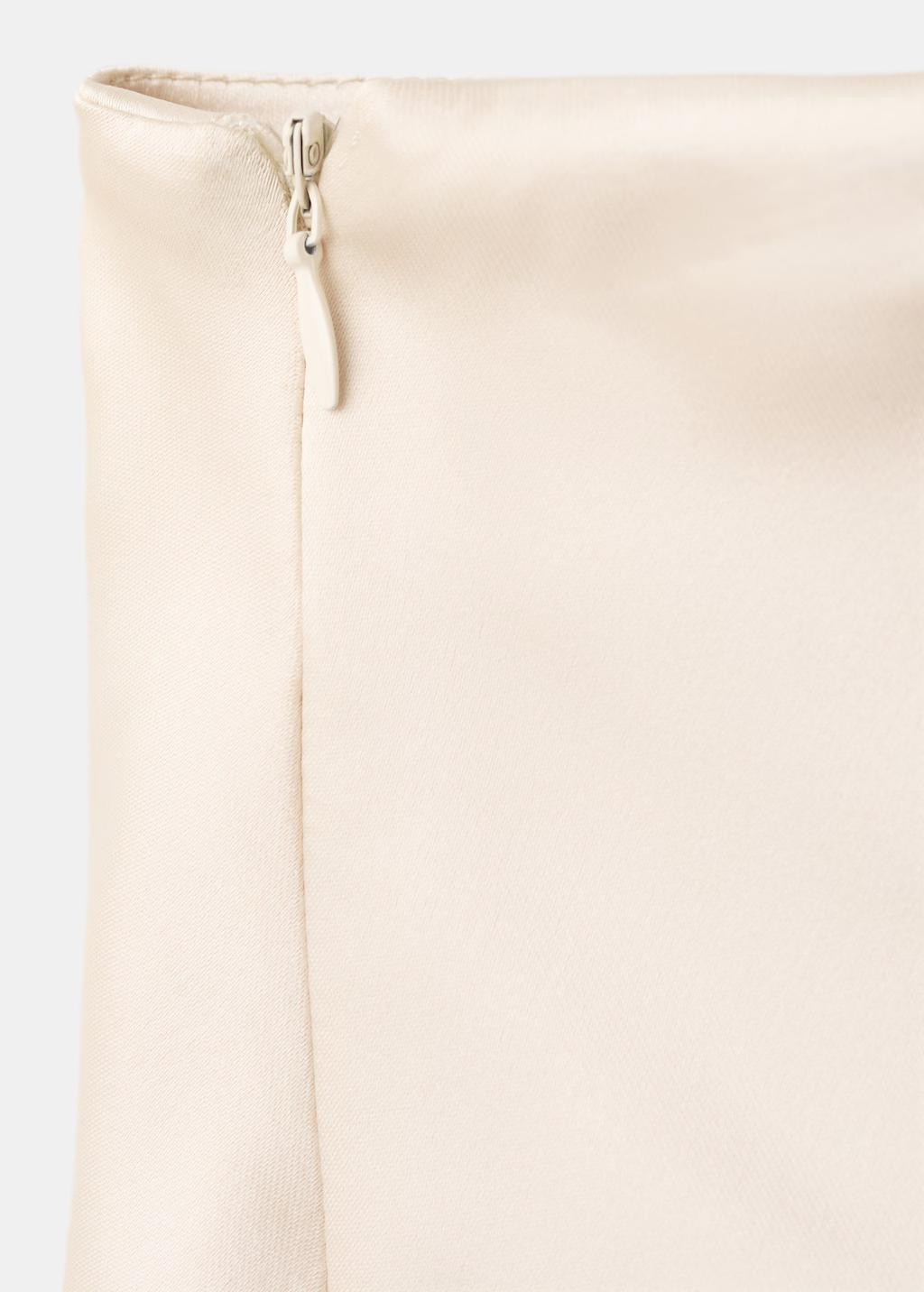 Diseño corto. Cintura baja. Tejido satinado. Ribetes de encaje. Abertura en el bajo. Cierre de cremallera lateral