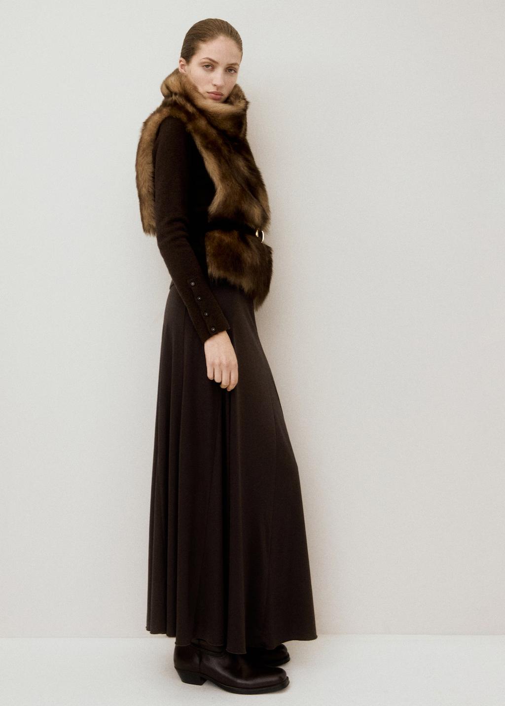Con un diseño largo y evasé, esta prenda presenta detalle de godets que aportan movimiento. La cintura con goma elástica de tiro medio asegura comodidad y ajuste perfecto
