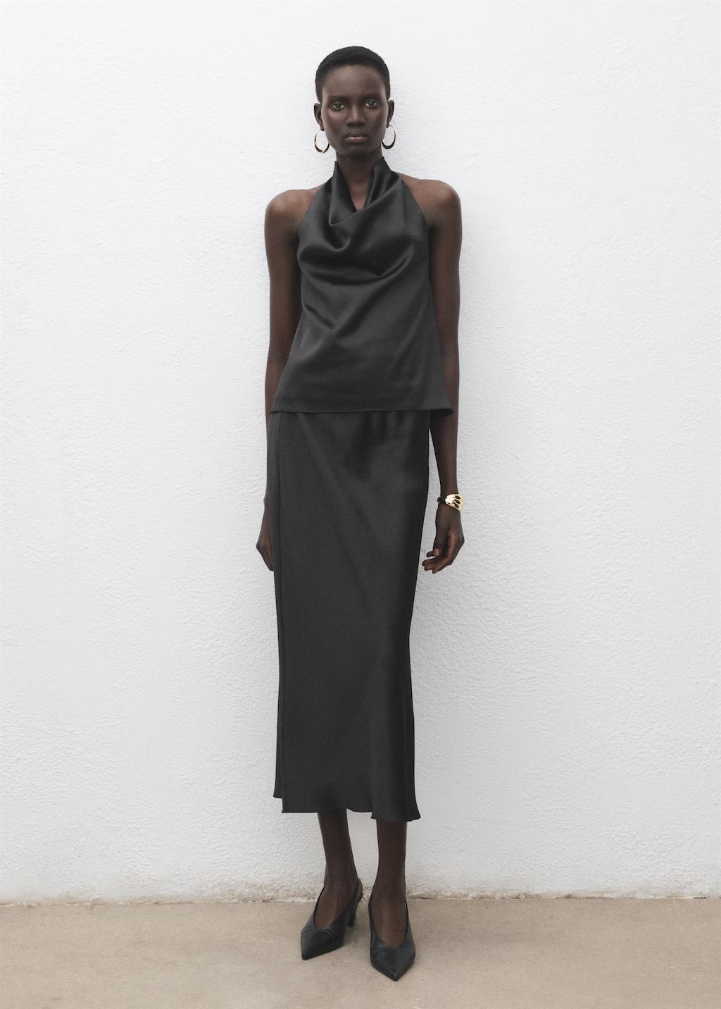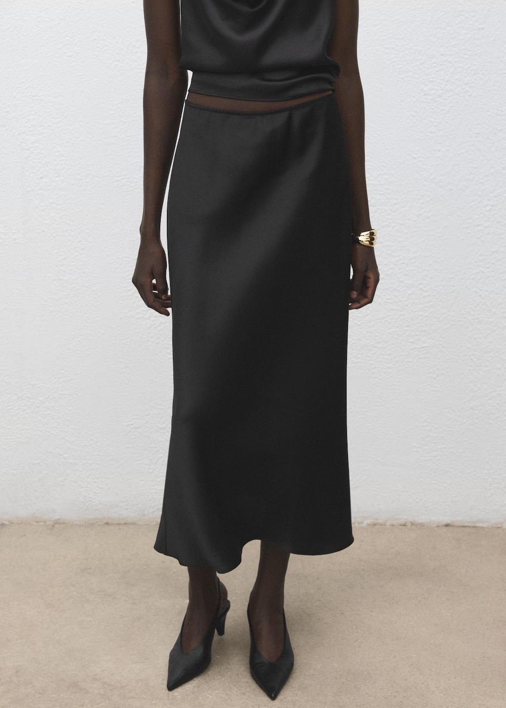 Disponible Plus. Tiro cintura Ajustable/Goma. Estructura plana Medio. Largo Midi. Tejido satinado. Diseño largo. Diseño recto. Cintura con goma elástica
