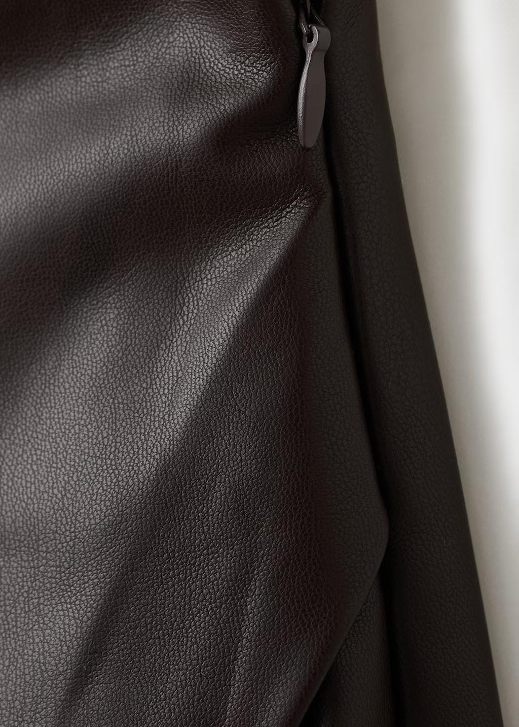 Esta falda pantalón con efecto de piel presenta un diseño mini y recto. Su estilo cruzado y tiro medio se complementan con un cierre de cremallera lateral