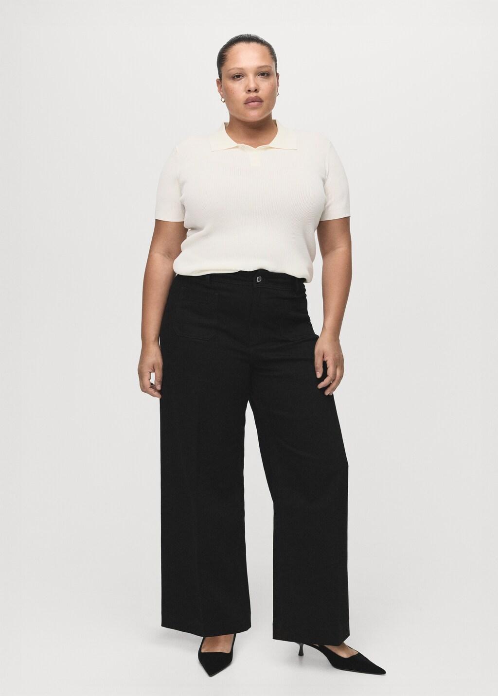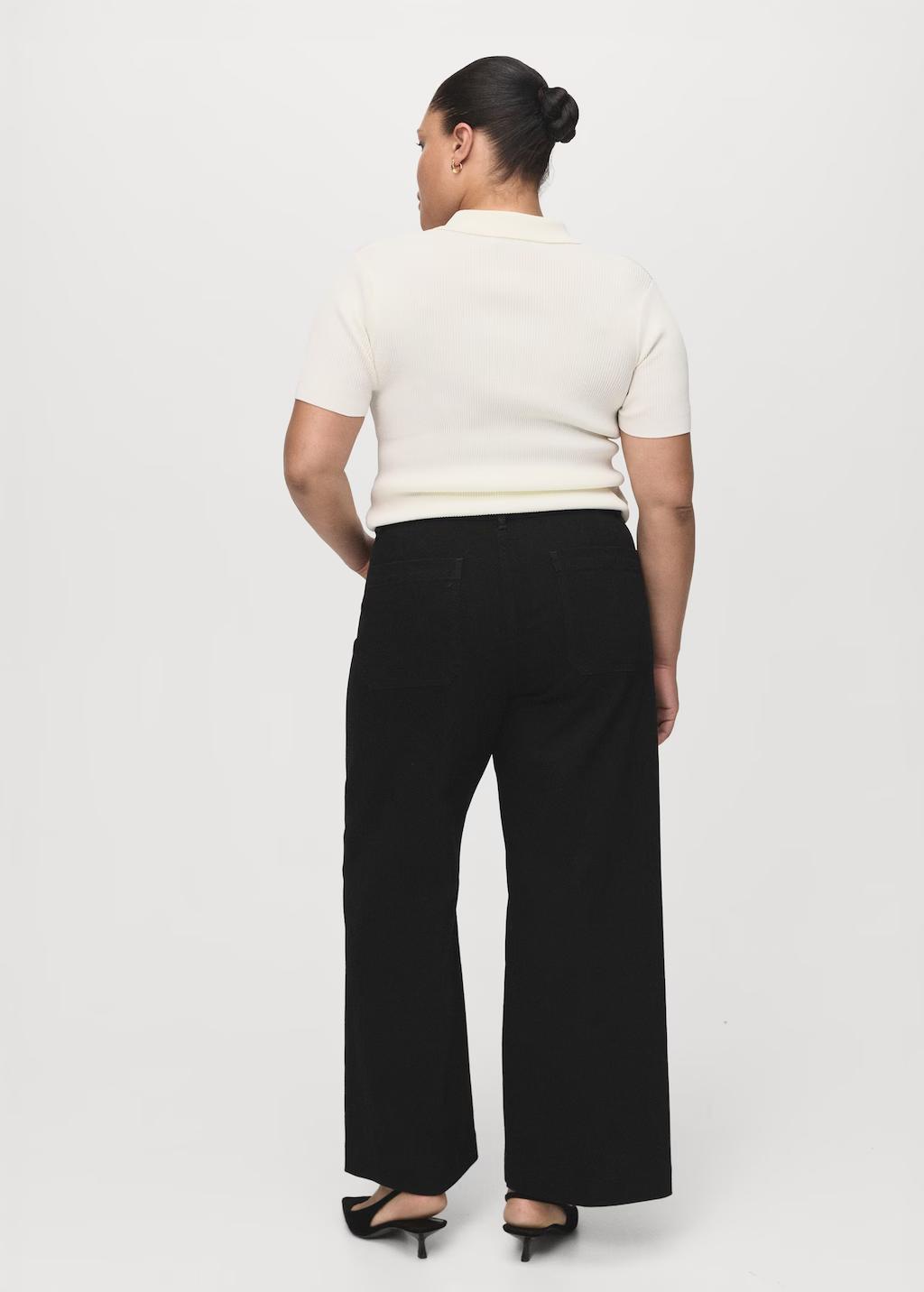 Tejido de algodón estilo tejano vaquero. Tejido elástico. Diseño largo. Diseño wide leg. Tiro alto. Trabillas. Dos bolsillos de parche en la parte delantera. Cierre delantero de cremallera y botón. Disponible Plus. Largo interior 74,5 cm