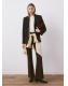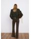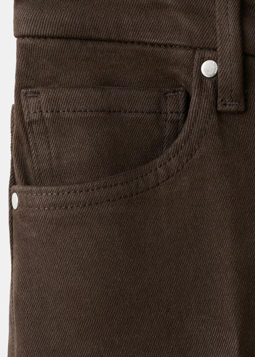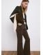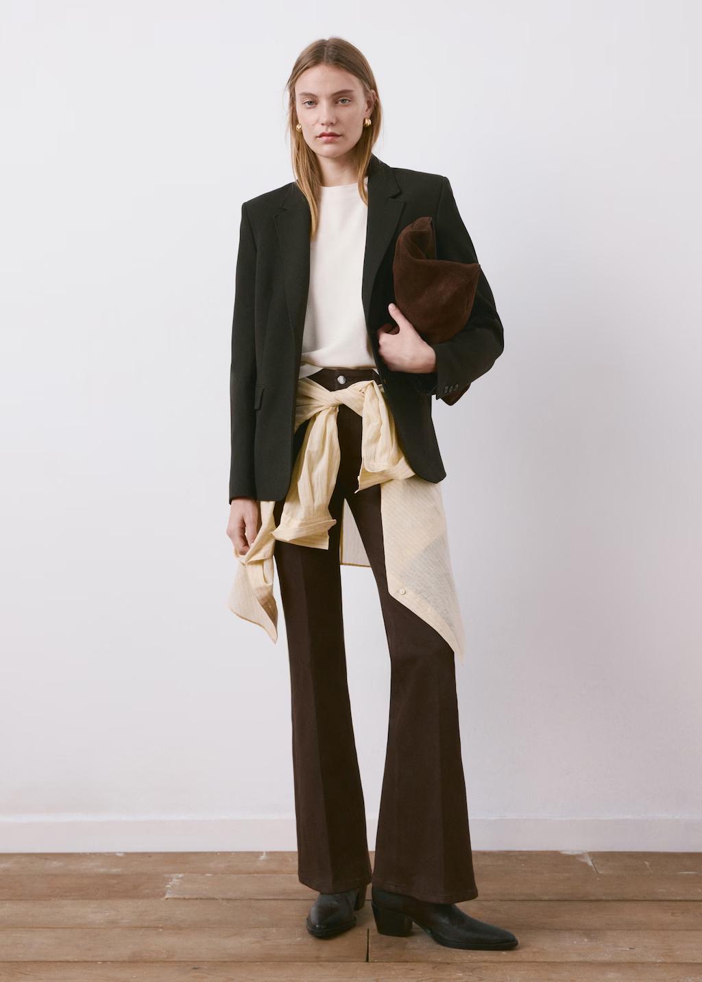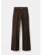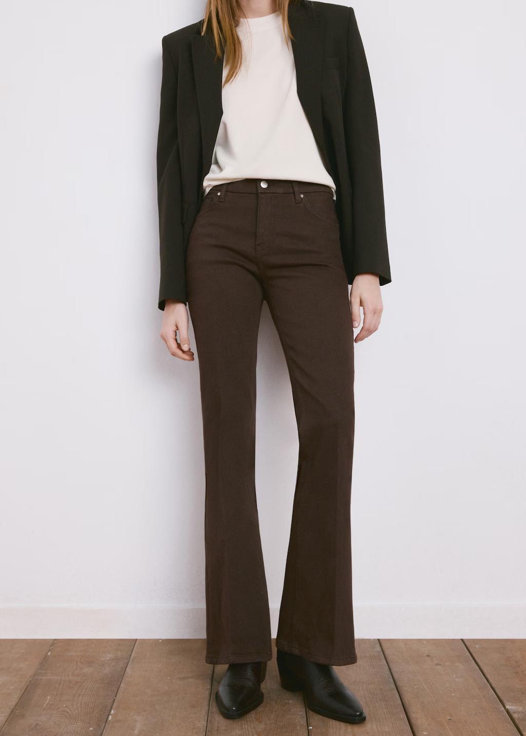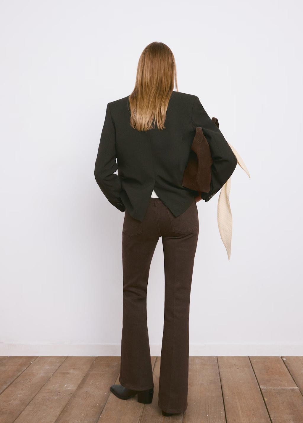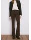 Tejido de algodón estilo tejano vaquero. Tejido elástico. Diseño largo. Estilo flare. Tiro alto. Cinco bolsillos. Cierre delantero de cremallera y botón. Largo interior 87,5 cm