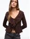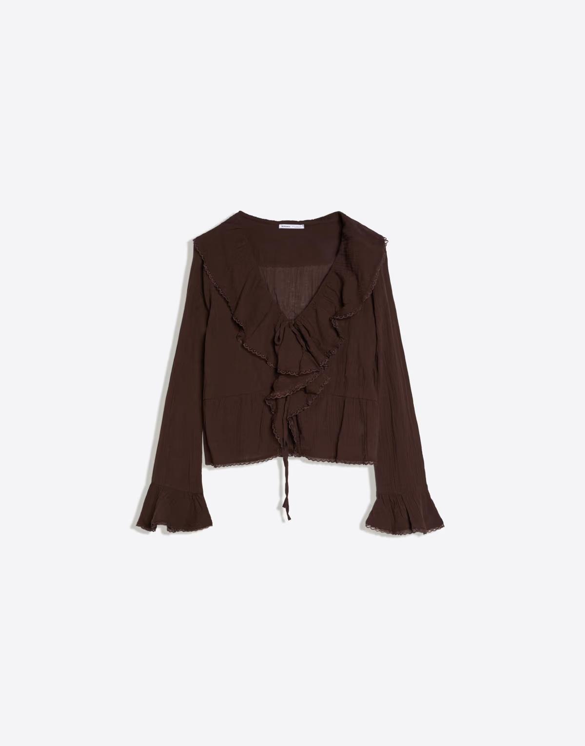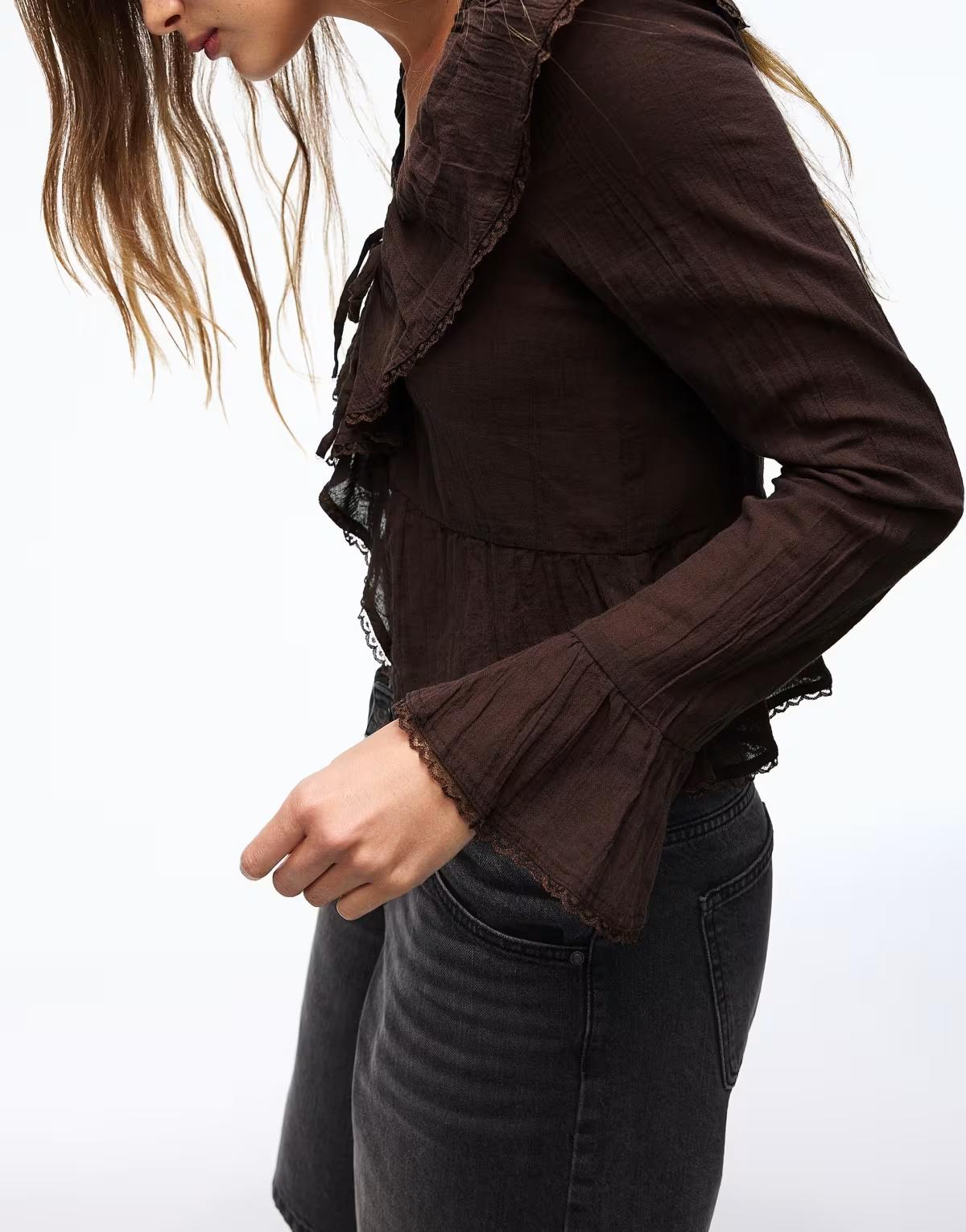 Bershka Rustic long sleeve ruffle blouse in brown