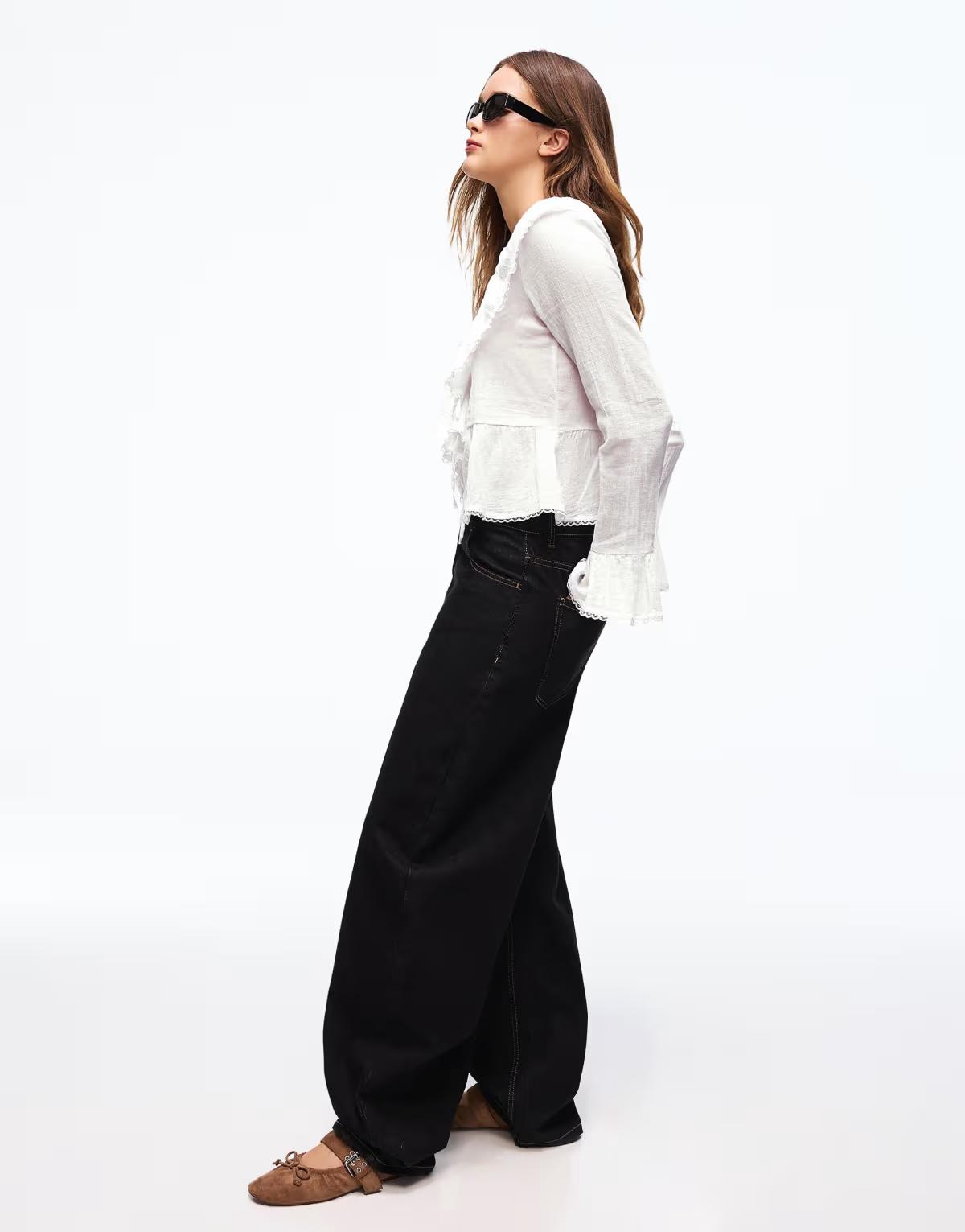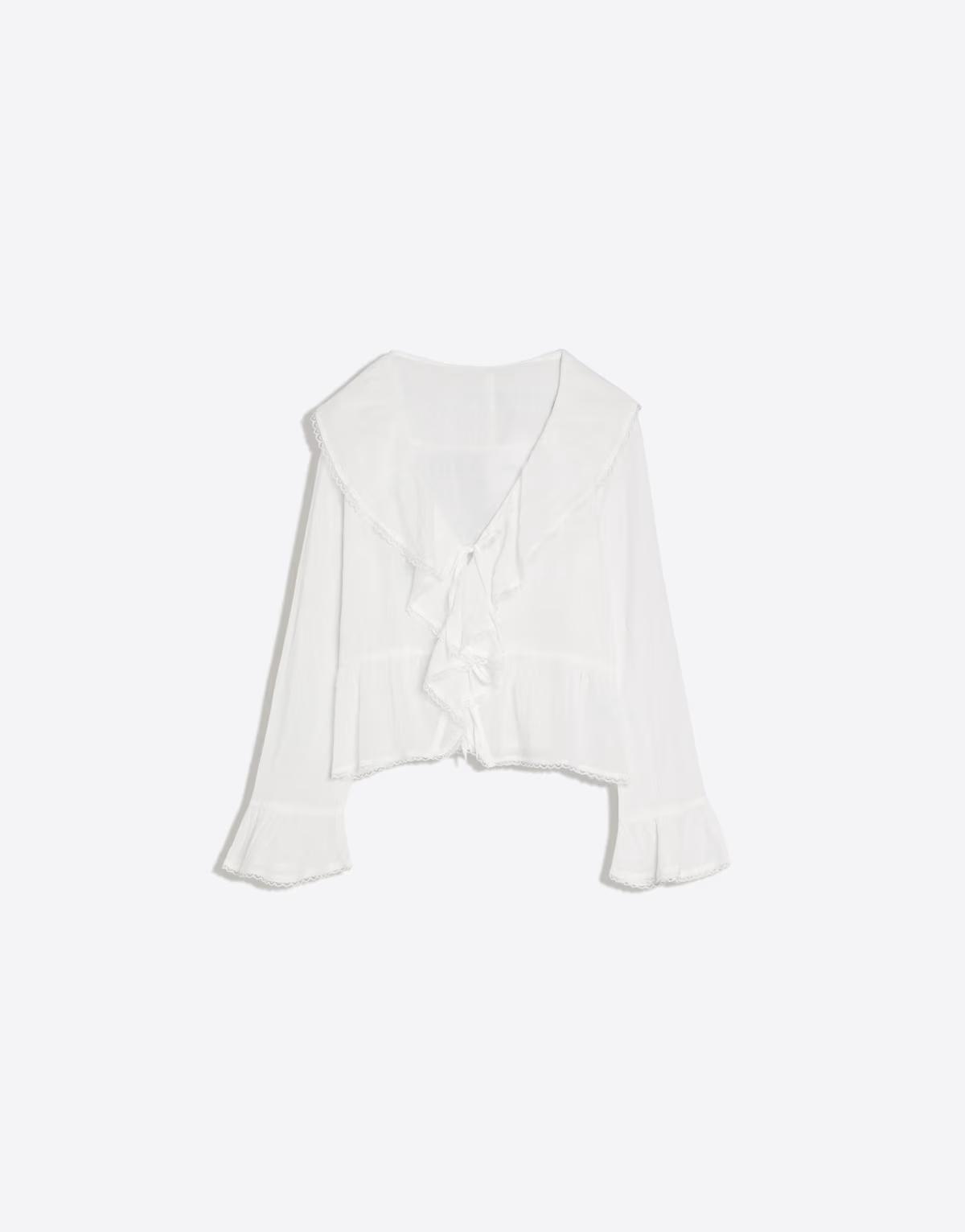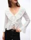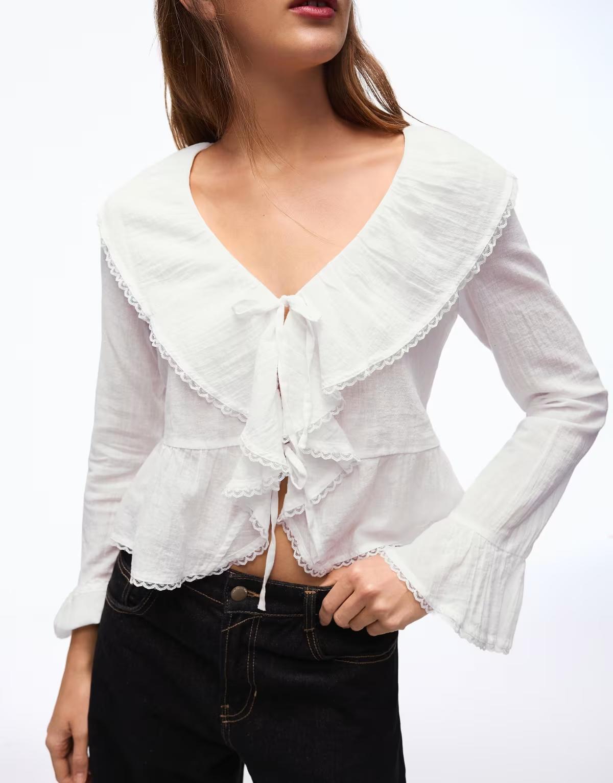 Bershka Rustic long sleeve ruffle blouse in white