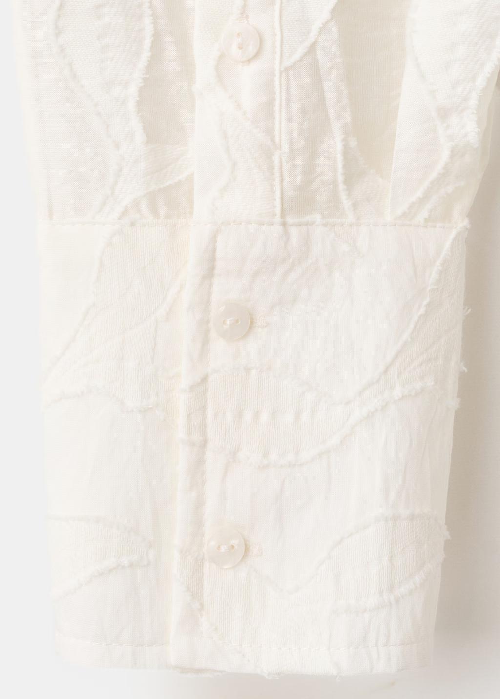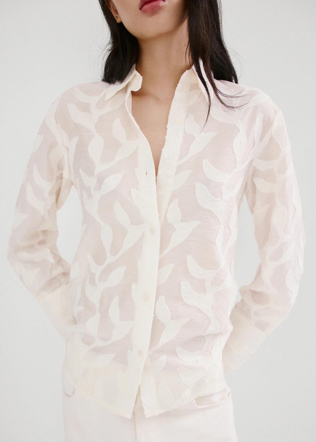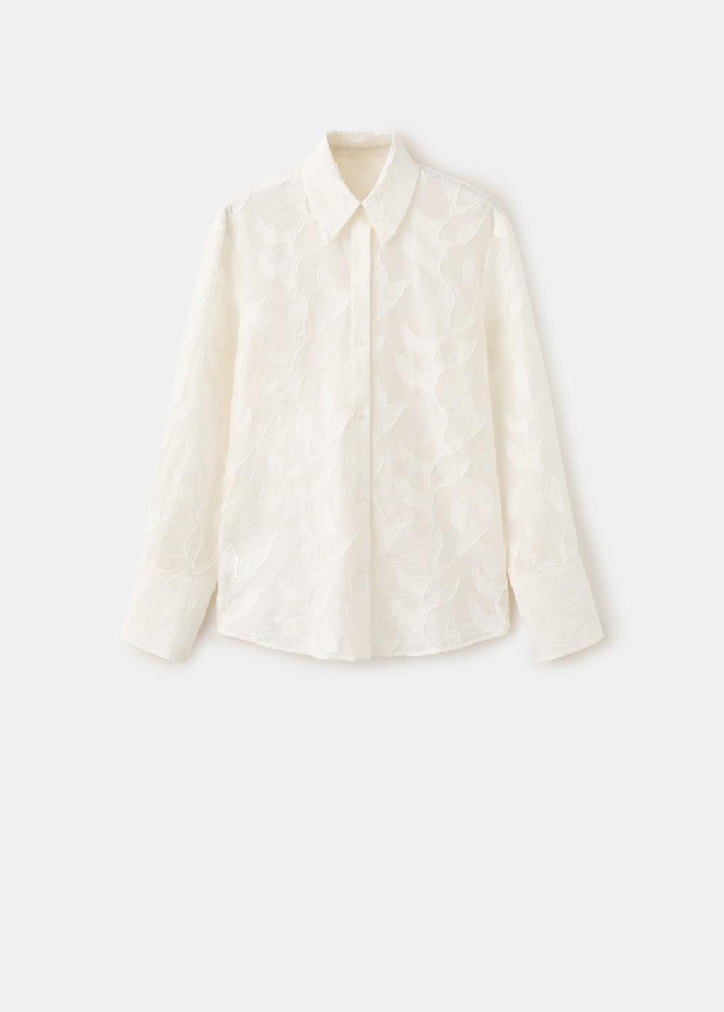 Diseño recto. Diseño bordado floral. Cuello camisero. Manga larga con puños abotonados. Cierre delantero con botones. Disponible Plus