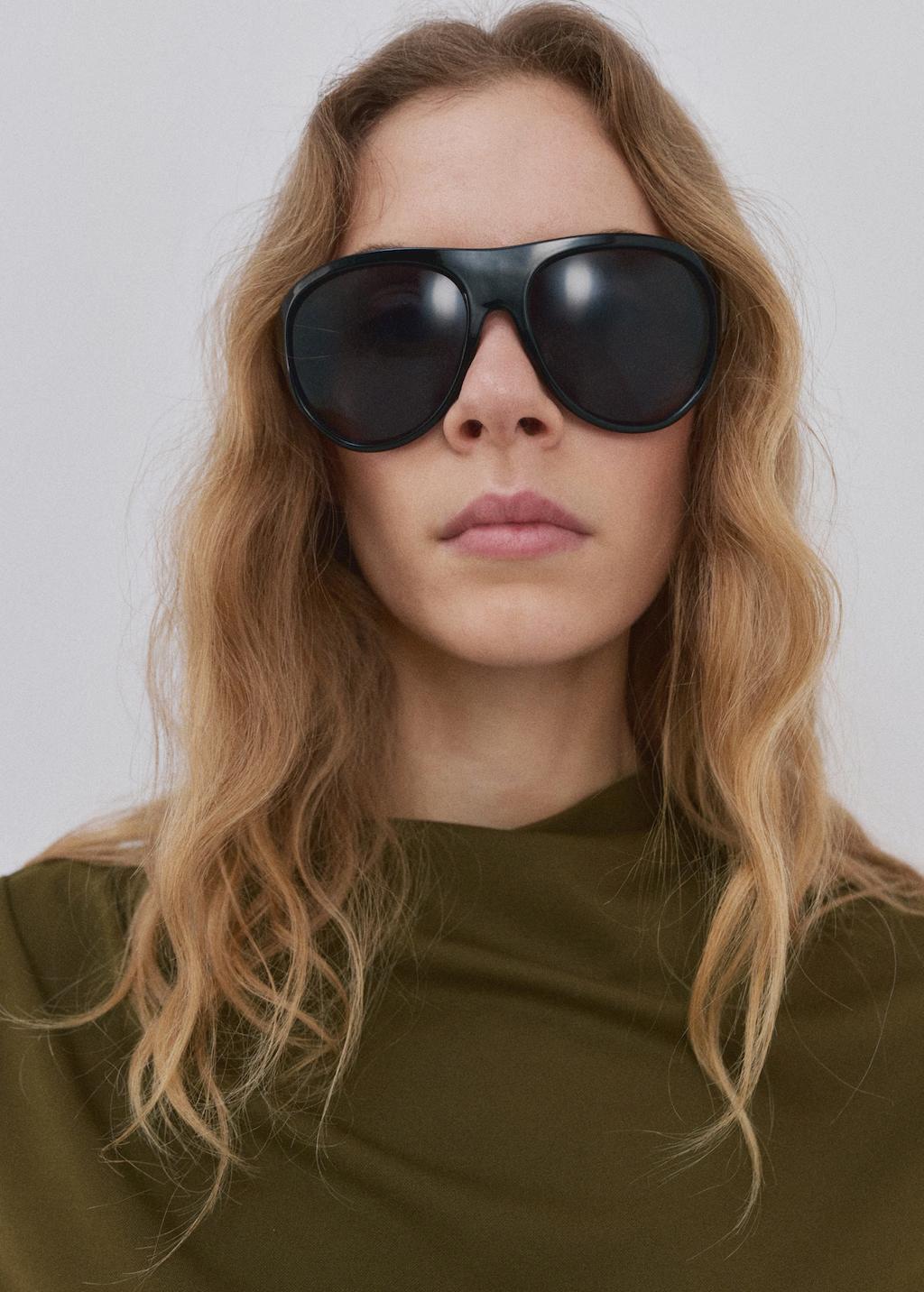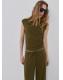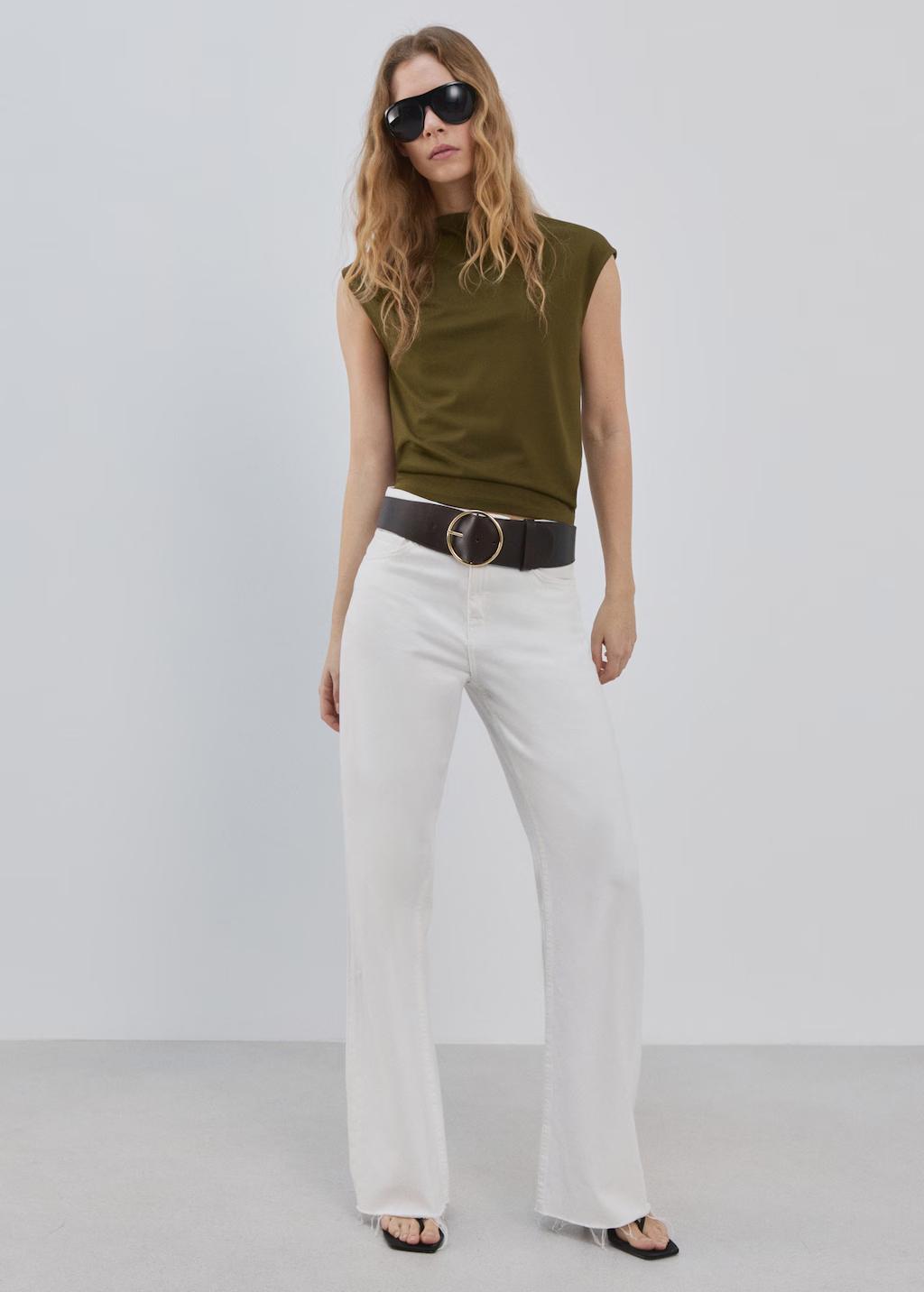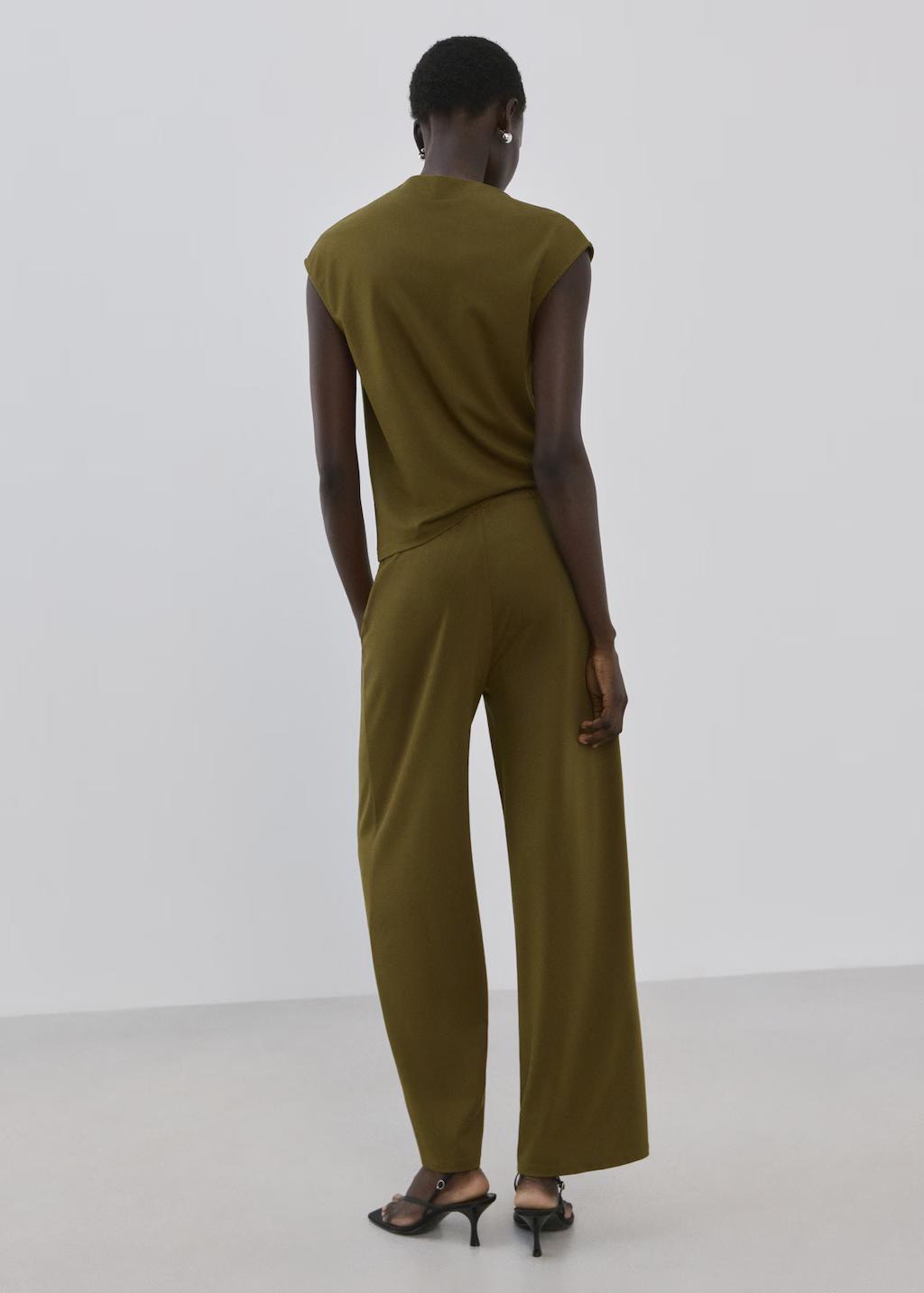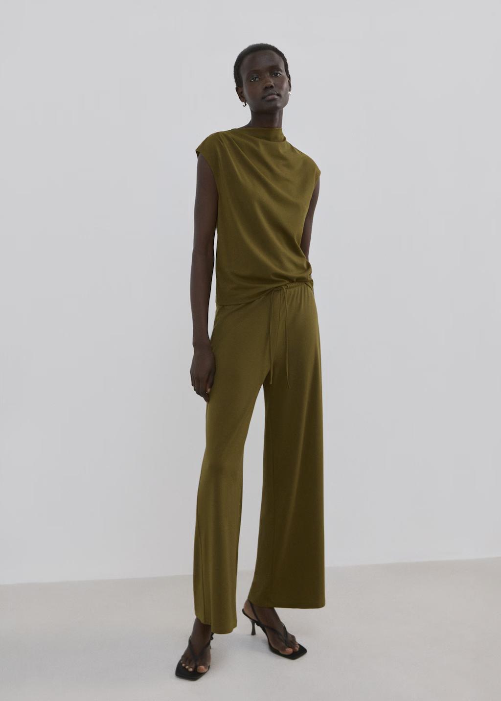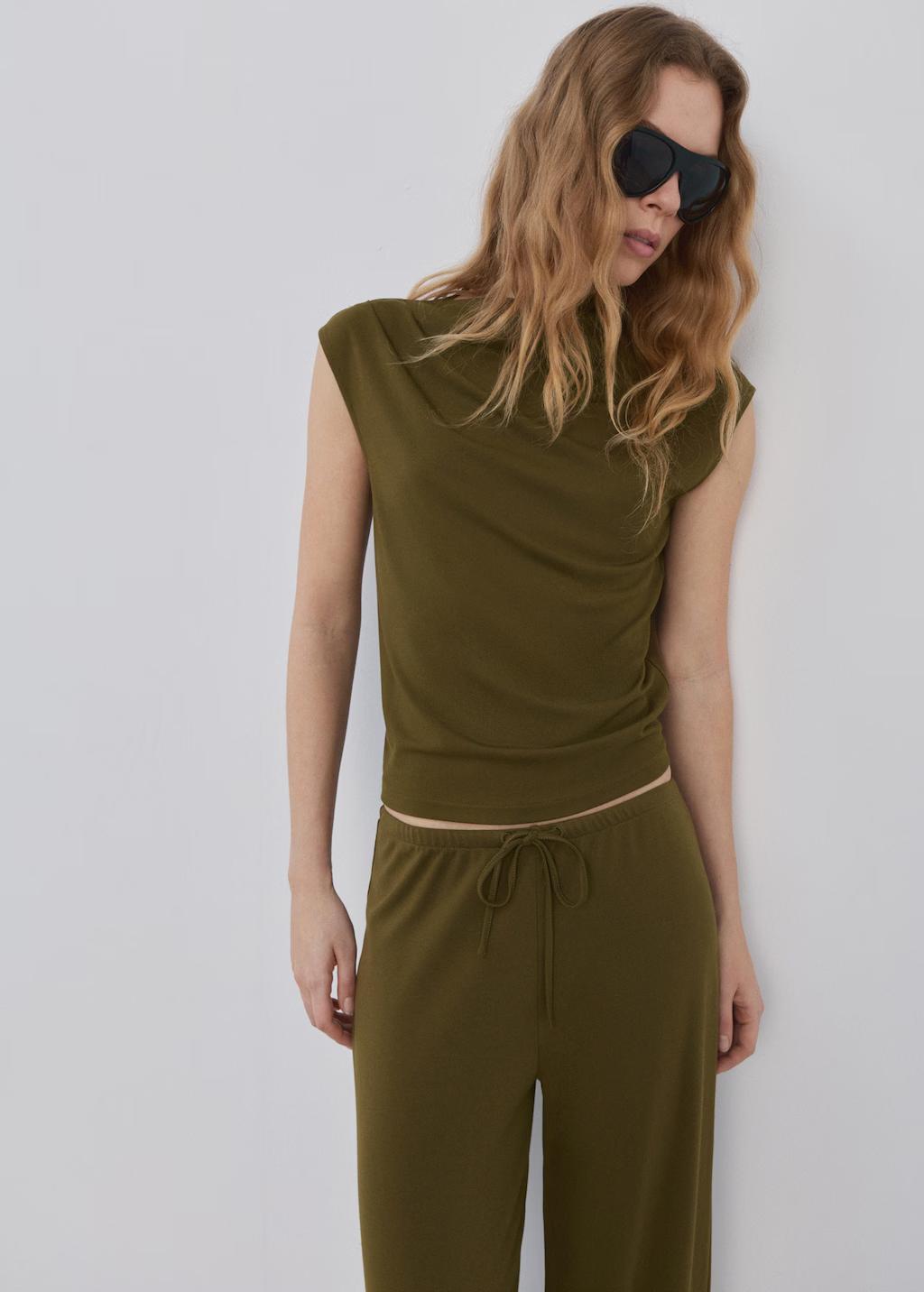 Tejido fluido. Diseño recto. Cuello asimétrico. Detalles fruncidos. Sin mangas. Total look