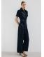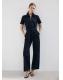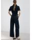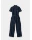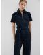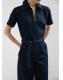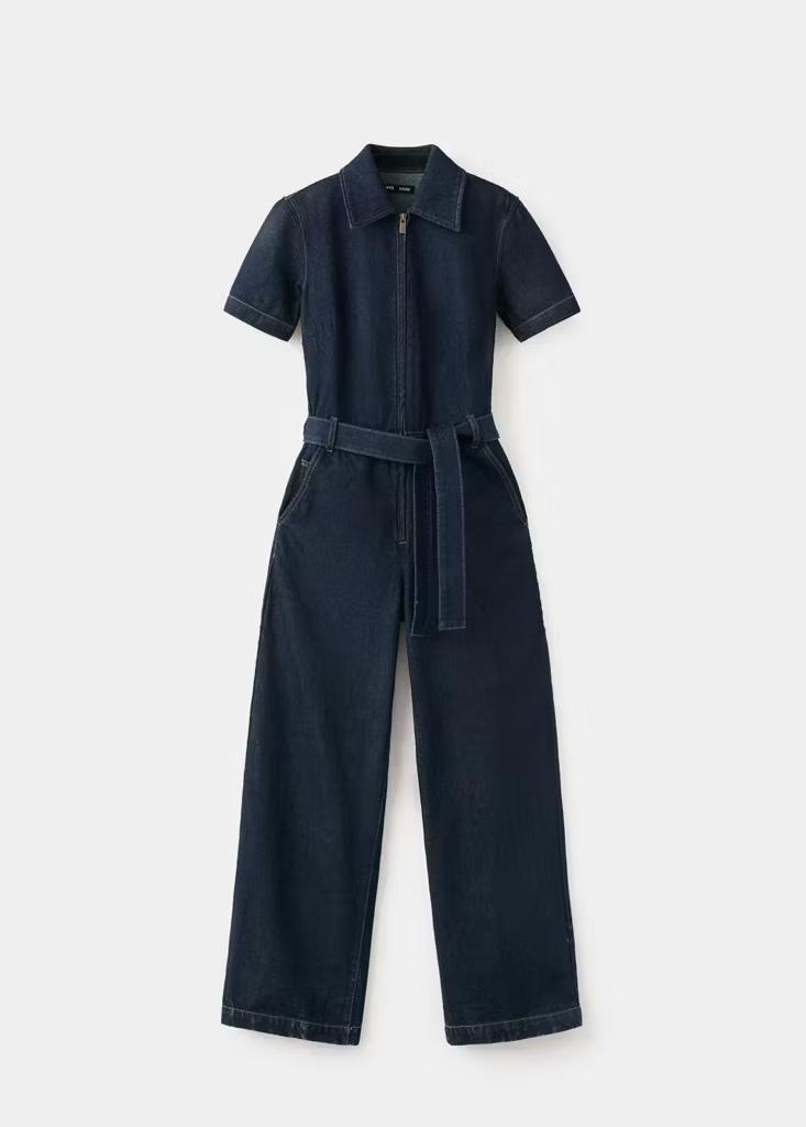 Tejido de algodón estilo tejano vaquero. Diseño largo. Diseño entallado. Cuello camisero. Manga corta. Detalle cinturón en la cintura. Cierre delantero con cremallera