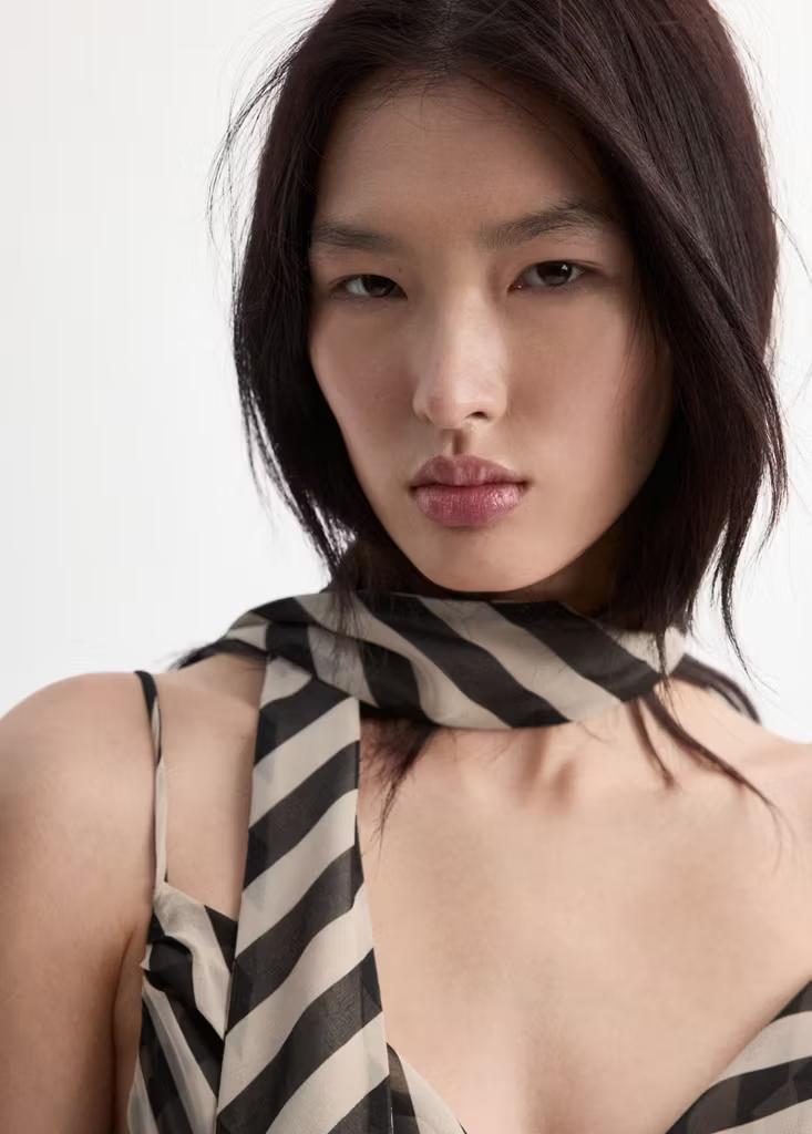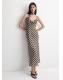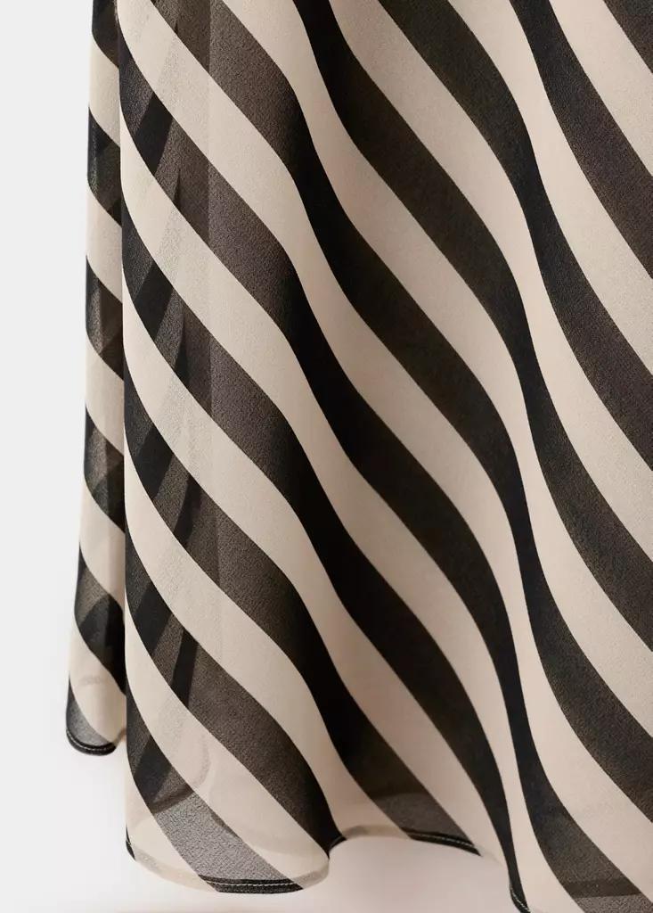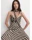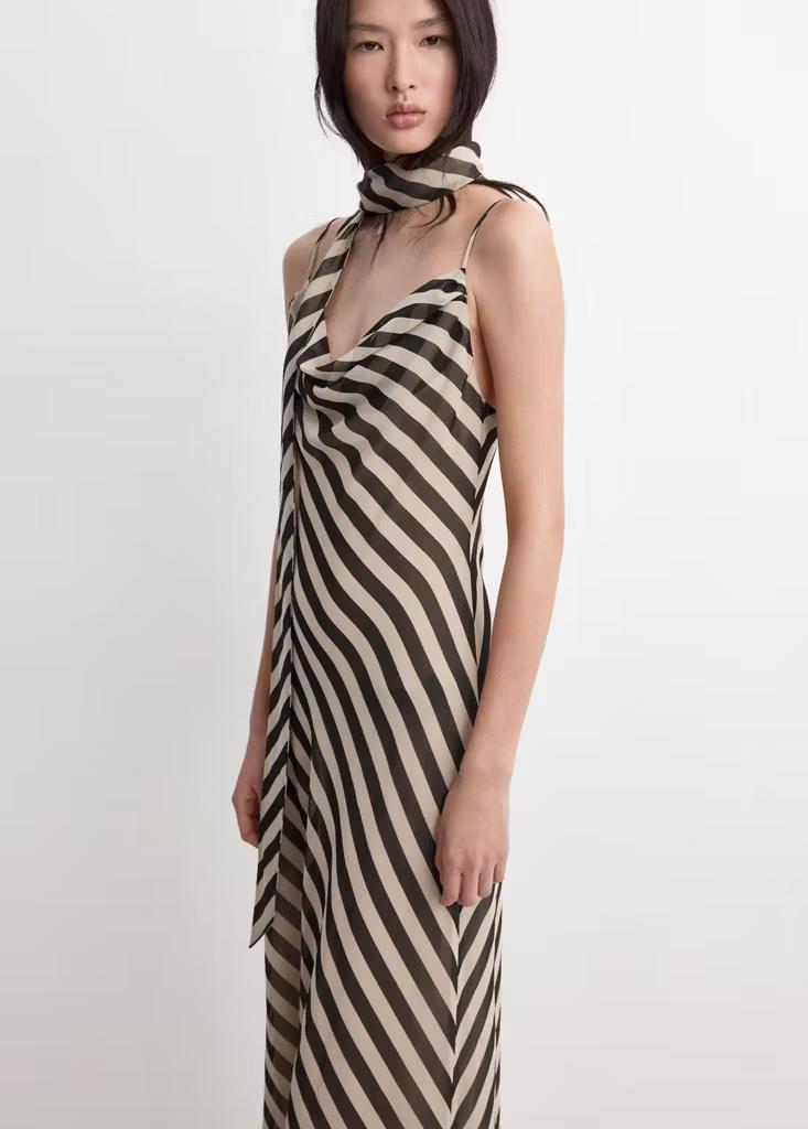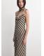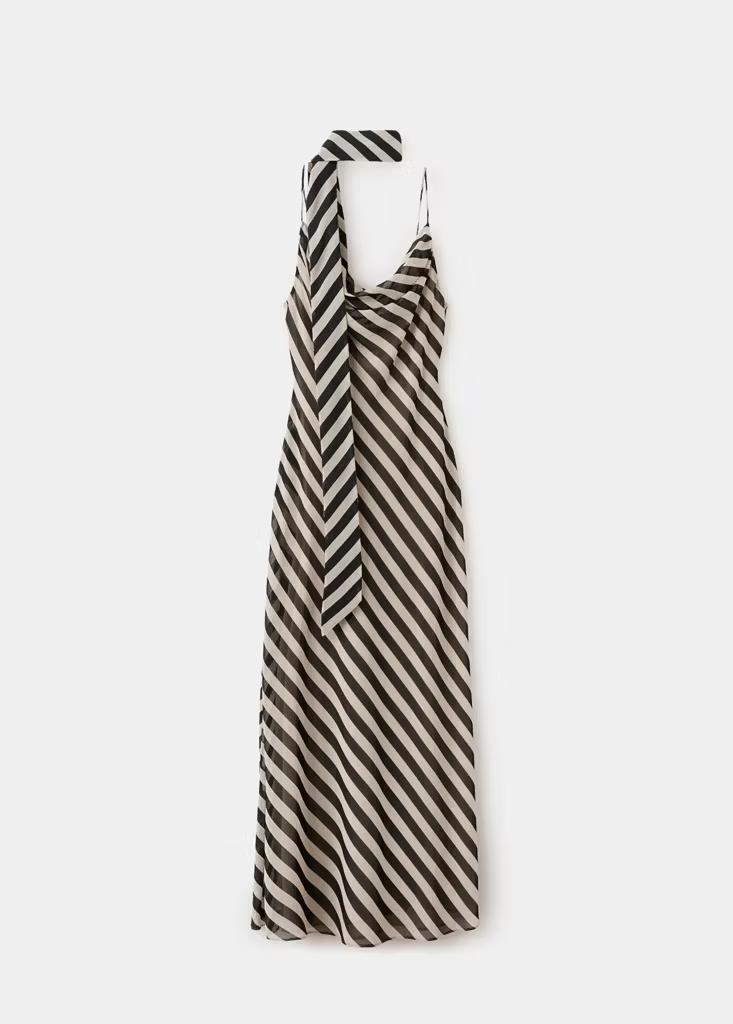 Diseño largo. Estampado Rayas. Adorno de fular en el cuello. Cuello drapeado. Sin mangas. Tirantes finos. Cierre de cremallera en la parte posterior. Esta prenda pertenece a nuestra colección de fiesta y evento, diseñada para elevar tus looks en ocasiones especiales