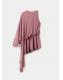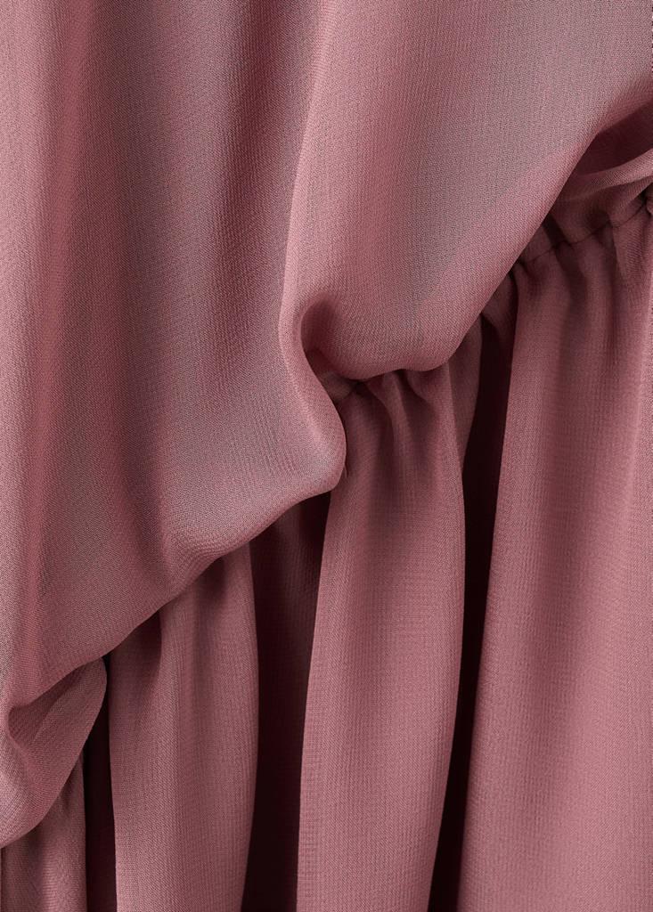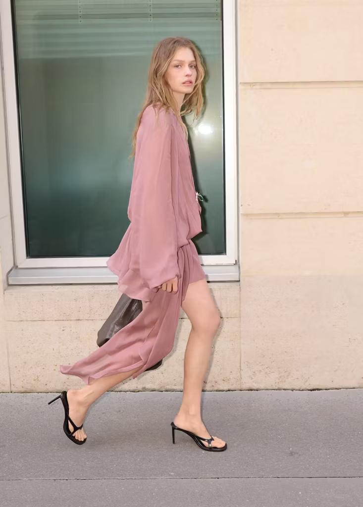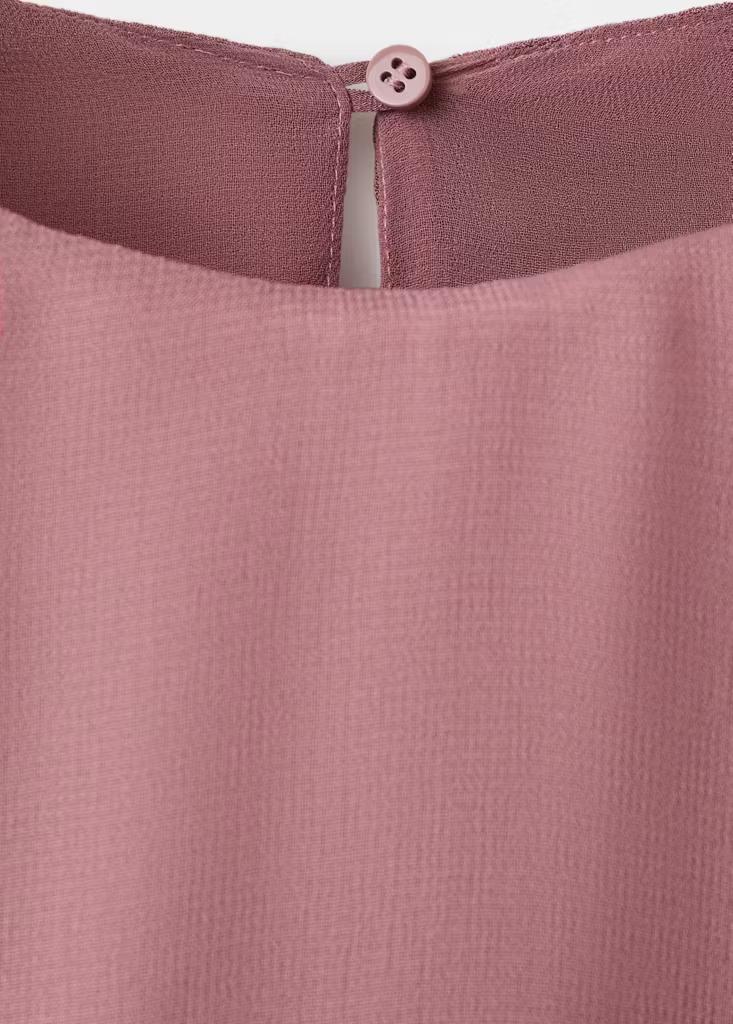 Diseño corto. Corte asimétrico. Cintura fruncida. Manga asimétrica. Manga fluida. Cierre de botones en el cuello