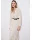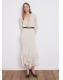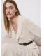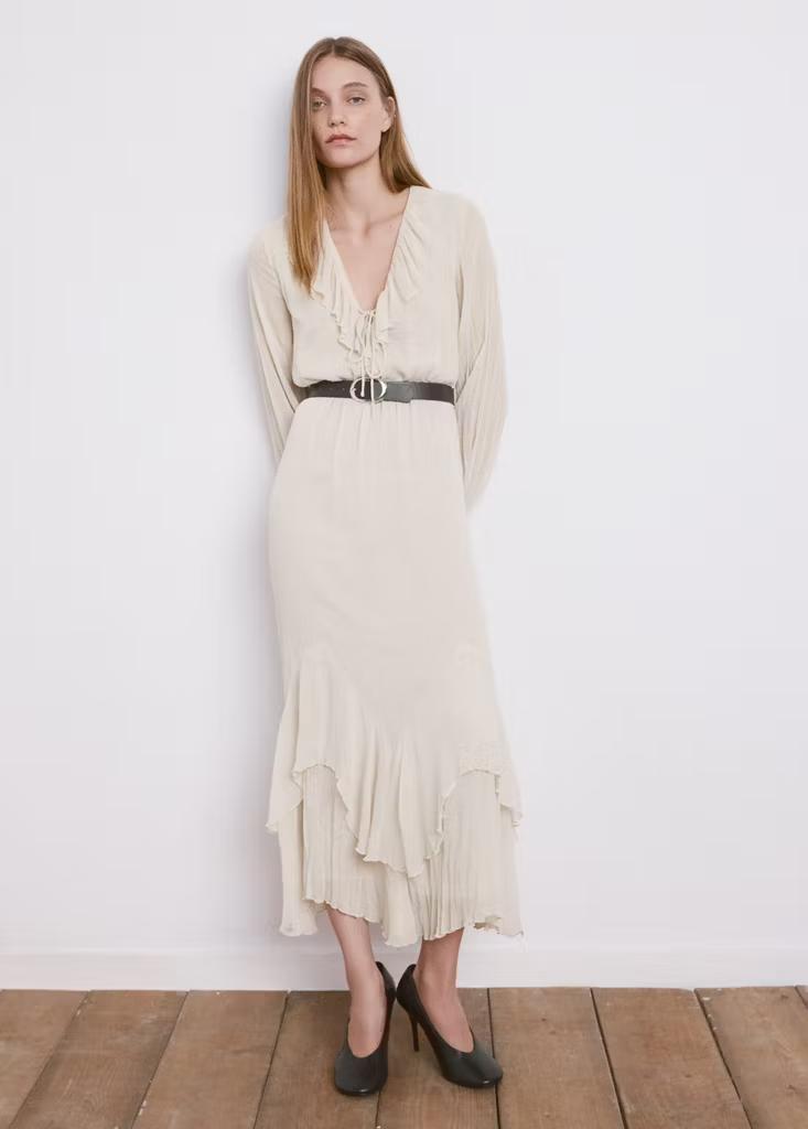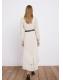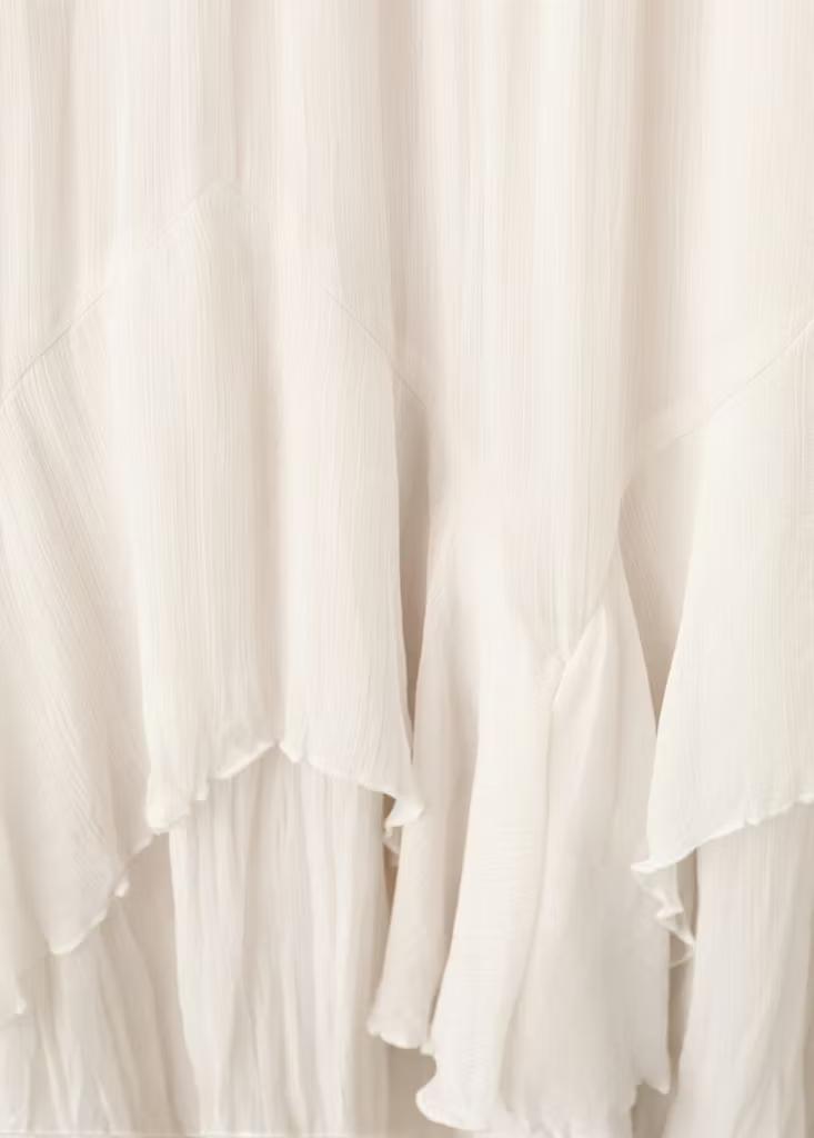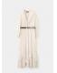 Diseño largo. Diseño evasé. Detalle de volantes. Cuello pico. Manga larga. Cierre de lazo en la parte delantera. Bajo con volante. Forro interior