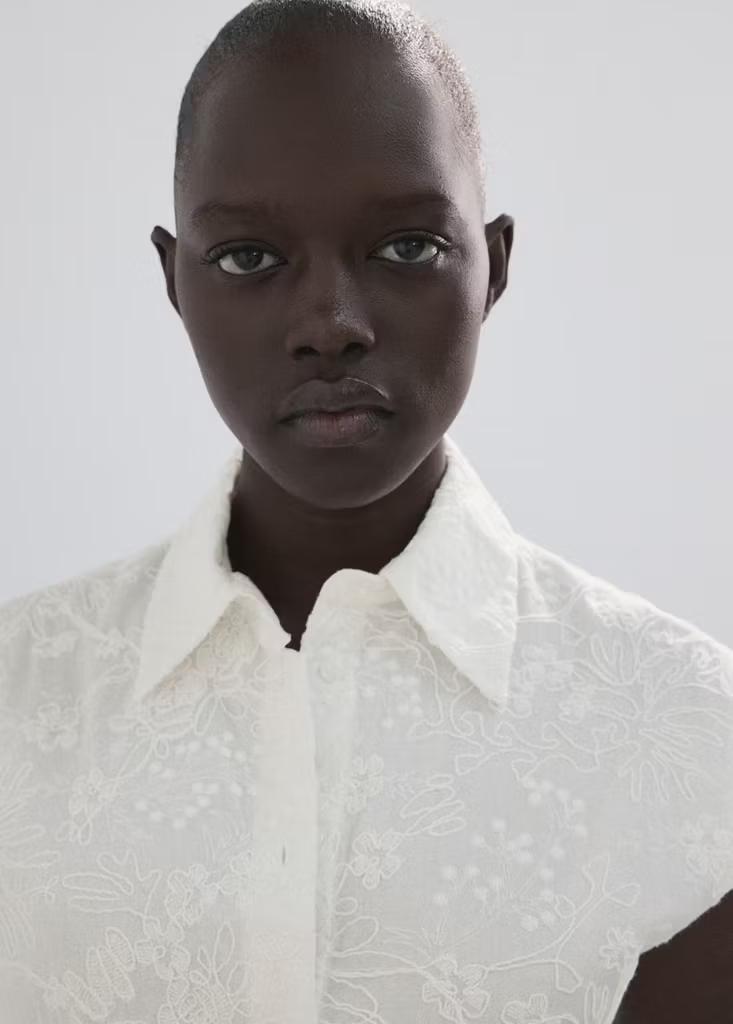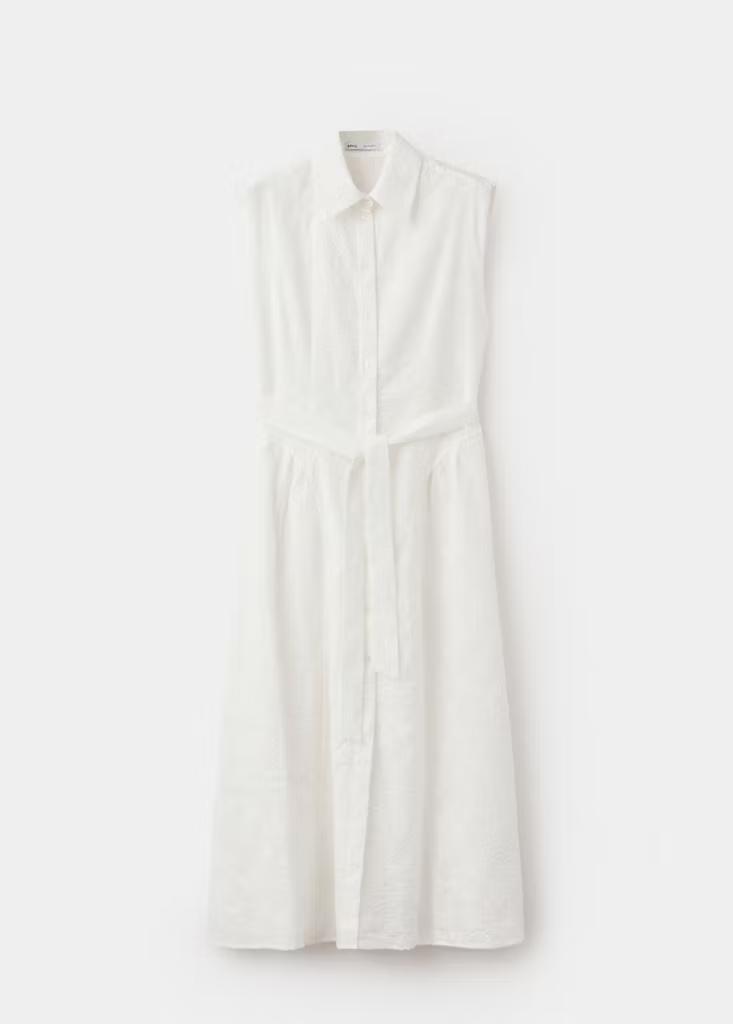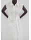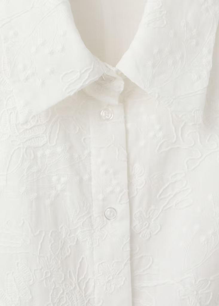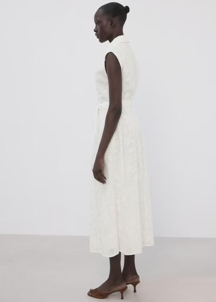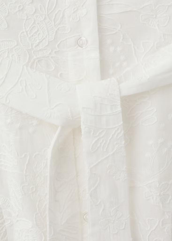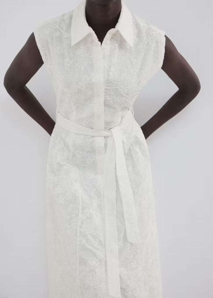 Tejido 100% algodón. Diseño bordado floral. Silueta Evase. Cuello camisero. Largo Midi. Cierre de botones. Cinturón tipo batín. Forro interior 100% algodón