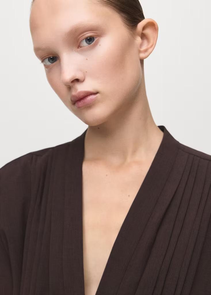 Diseño recto. Diseño largo. Diseño crop. Diseño plisado. Cuello pico. Manga corta. Cinturón tipo lazo en la cintura. Cierre de cremallera lateral. Forro interior de algodón. Exclusivo Online