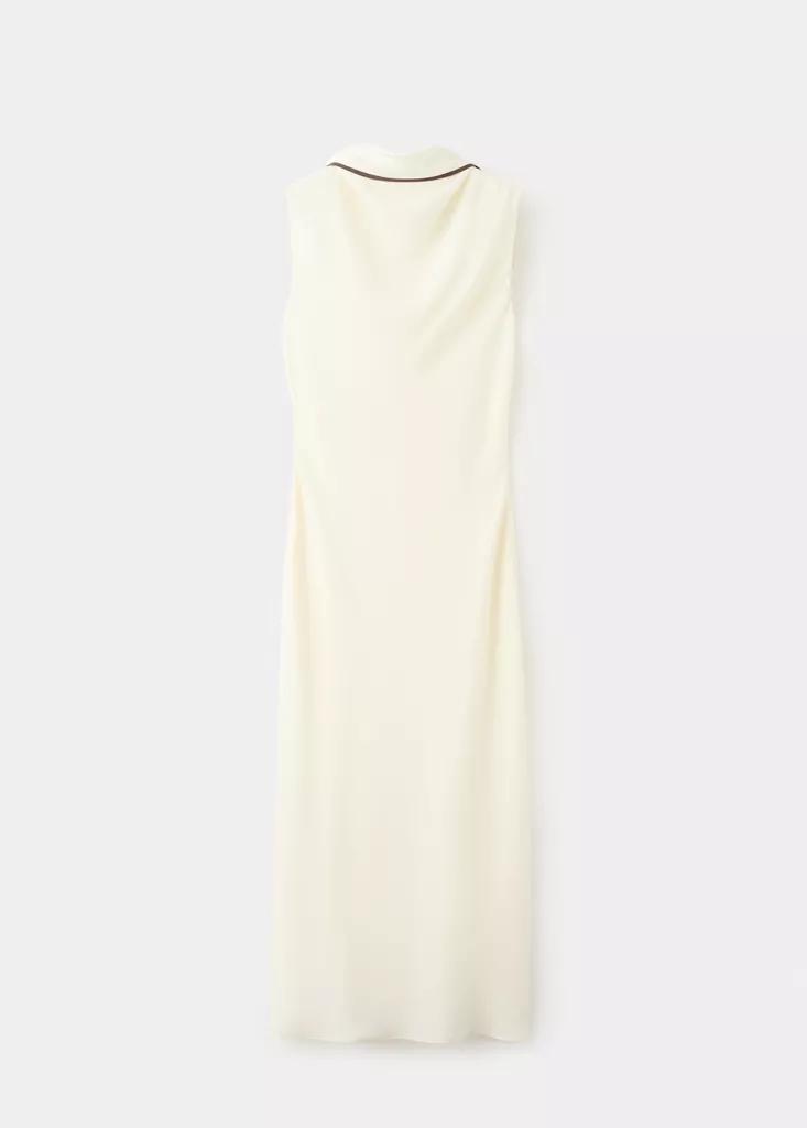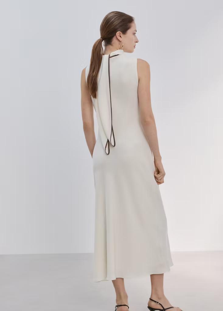 Diseño entallado. Diseño largo. Pañuelo en el cuello. Sin mangas. Tirante ancho. Cierre de lazo en la parte posterior. Cierre de botón. Forro interior