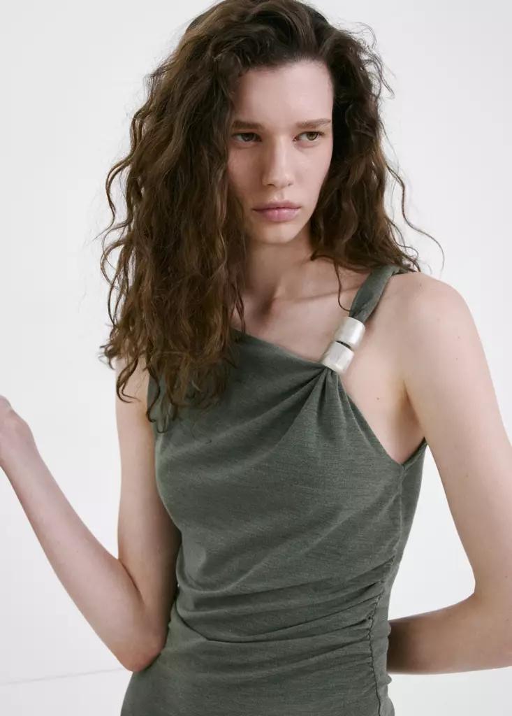 Diseño largo. Diseño entallado. Diseño asimétrico. Detalle metálico. Sin mangas. Sin cierre