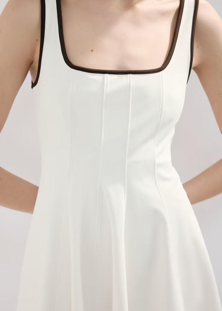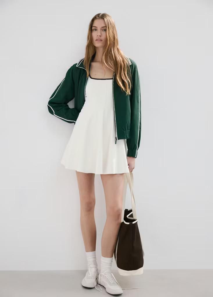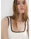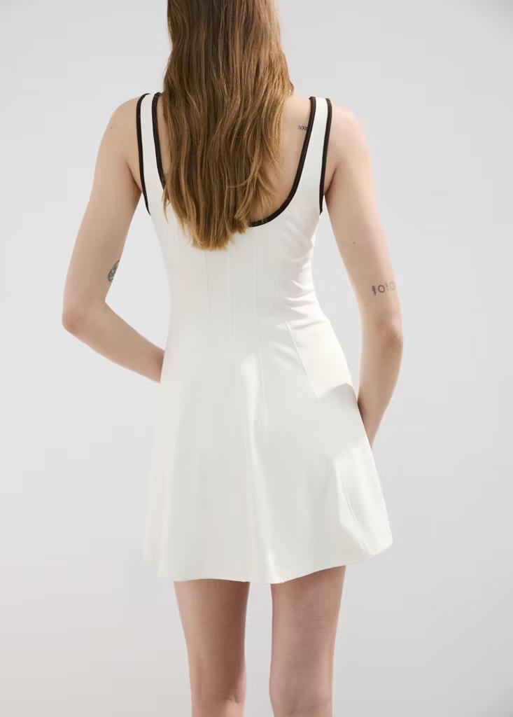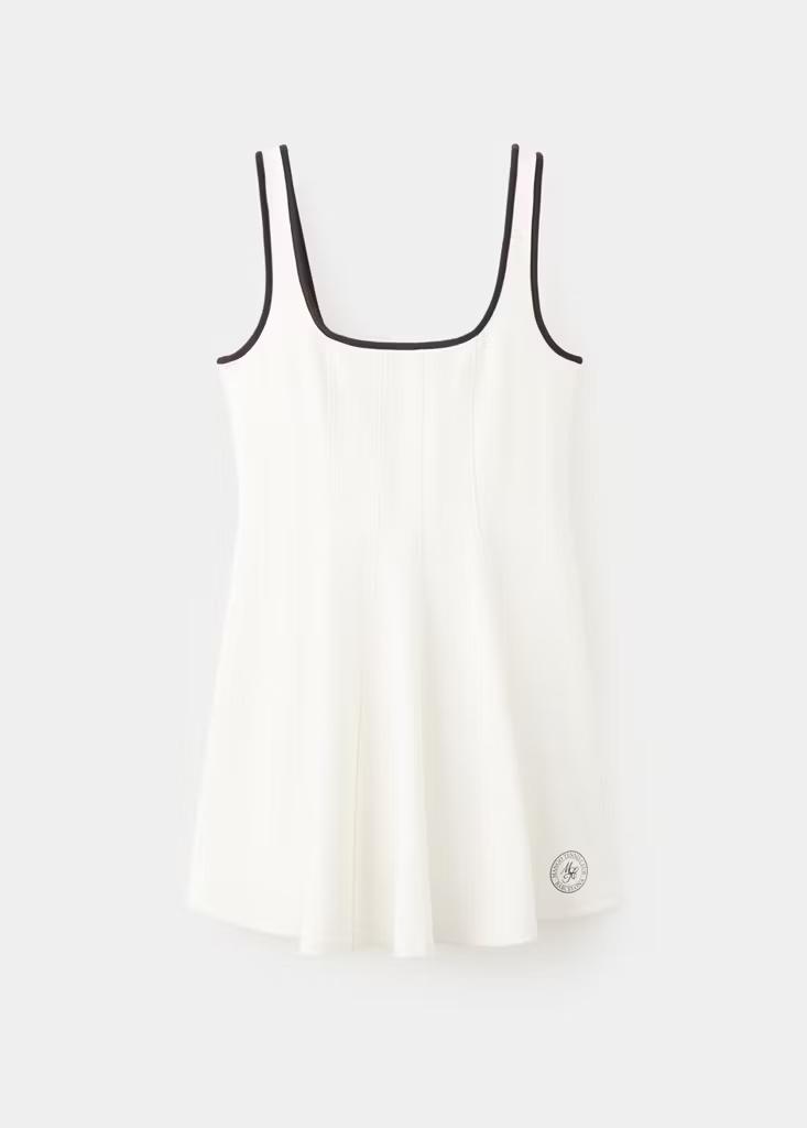 Tejido fluido. Diseño recto. Diseño corto. Cuello recto. Tirantes finos. Tirantes en contraste. Detalle estampado en el bajo. Con forro interior. Exclusivo Online. Colección Godó. Como homenaje a uno de los deportes más sociales, y celebrando nuestro patrocinio del Barcelona Open Banc Sabadell 73º Trofeo Conde de Godó, lanzamos una colección de prendas seleccionadas que representan el lado más sofisticado del tenis con detalles retro