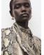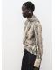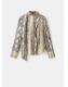 Con diseño recto y estampado animal print, esta prenda presenta un cuello perkins con adorno de fular. Las mangas largas tienen puños abotonados y el cierre de botones se encuentra en la parte posterior