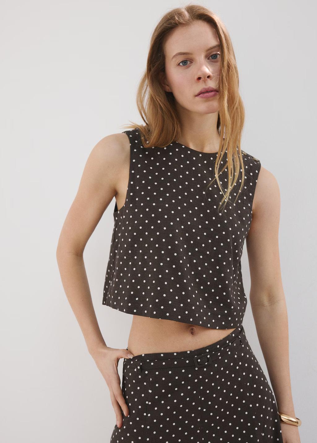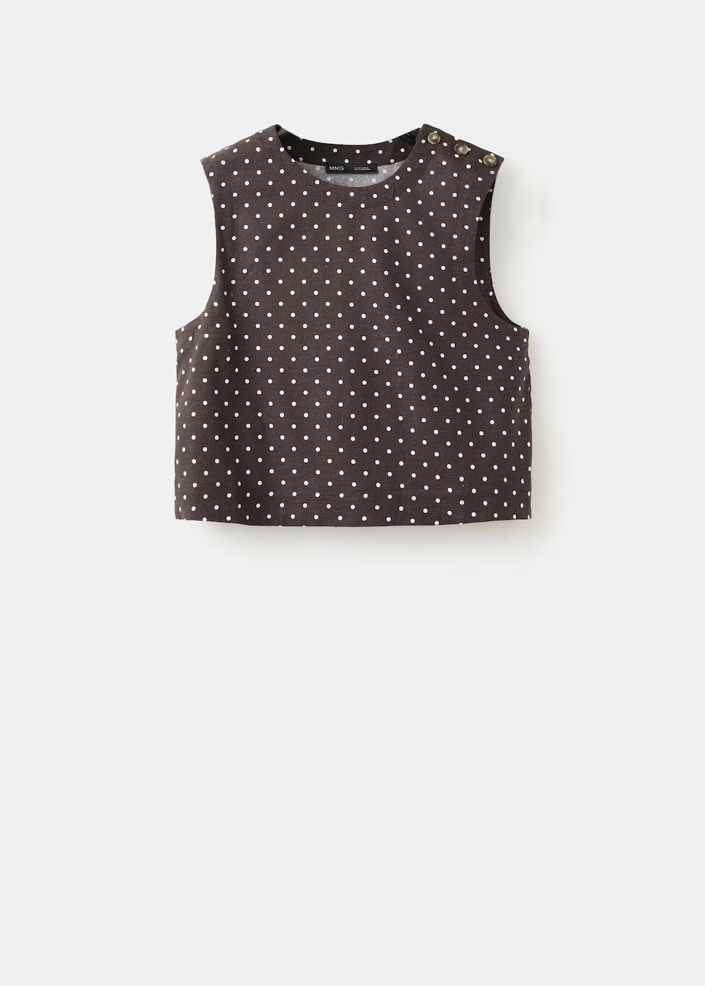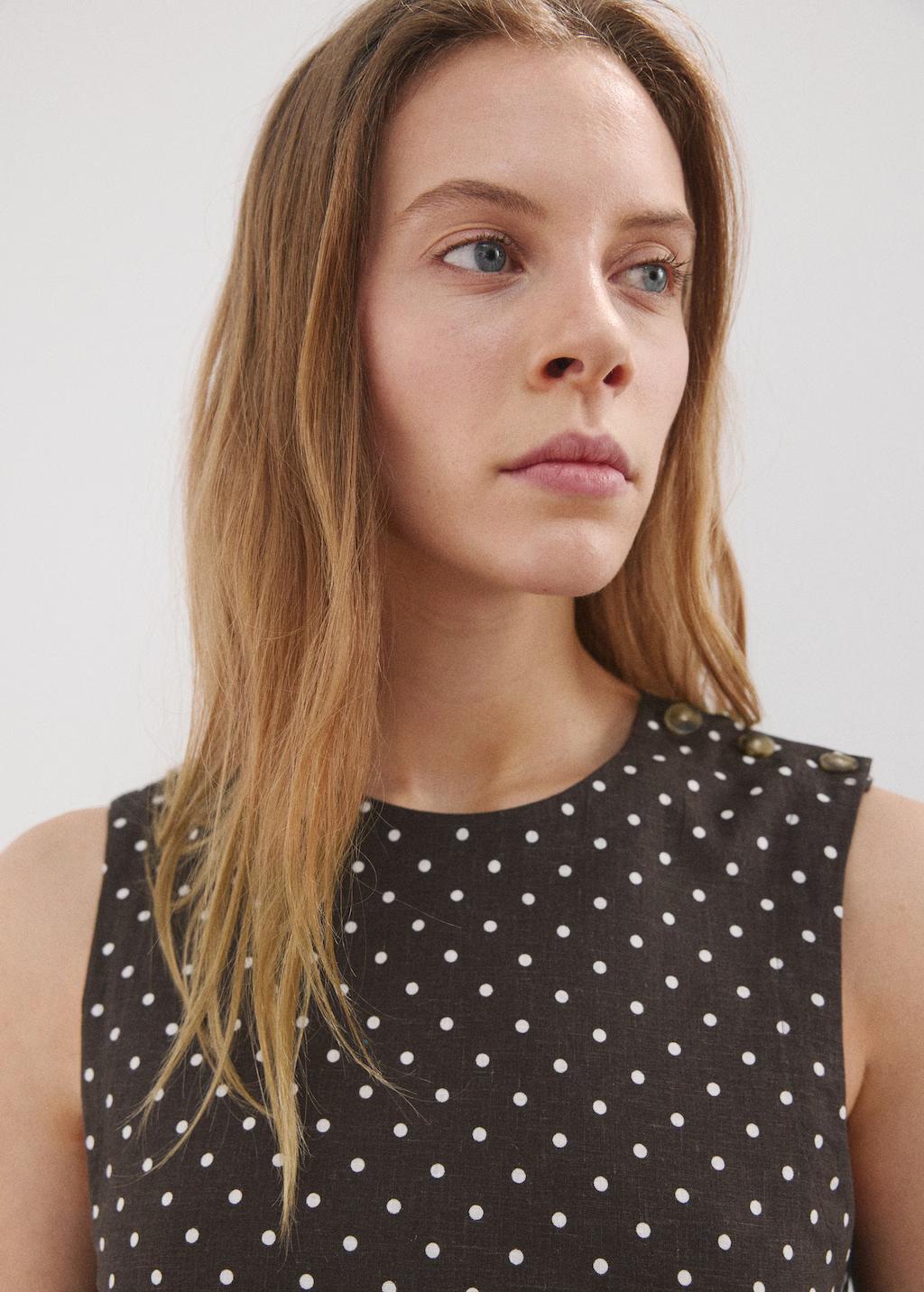 Tejido mezcla de lino. Diseño recto. Diseño crop. Estampado de lunares. Cuello redondo. Sin mangas. Tirantes anchos. Cierre de botones en el hombro. Total look