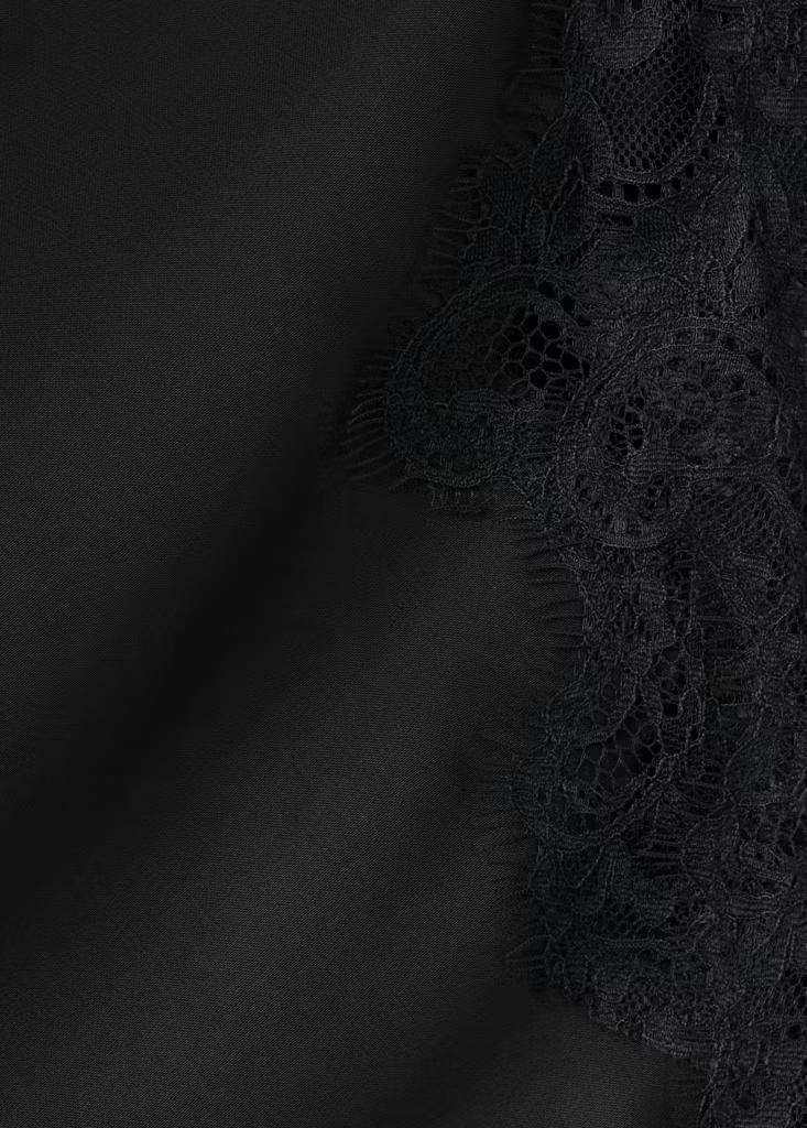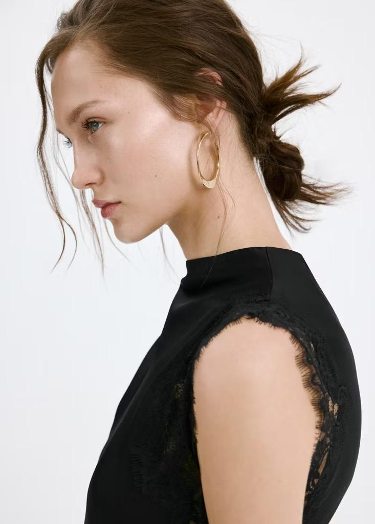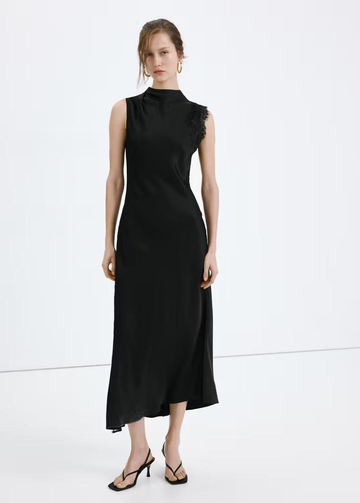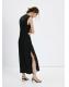 Tejido fluido con acabado satinado. Detalles encaje. Corte slim. Diseño largo. Cuello redondo. Escote drapeado. Sin mangas. Abertura lateral. Cierre de botones en el cuello. Esta prenda pertenece a nuestra colección de fiesta y evento, diseñada para elevar tus looks en ocasiones especiales