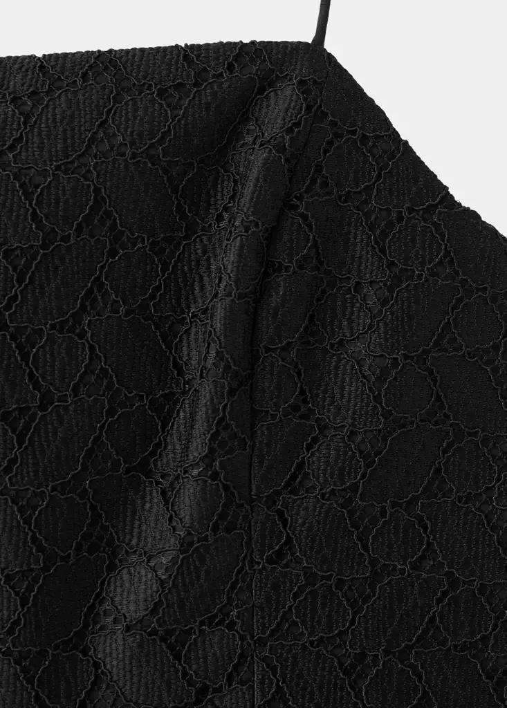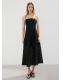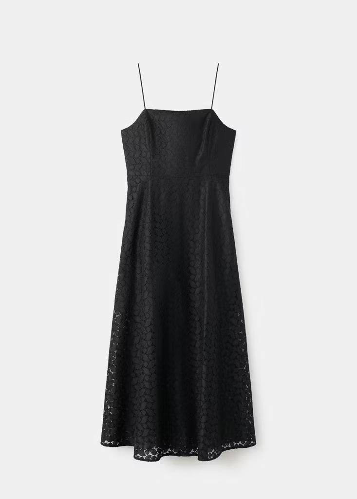 Diseño midi. Diseño evasé. Detalles calados. Sin mangas. Tirantes finos. Cierre trasero. Forro interior