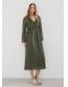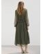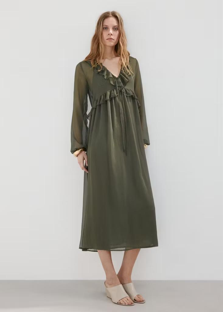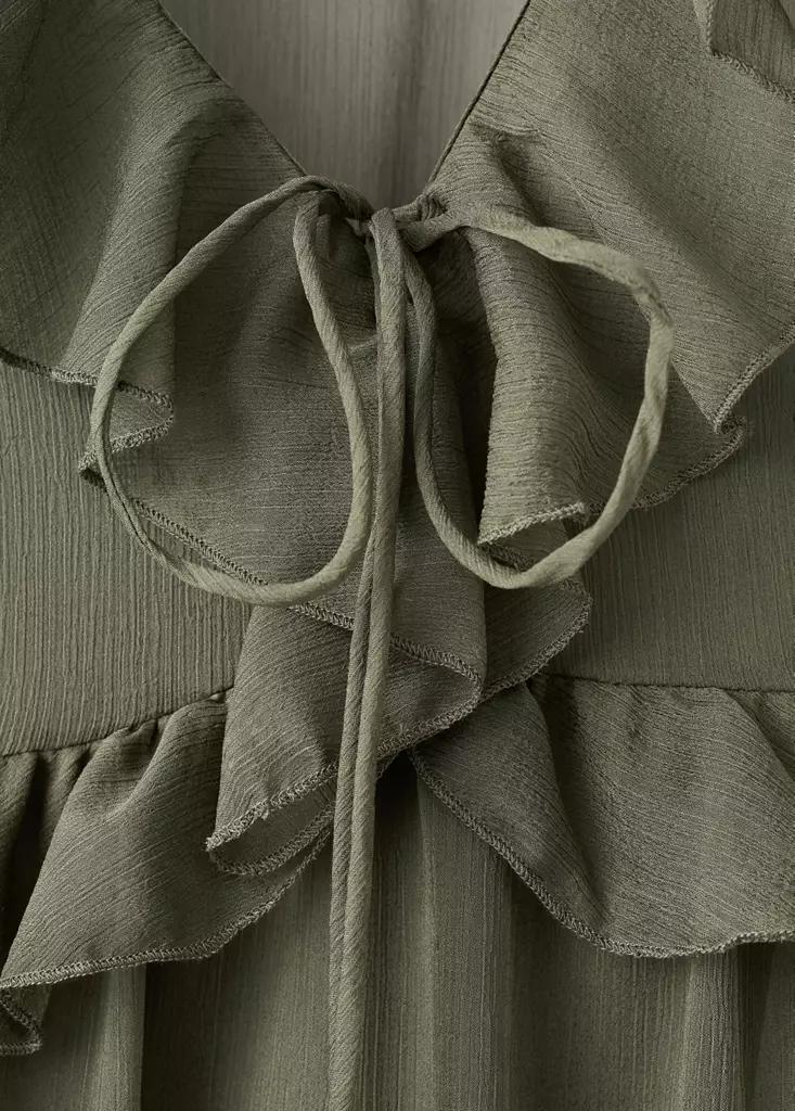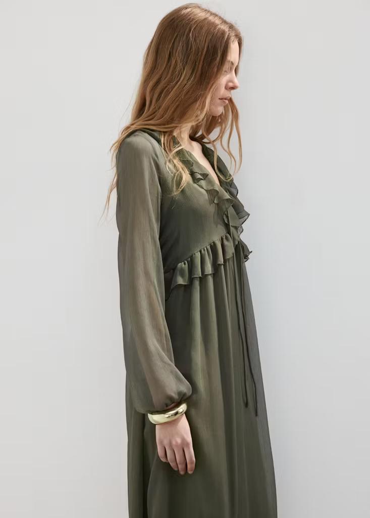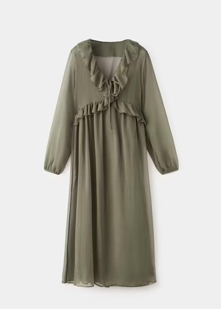 Tejido fluido. Diseño evasé. Diseño largo. Escote de pico. Manga larga con puños elásticos. Detalle de volantes en el cuello. Detalle de volantes en el bajo